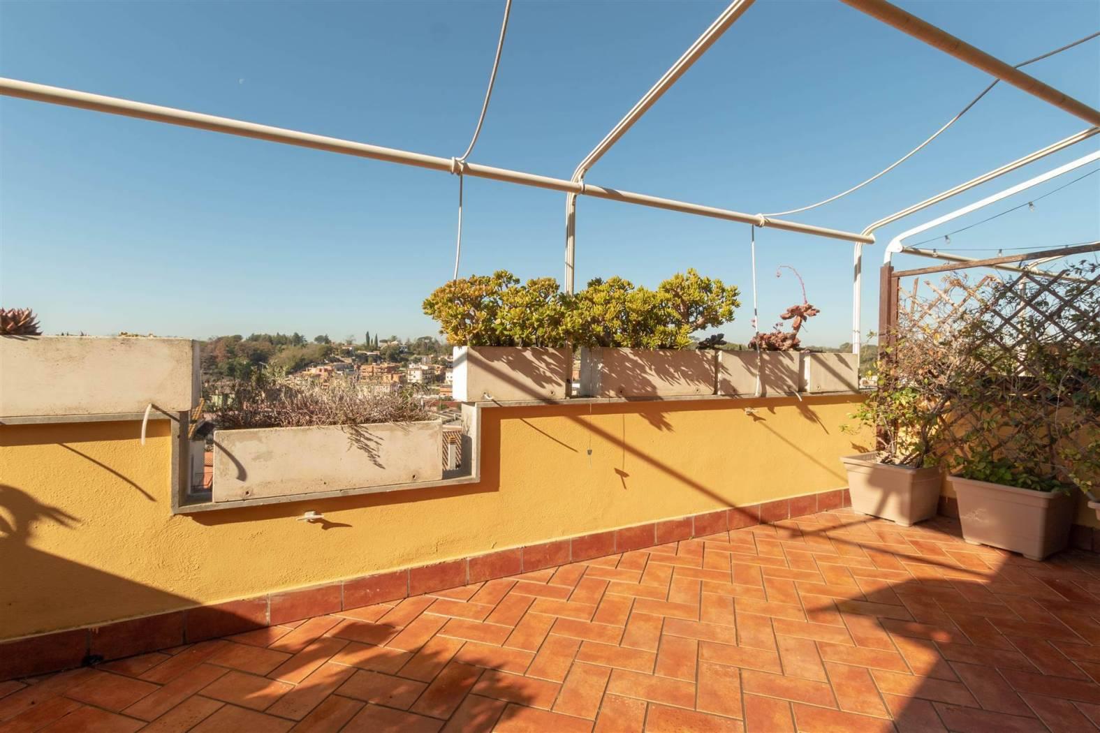 Balcone e ampio terrazzo di 20 mq, già dotato di tende: uno spazio da vivere tutto l'anno