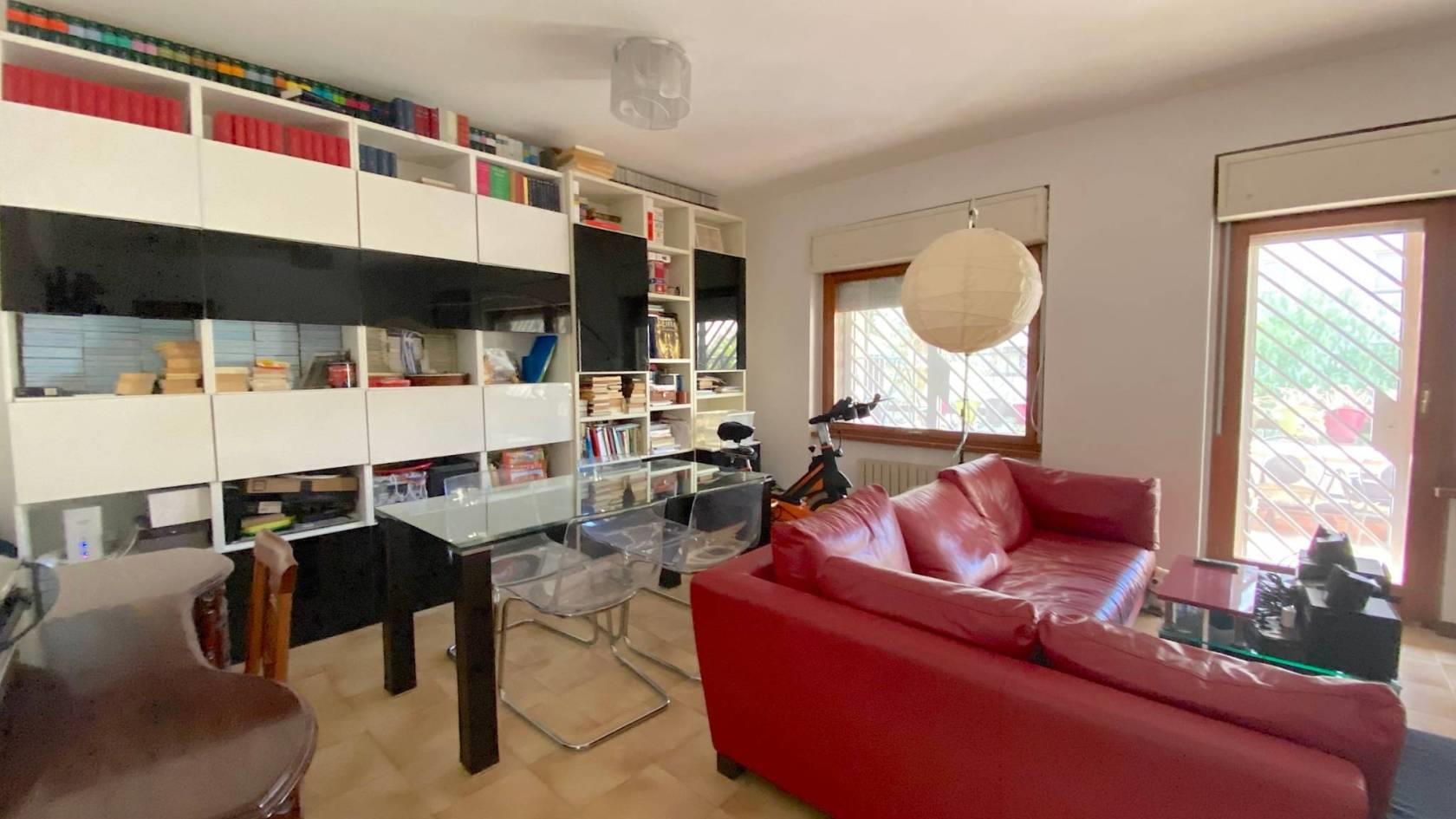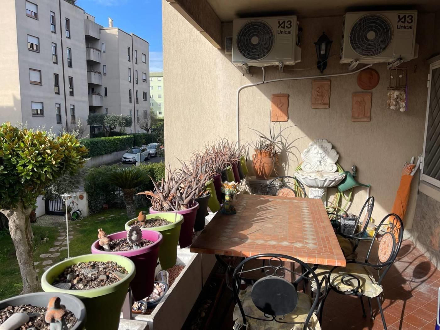 Dal salone si accede ad un terrazzo vivibile arredato con tavolo e sedie. Un balcone è a servizio della cucina.