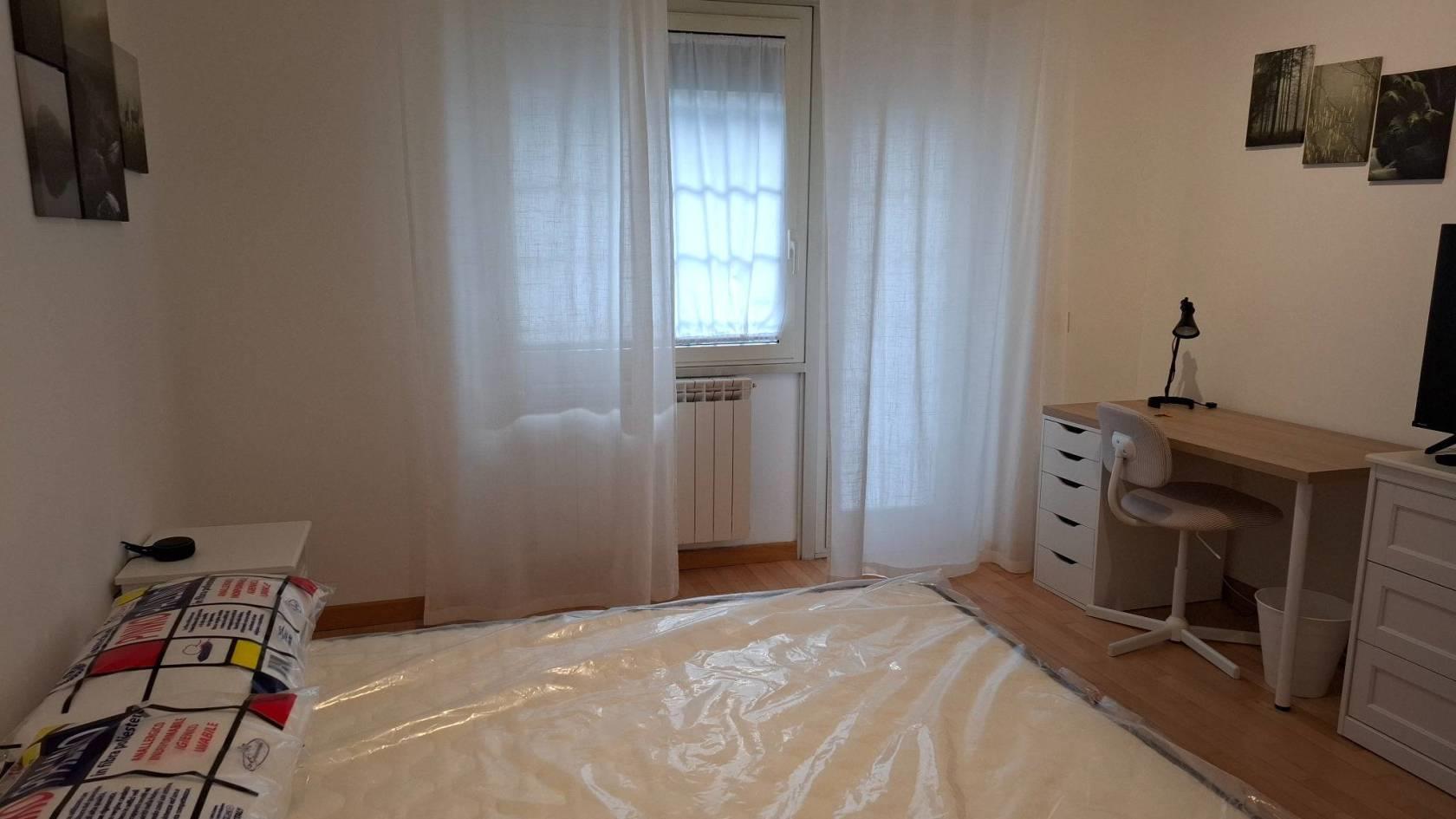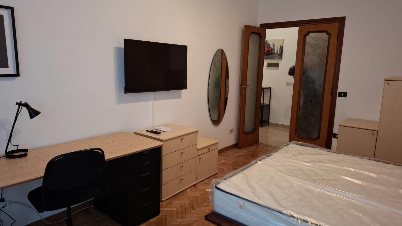 La camera dispone di letto matrimoniale (uso singola), armadio, scrivania con sedia, libreria, cassettiera, smart TV.