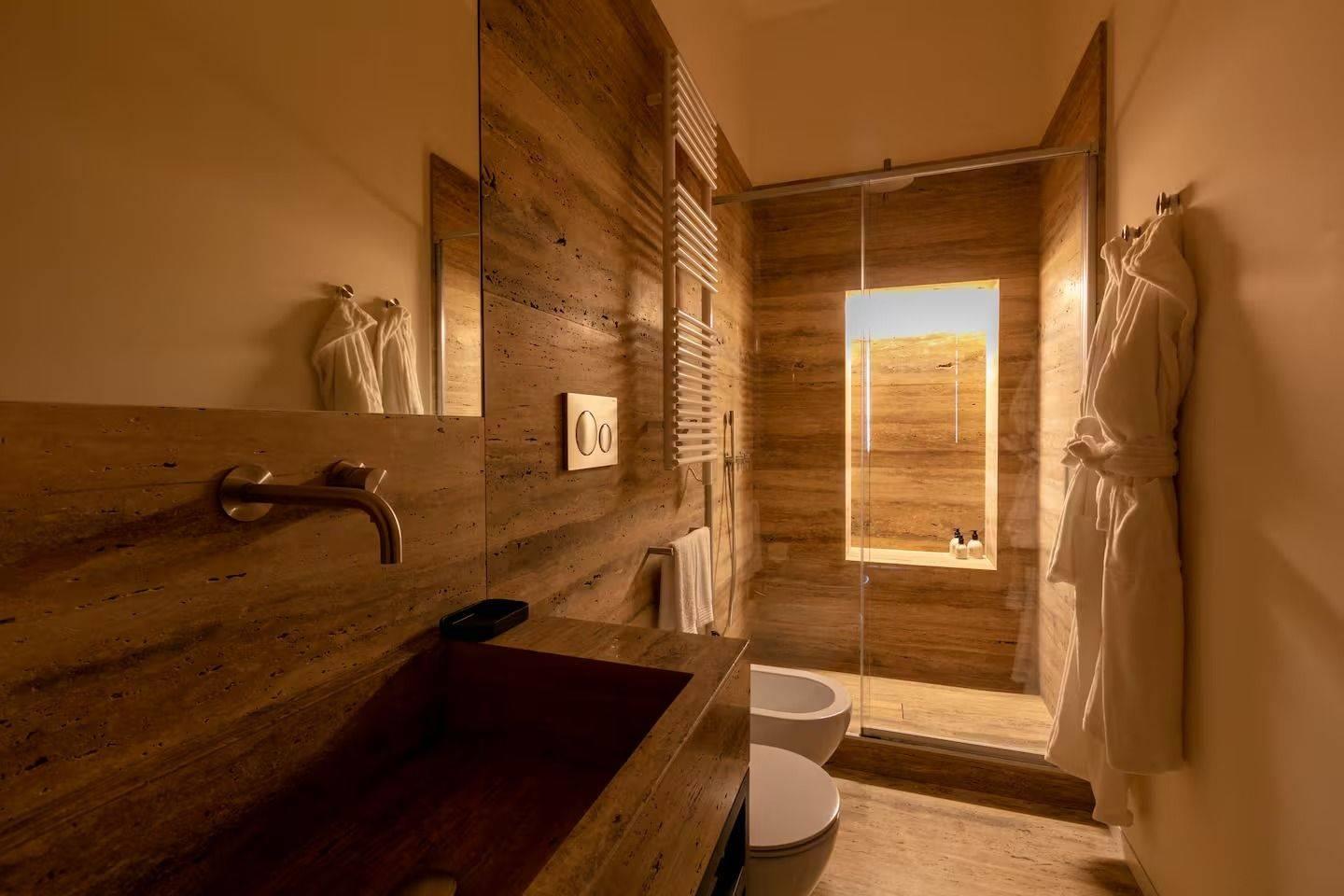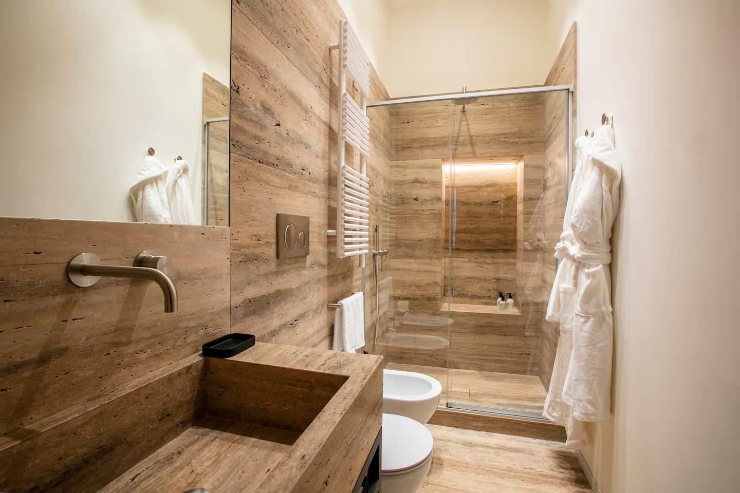 • Bagno di design rifinito in travertino grezzo, con rubinetteria CEA