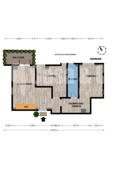 Ingresso. Soggiorno con angolo cottura e balcone. Cameretta. Bagno finestrato con doccia. Camera Matrimoniale. Disimpegno per armadiature.