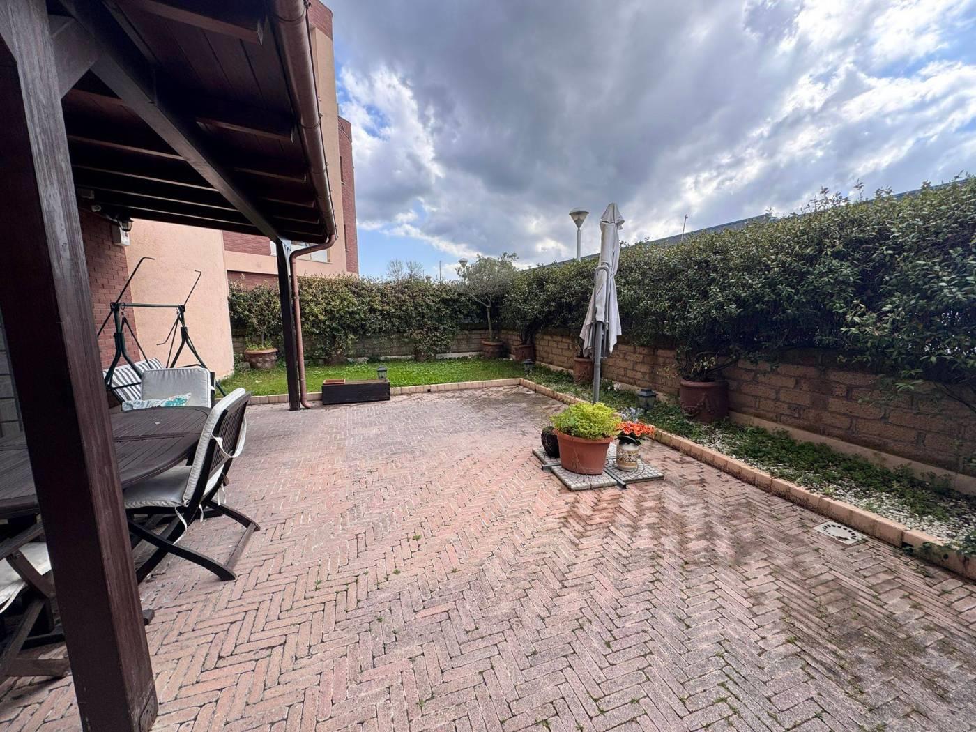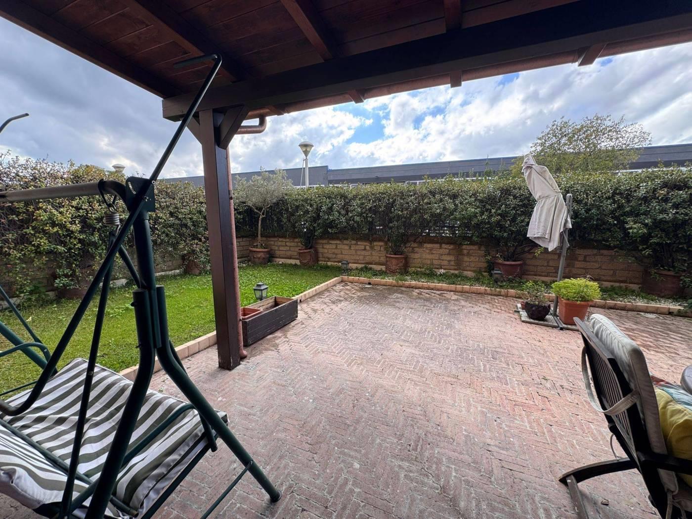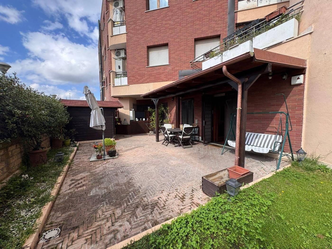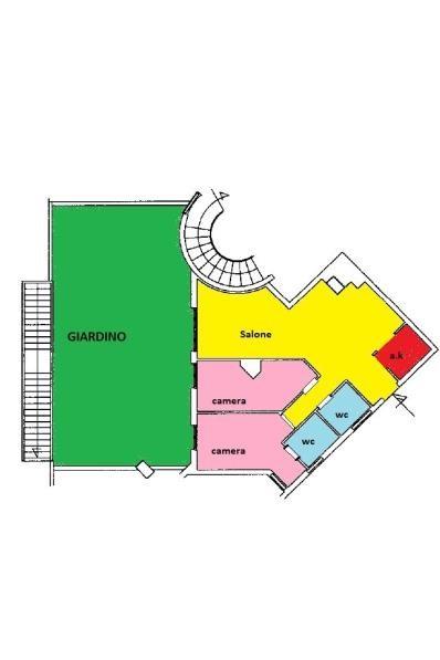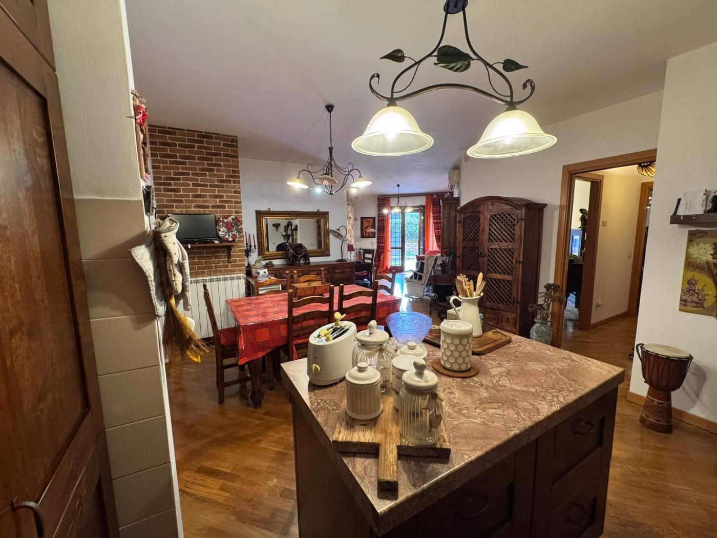 Internamente l’appartamento è composto da ampio salone con angolo cottura e accesso diretto al giardino, due camere di cui una con bagno privato, secondo bagno con doccia.