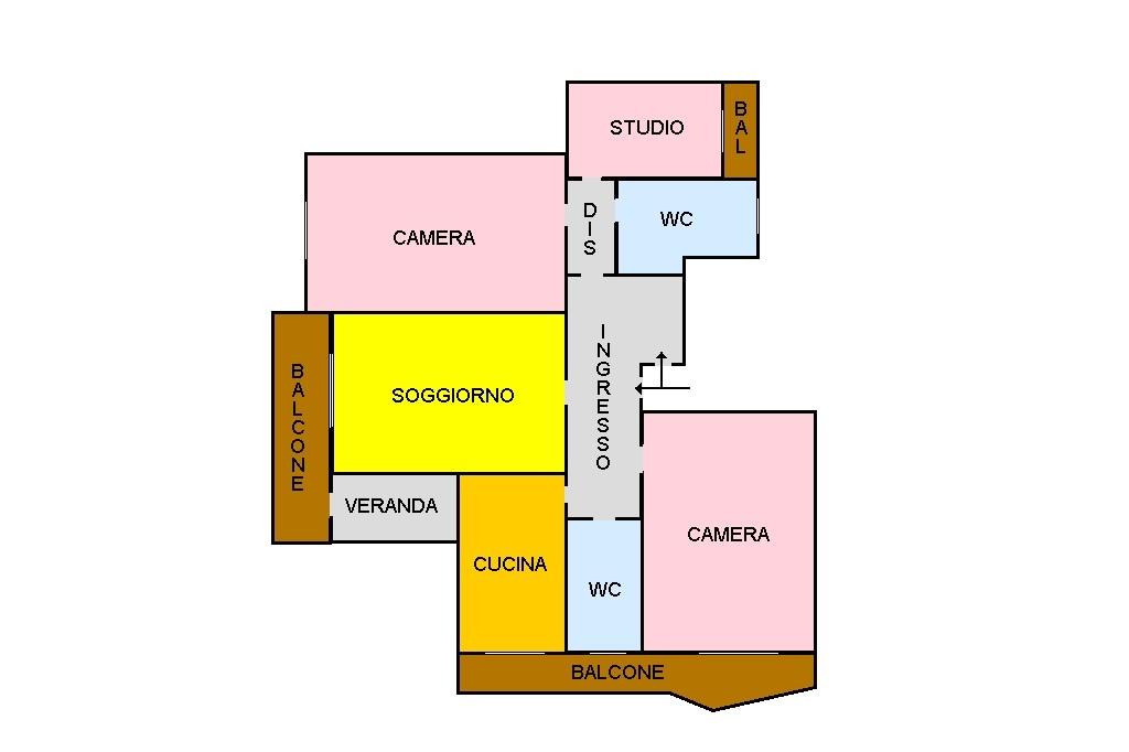 L'immobile si compone di: doppio ingresso, soggiorno con balcone, cucina con ulteriore sfogo esterno, due camere da letto matrimoniali, di cui una con accesso al medesimo balcone della cucina, studio e doppi servizi entrambi finestrati.