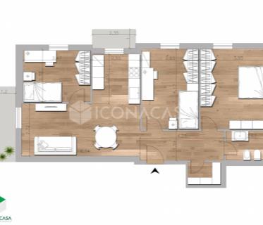 All’ingresso troviamo un accogliente disimpegno che conduce a un salone luminoso con accesso diretto al balcone. La cucina abitabile è spaziosa e facilmente personalizzabile. La zona notte comprende due ampie camere matrimoniali, un bagno finestrato con vasca e un comodo ripostiglio.