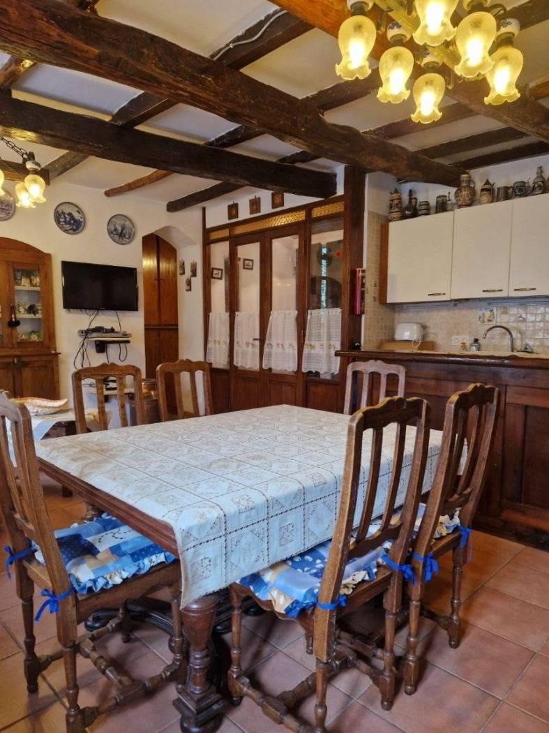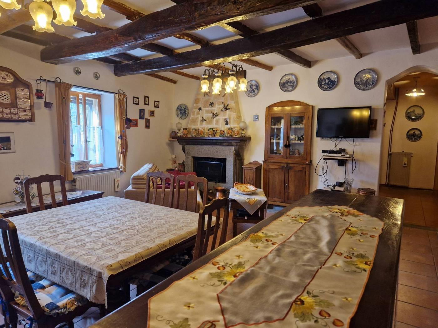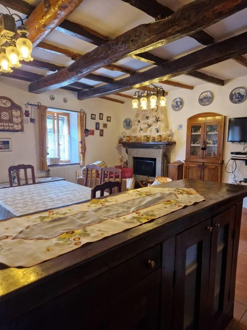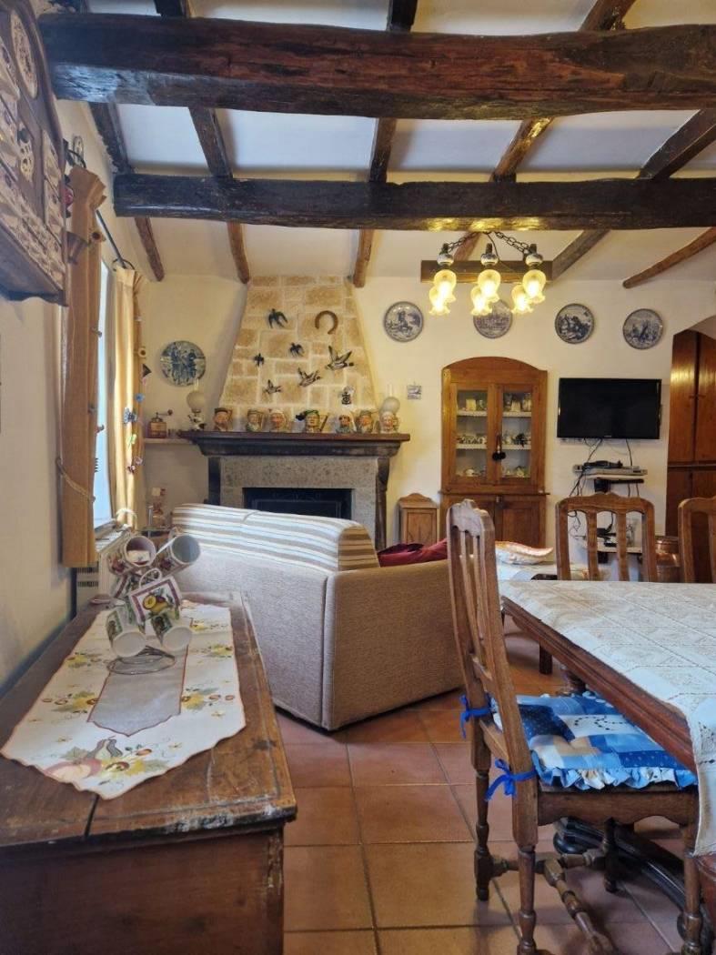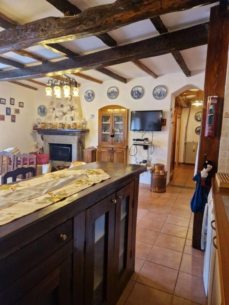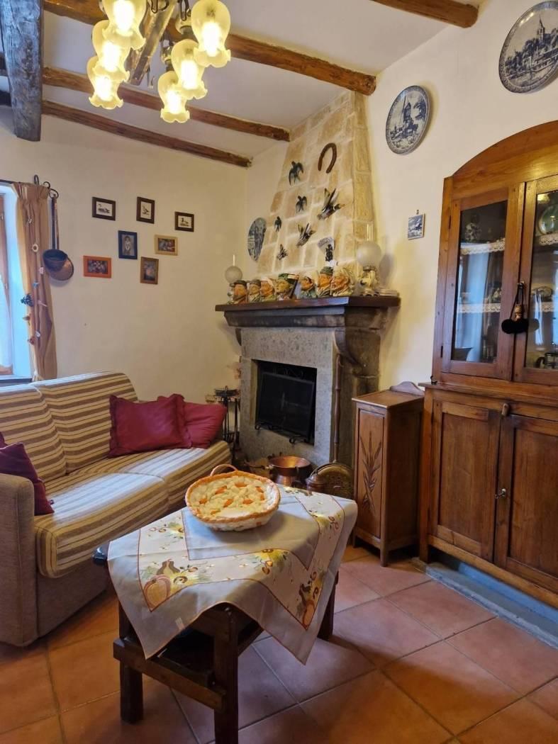 Al piano terra, un piccolo cortile introduce alla casa che all'ingresso è caratterizzata da un disimpegno strutturato da pareti a vetri. Seguendo troviamo un luminoso e accogliente salone con cucina a vista, camino in pietra, il tutto caratterizzato da travi in legno a vista che attraversano il soffitto, regalando un'atmosfera calda e accogliente. Attraverso un corridoio, valorizzato da armadi a muro in legno su misura da entrambi i lati che sfruttano al massimo lo spazio senza appesantire l'ambiente, accediamo alla zona notte dove troviamo una cameretta funzionale e ben adattabile alle proprie esigenze ed una scala in legno. Salendo la scala si accede al primo piano, un ambiente raccolto e accogliente, caratterizzato dalla presenza di una camera matrimoniale con tetto a travi in legno a vista ed un bagno completamente ristrutturato dotato di finiture moderne e funzionali.