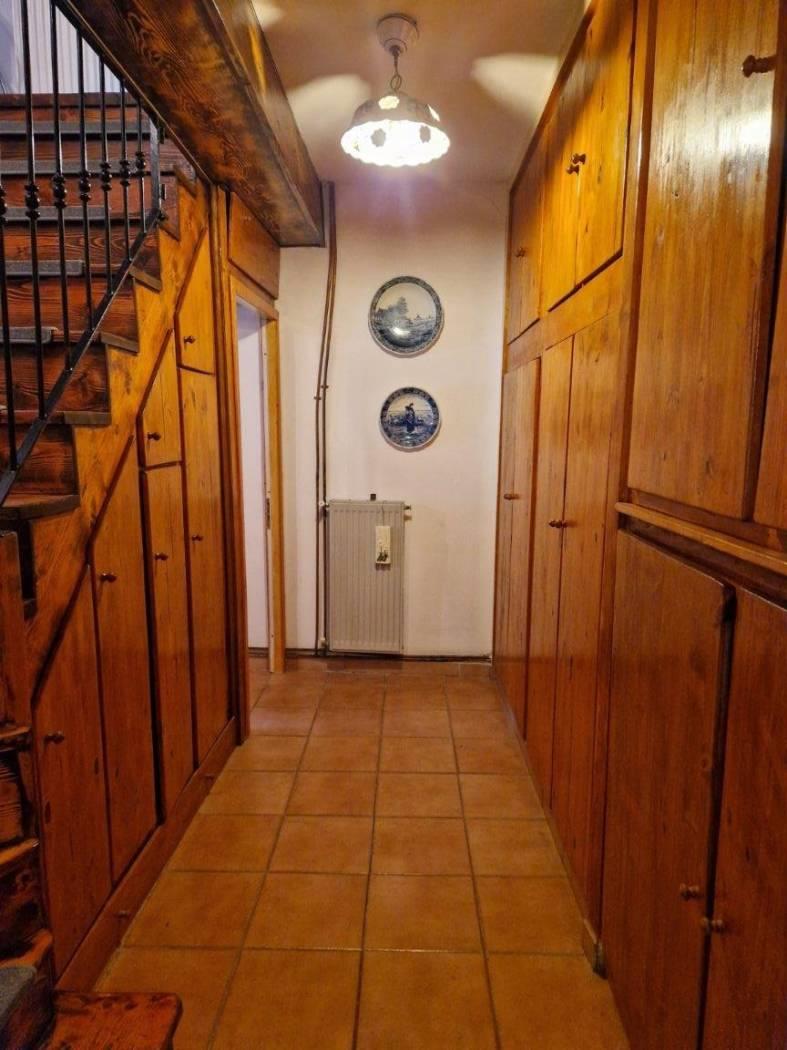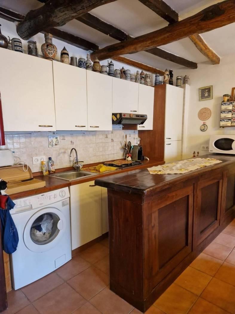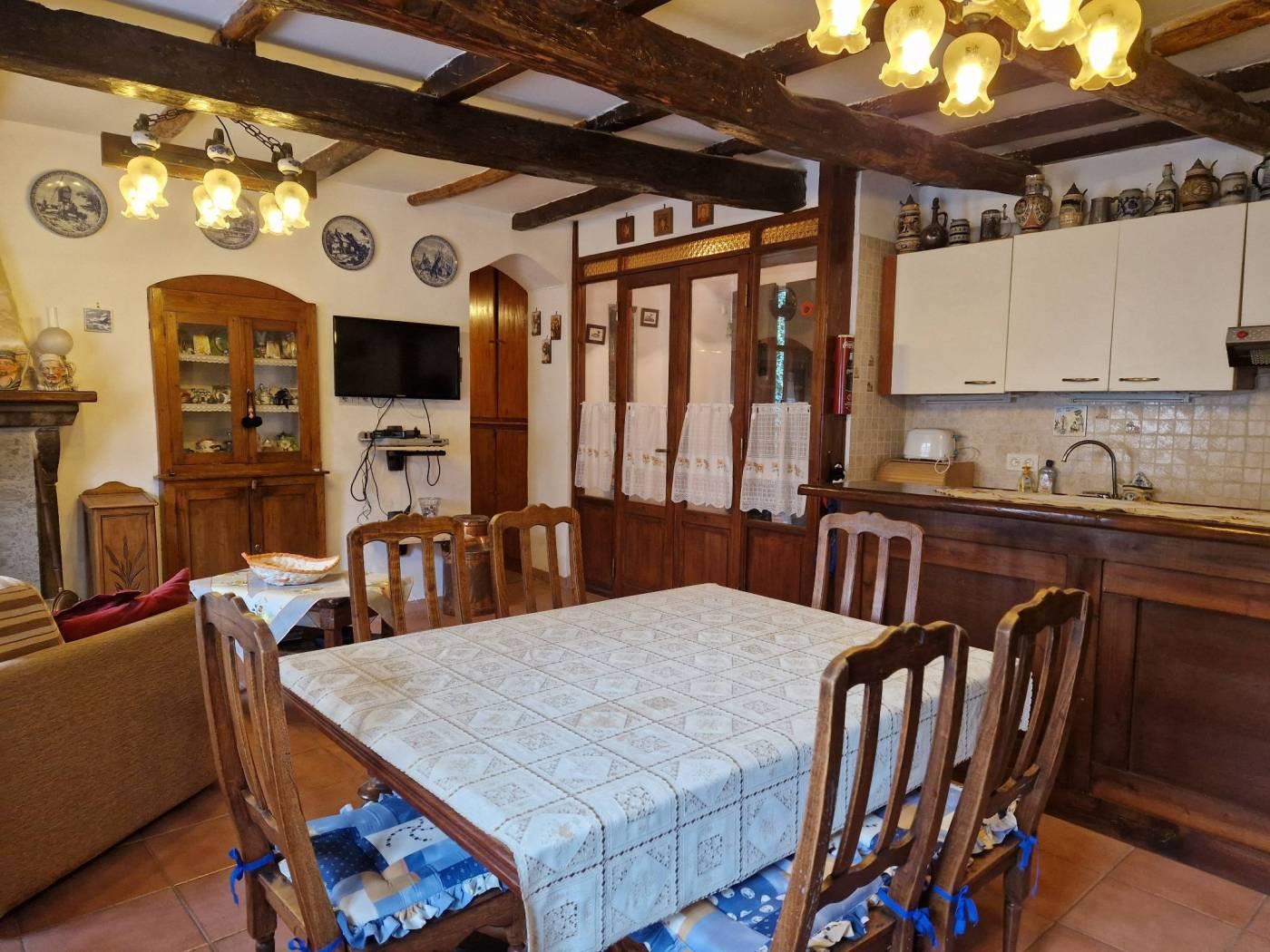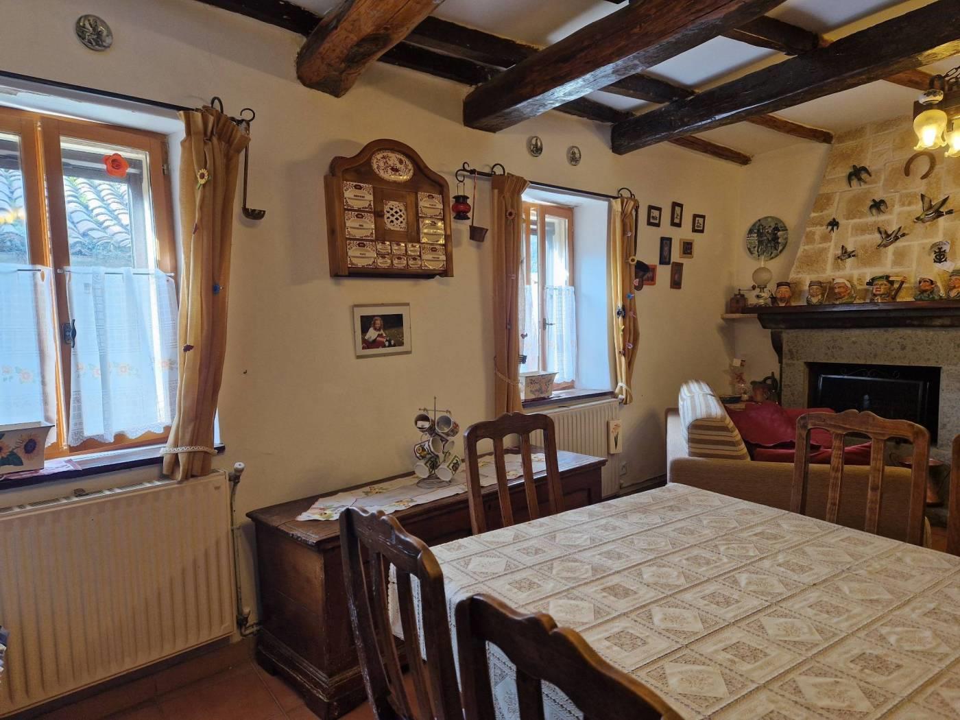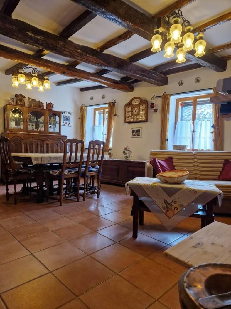 Al piano terra, un piccolo cortile introduce alla casa che all'ingresso è caratterizzata da un disimpegno strutturato da pareti a vetri. Seguendo troviamo un luminoso e accogliente salone con cucina a vista, camino in pietra, il tutto caratterizzato da travi in legno a vista che attraversano il soffitto, regalando un'atmosfera calda e accogliente. Attraverso un corridoio, valorizzato da armadi a muro in legno su misura da entrambi i lati che sfruttano al massimo lo spazio senza appesantire l'ambiente, accediamo alla zona notte dove troviamo una cameretta funzionale e ben adattabile alle proprie esigenze ed una scala in legno. Salendo la scala si accede al primo piano, un ambiente raccolto e accogliente, caratterizzato dalla presenza di una camera matrimoniale con tetto a travi in legno a vista ed un bagno completamente ristrutturato dotato di finiture moderne e funzionali.