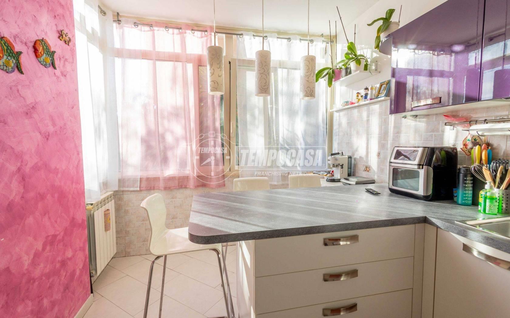 L’ingresso conduce direttamente al luminoso soggiorno, arricchito da un comodo accesso al balcone. La cucina a vista, moderna e funzionale, è dotata di una pratica penisola e di ampie vetrate che garantiscono una splendida illuminazione naturale, rendendo l’ambiente arioso e accogliente.