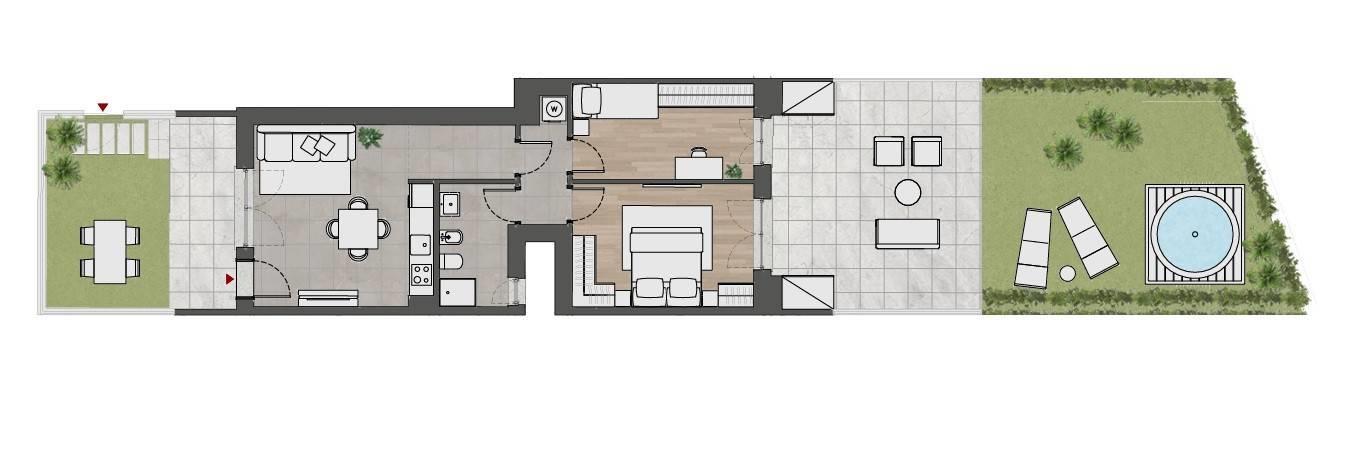 Ingresso indipendente attraverso cui si accede al giardino anteriore e al caratteristico porticato; ingresso all’abitazione, caratterizzata da ampio salone/pranzo con cucina a vista, disimpegno, camera, servita da un secondo porticato da cui si accede all’area giardino posteriore, bagno e vano lavanderia.