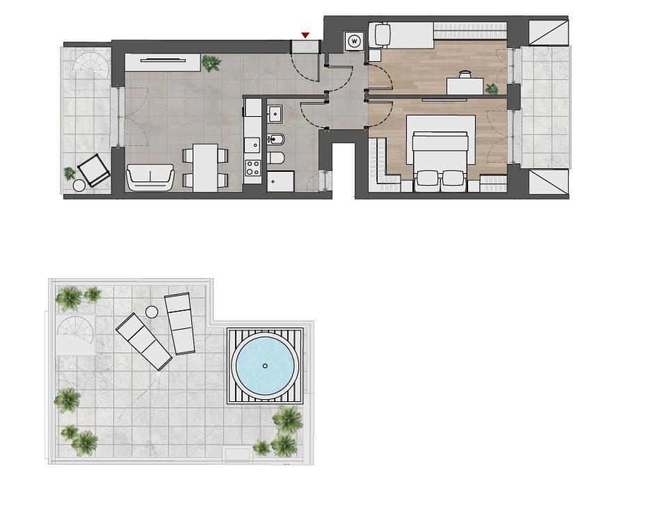 2° LIVELLO: tramite una caratteristica scala a chiocciola si accede ad una splendida terrazza di 60 mq che diventa un vero e proprio salotto all'aperto.