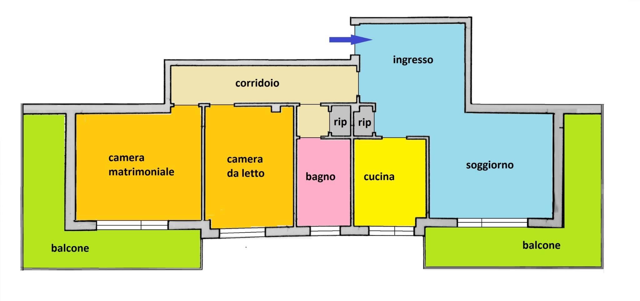 È composto da un salone doppio con accesso al primo terrazzo, cucina semi abitabile, disimpegno, 2 ripostigli, corridoio, due camere da letto matrimoniali di cui una con accesso al secondo terrazzo ed un comodo bagno con finestra e doccia.