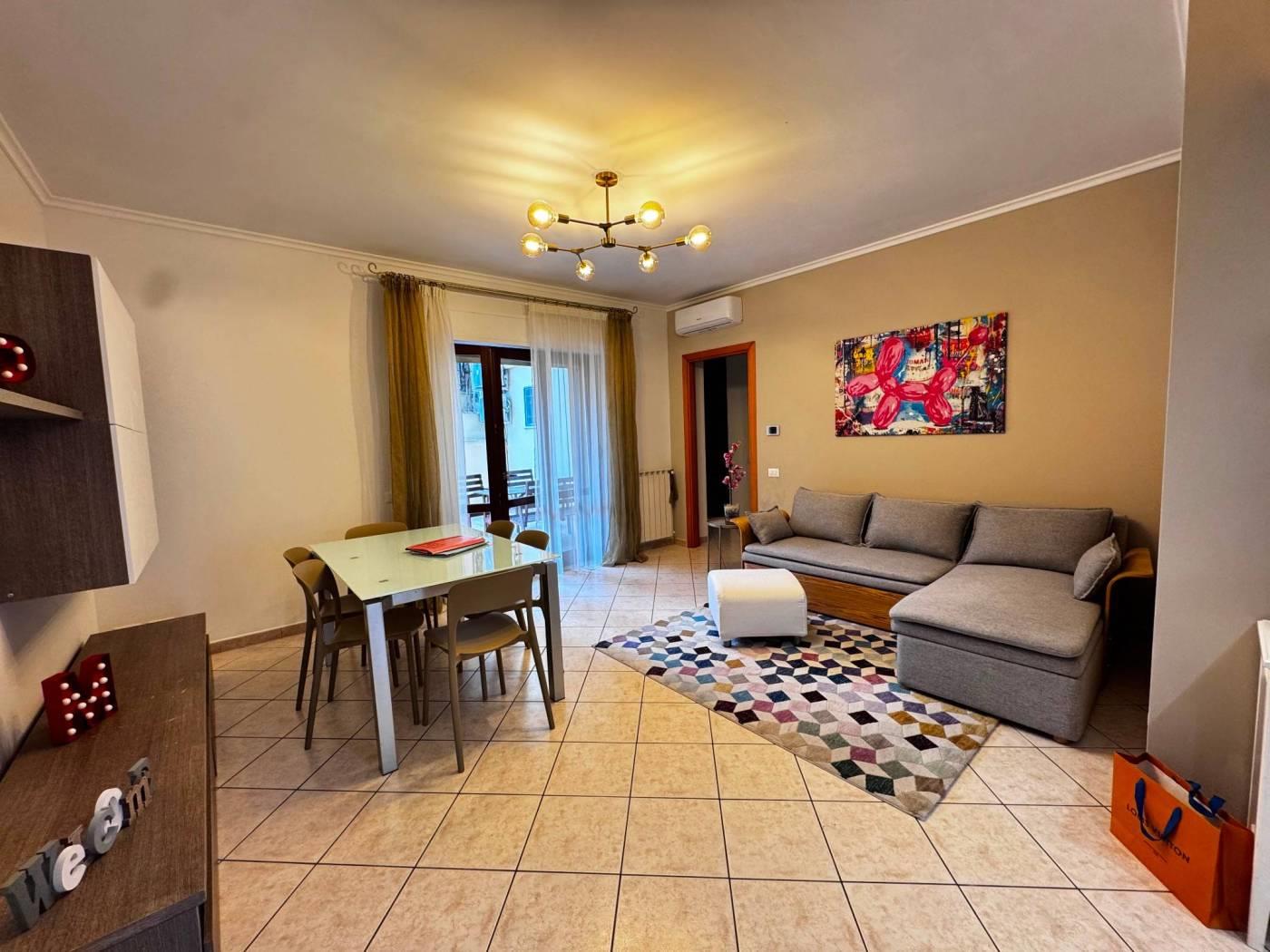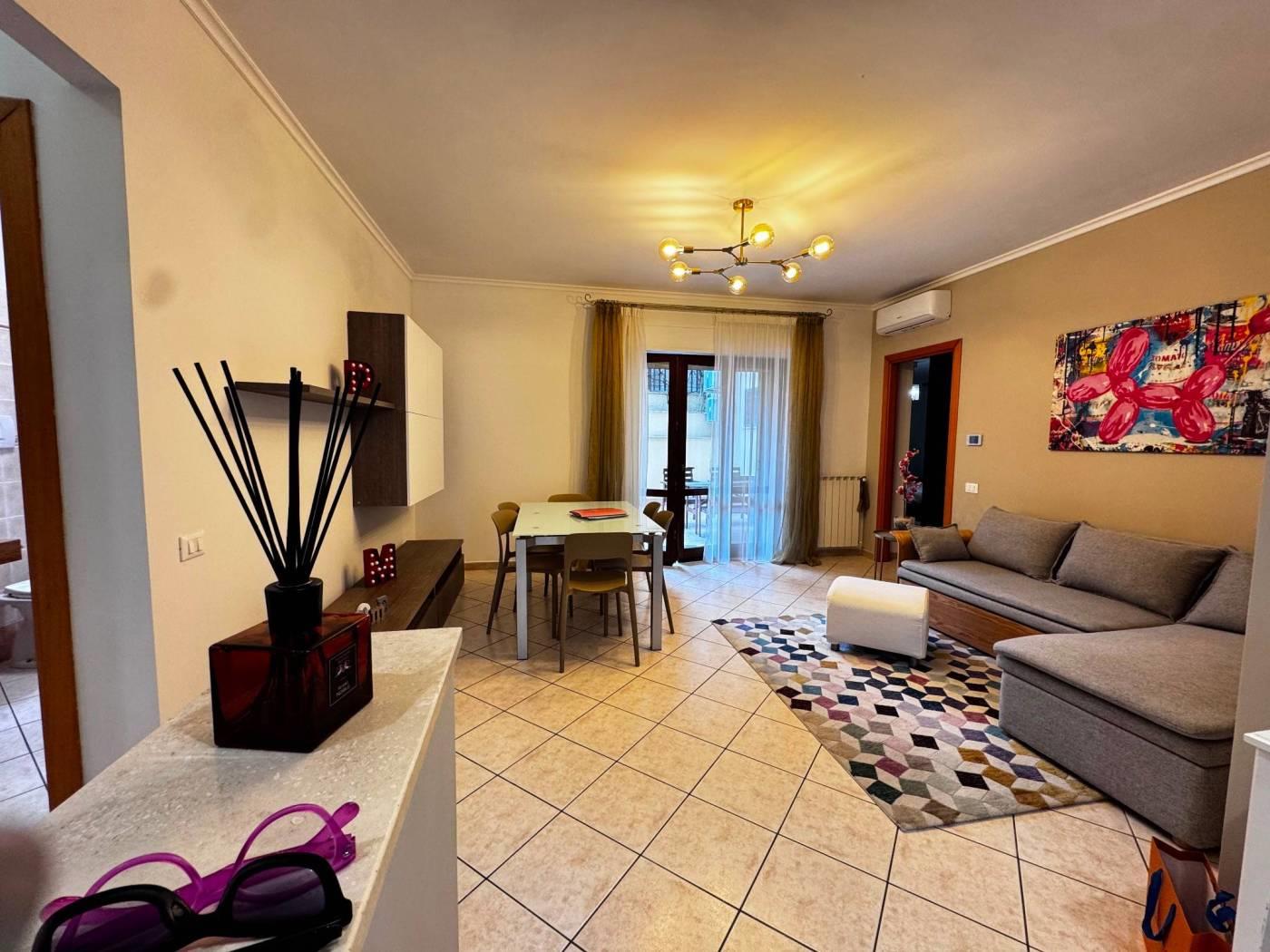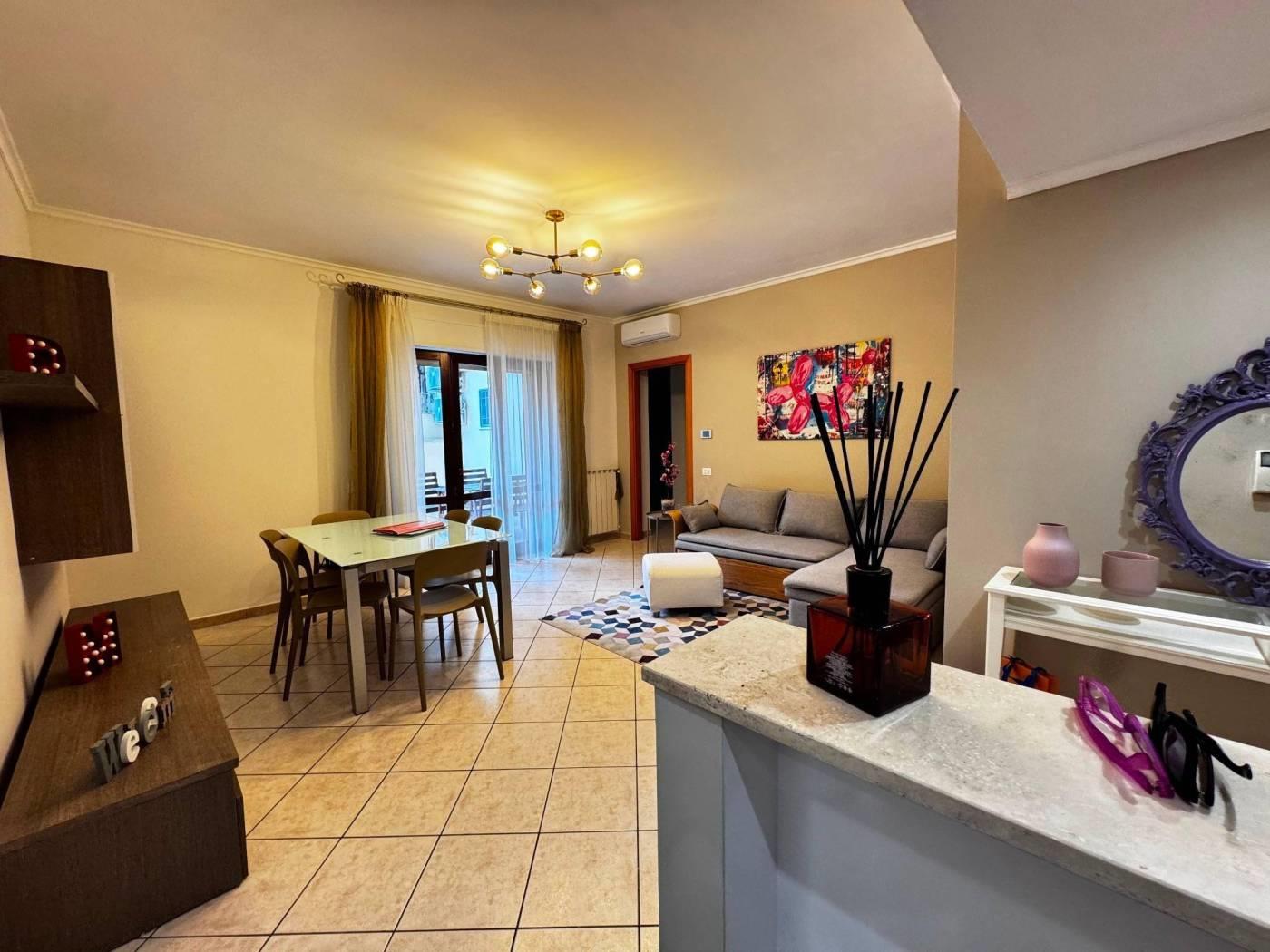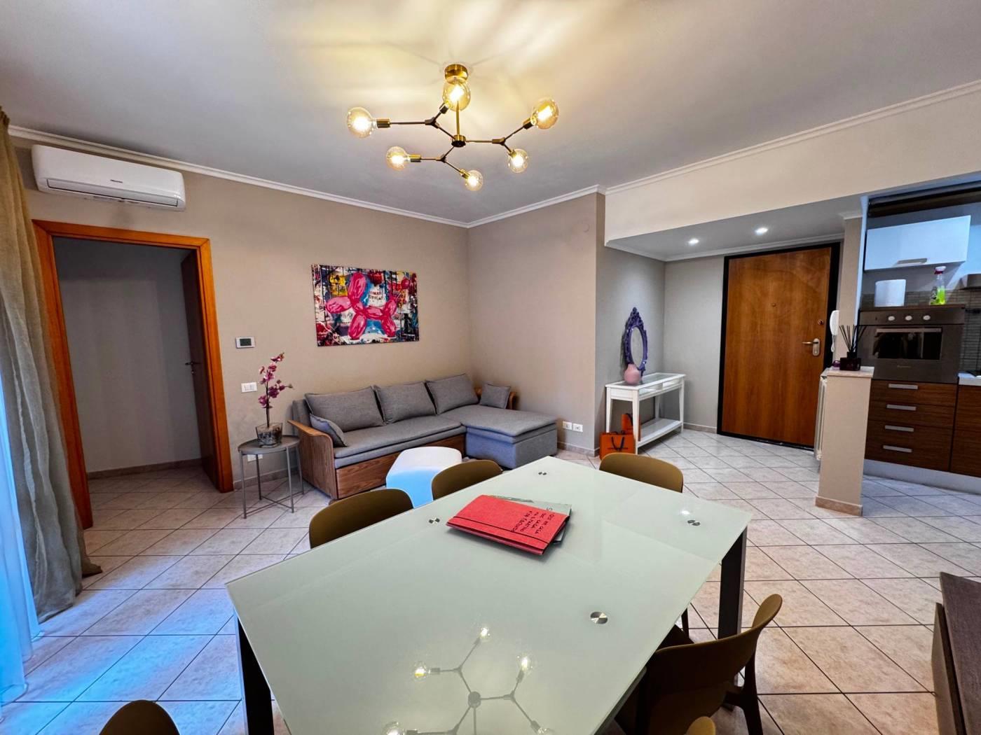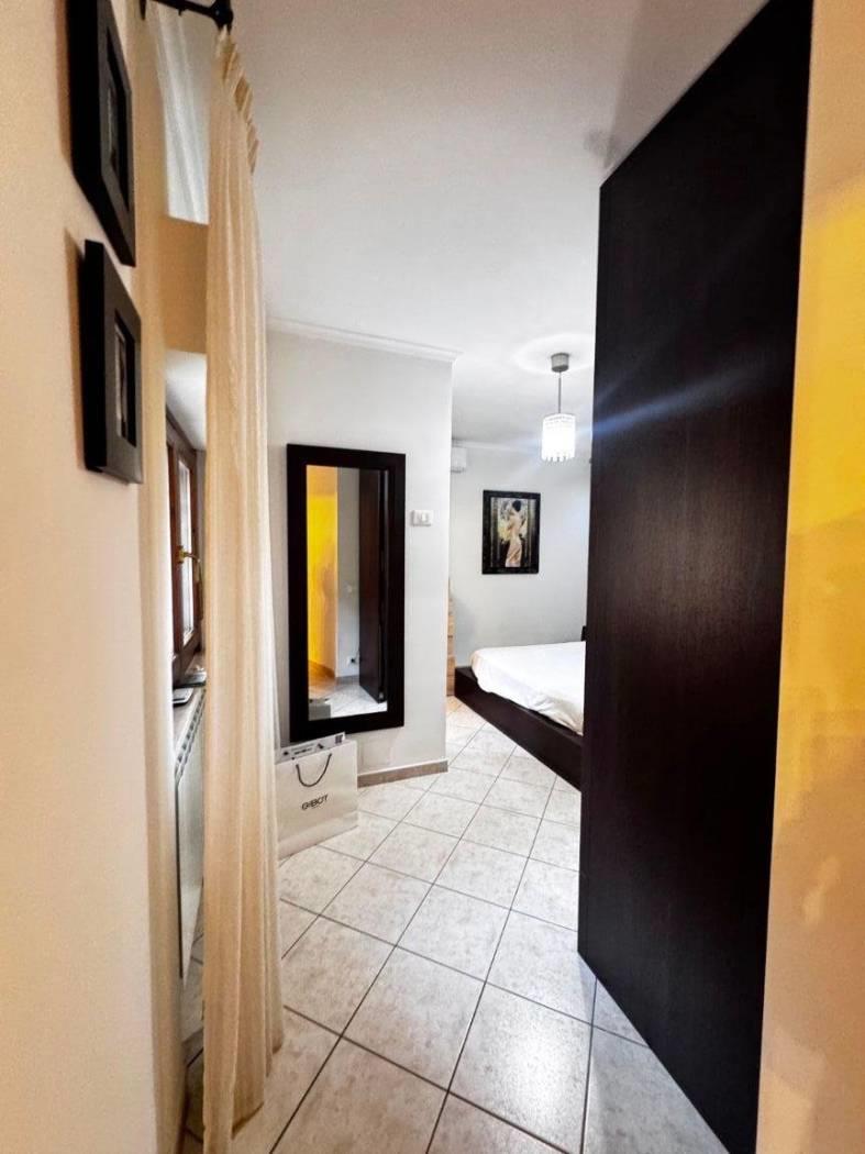 Gli spazi interni sono ben distribuiti, un ingresso con elegante controsoffitto e faretti illuminanti, un comodo soggiorno con cucinotto a vista, due camere da letto, di cui una con bagno privato e un secondo bagno finestrato e con vasca.