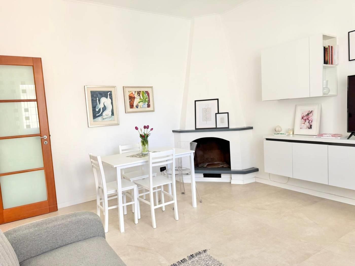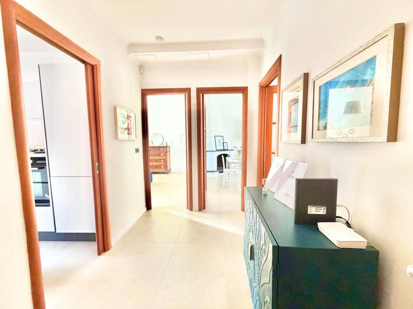 ingresso che conduce agli ambienti principali, ampio Salone luminosissimo ideale per il relax e la zona pranzo impreziosito da un bellissimo camino angolare, cucina moderna e funzionale "Veneta Cucine"con arredamento su misura completo di tutti gli elettrodomestici, due camere da letto, elegante bagno finestrato con comodo box doccia "walk in", balcone.