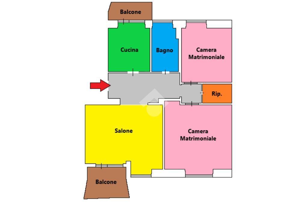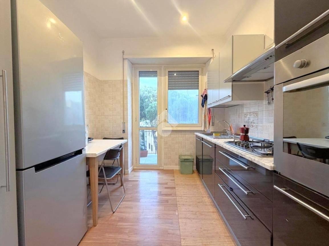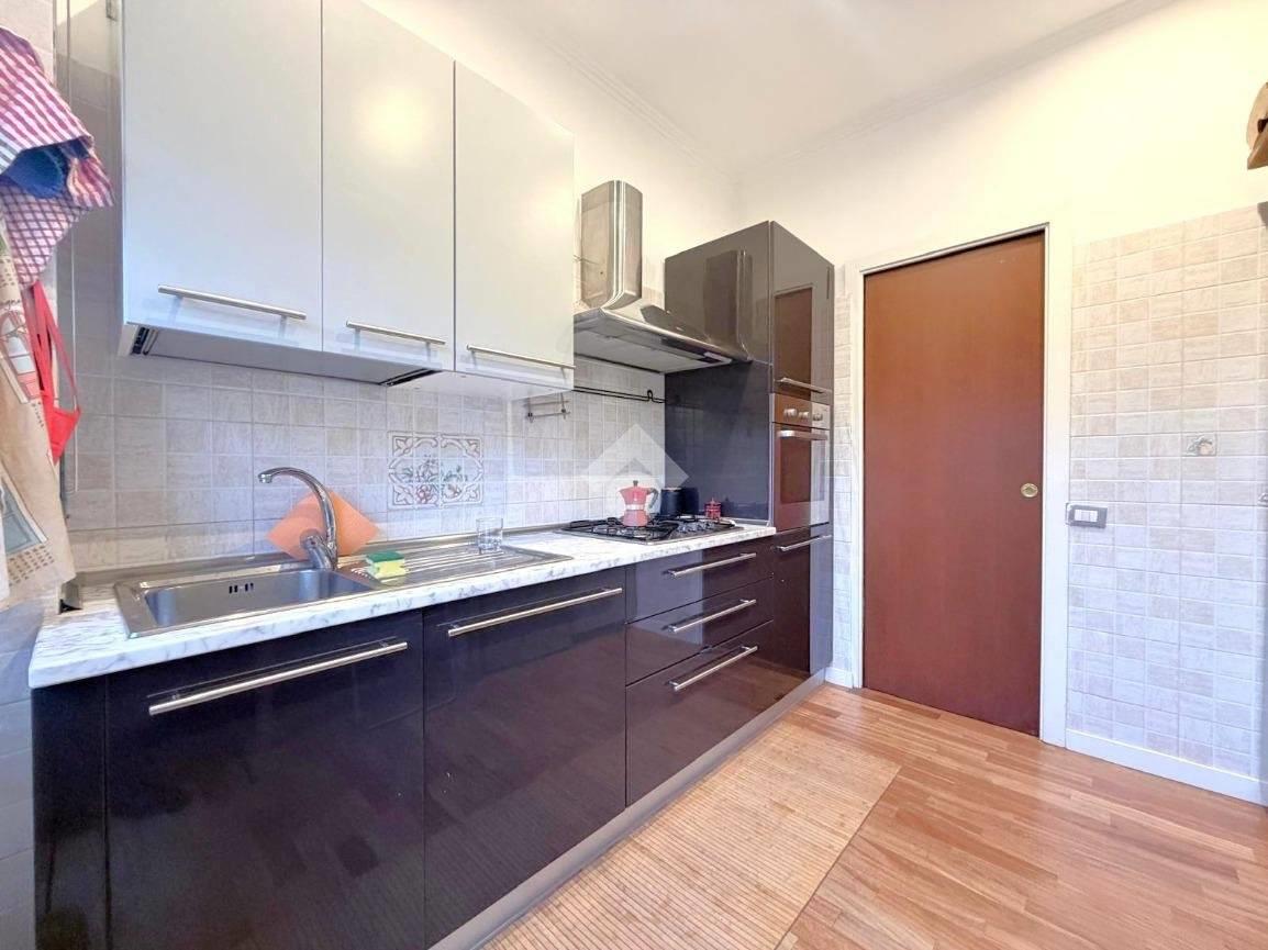 La cucina, separata e funzionale, dispone di accesso diretto al secondo balcone, pratico e comodo per l’uso quotidiano.