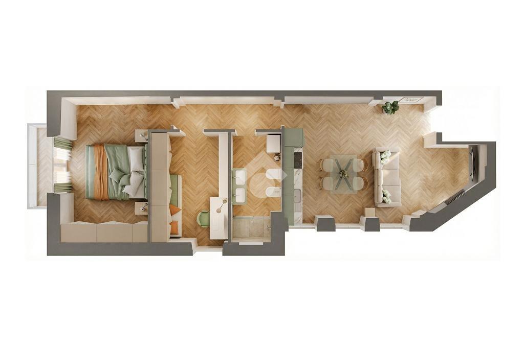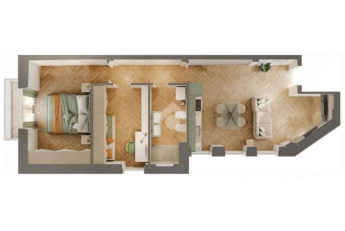 L’immobile sarà caratterizzato da una distribuzione degli spazi moderna e funzionale. L’ingresso condurrà direttamente nella zona giorno composta da ampio salone con cucina a vista, impreziosito dalla presenza di camino a bioetanolo, elemento di design che contribuirà a rendere l’ambiente accogliente e contemporaneo. La parete della cucina sarà rivestita in marmo, dettaglio elegante che valorizzerà l’intera area living.
