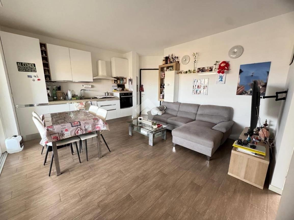 L’ingresso si apre su un accogliente soggiorno con cucina a vista, un ambiente funzionale e conviviale con accesso diretto tramite un’ampia vetrata al terrazzo di 14 mq, ideale per momenti di relax all’aperto. Sullo stesso livello si trova la camera da letto matrimoniale, il moderno bagno con box doccia e finestra ed un secondo spazio da poter utilizzare come zona lavanderia.