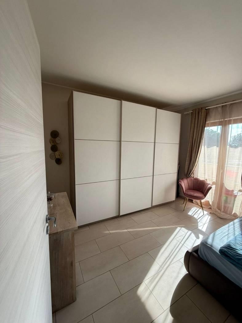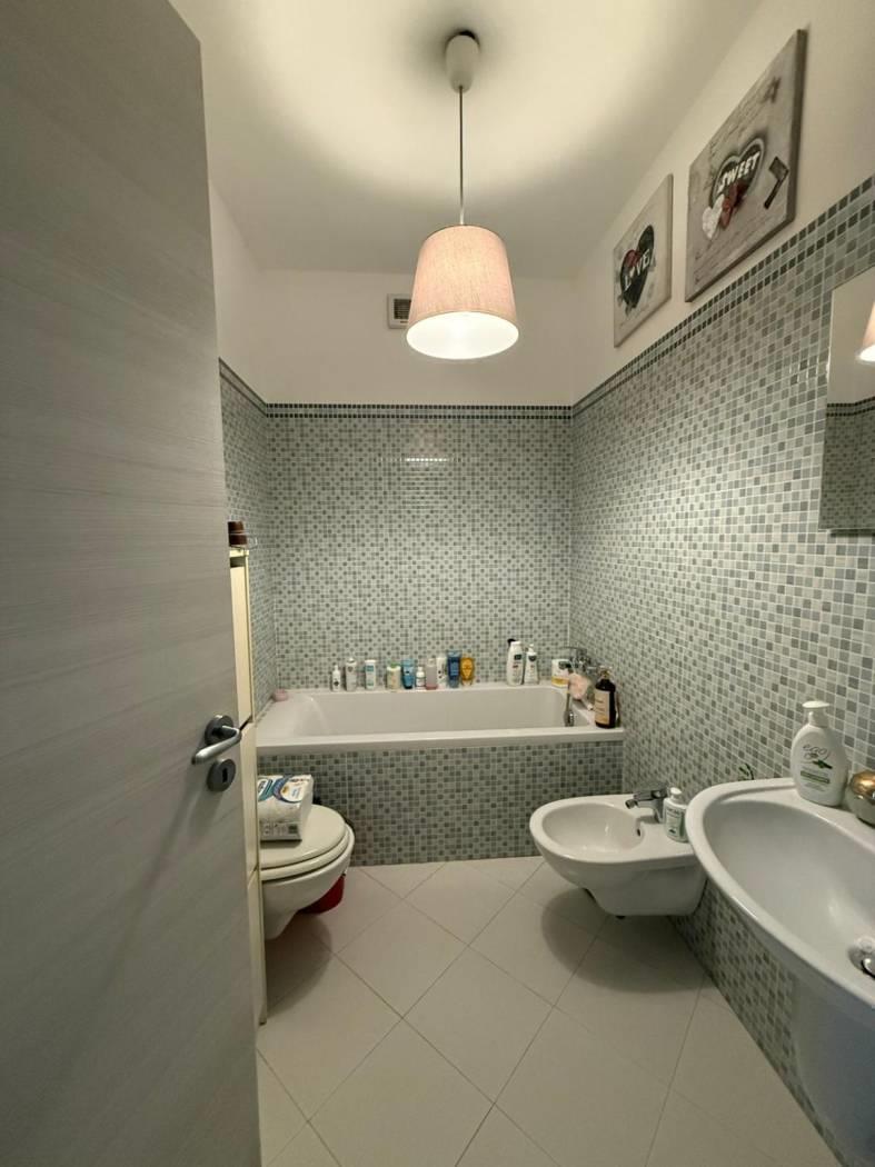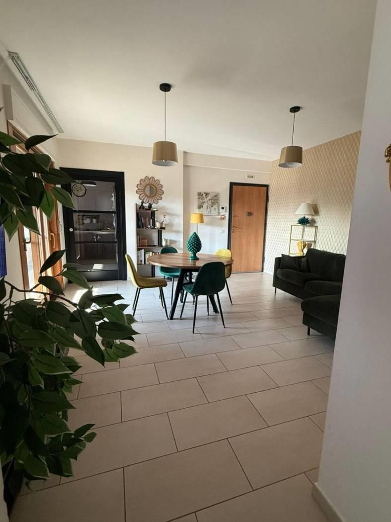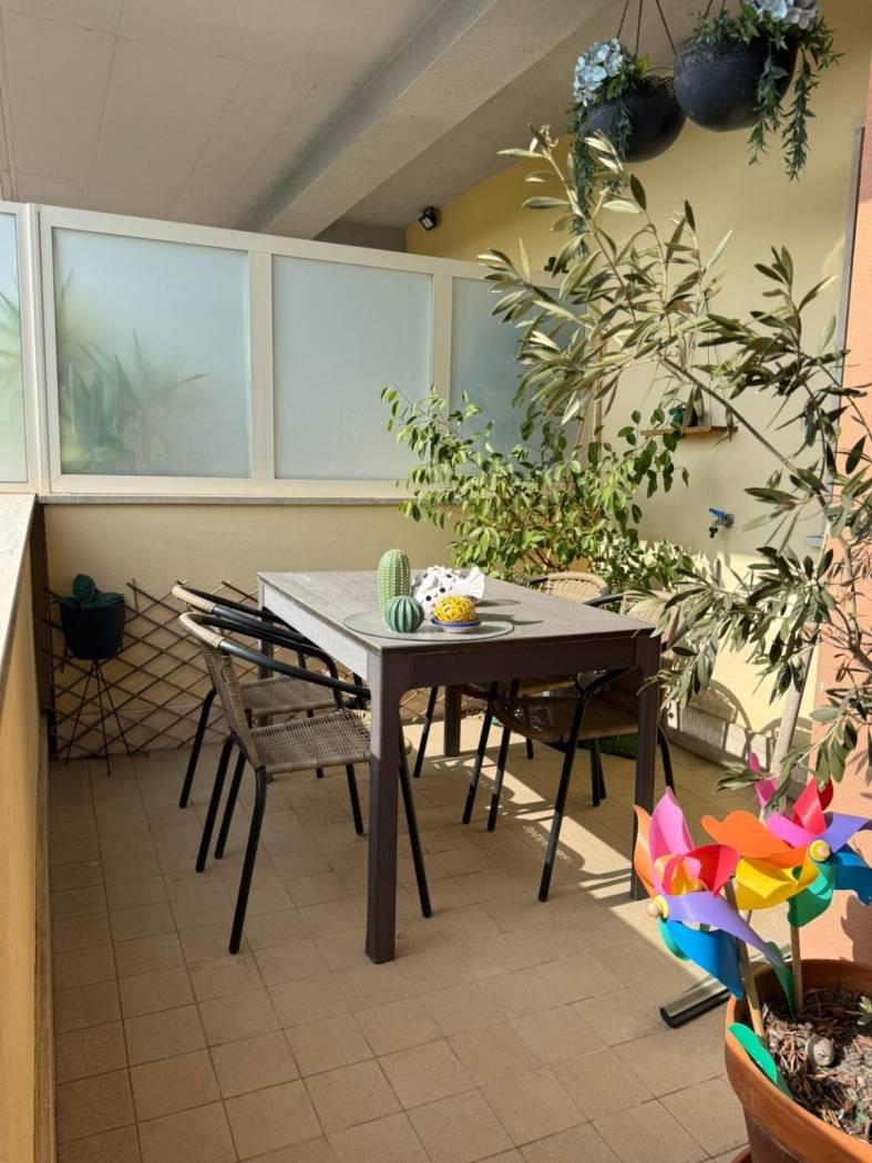 E' composto da un ingresso con portoncino blindato e video citofono, dal quale si accede direttamente al soggiorno molto comodo con ampia cucina vivibile, due camere da letto, due bagni di cui uno finestrato con doccia, l'altro con vasca. Intorno alla casa si sviluppa un ampio terrazzo balcone in alcuni punti vivibile, arredato con tende esterne. Ottimo anche come investimento. E presente aria condizionata per tutto l appartamento, riscaldamento a pavimento, finestre doppio vetro camera insonorizzate, pavimenti in gres porcellanato. Completa la proprietà un box auto di 19 mq.