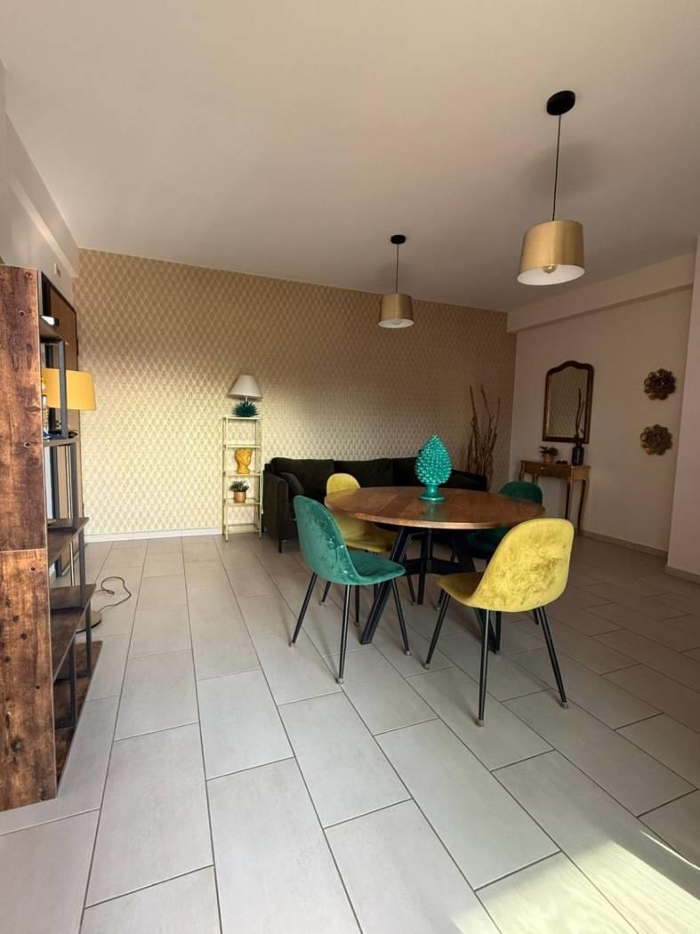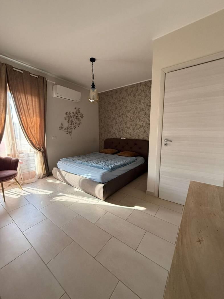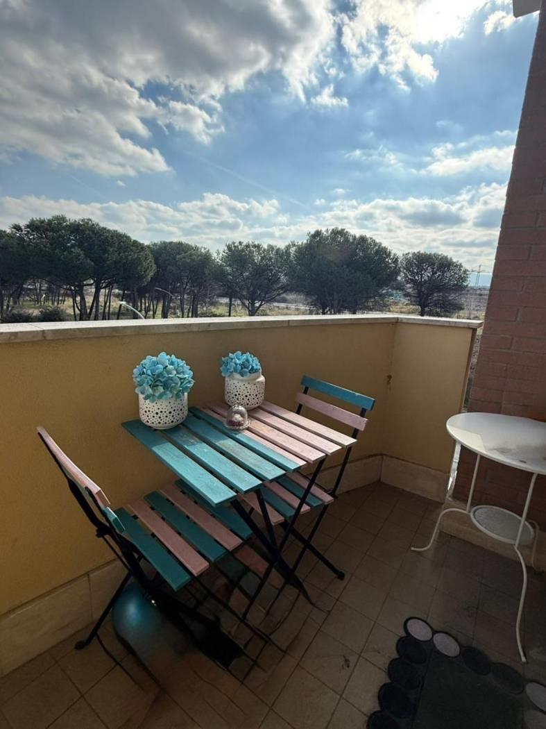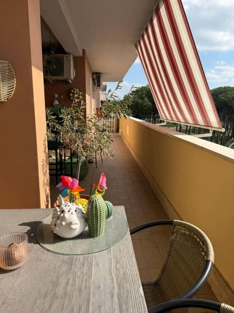 E' composto da un ingresso con portoncino blindato e video citofono, dal quale si accede direttamente al soggiorno molto comodo con ampia cucina vivibile, due camere da letto, due bagni di cui uno finestrato con doccia, l'altro con vasca. Intorno alla casa si sviluppa un ampio terrazzo balcone in alcuni punti vivibile, arredato con tende esterne. Ottimo anche come investimento. E presente aria condizionata per tutto l appartamento, riscaldamento a pavimento, finestre doppio vetro camera insonorizzate, pavimenti in gres porcellanato. Completa la proprietà un box auto di 19 mq.