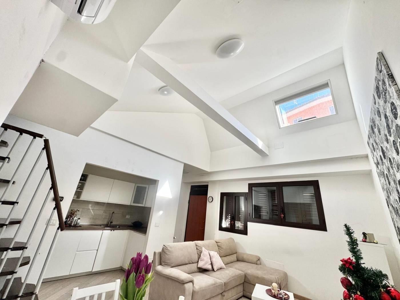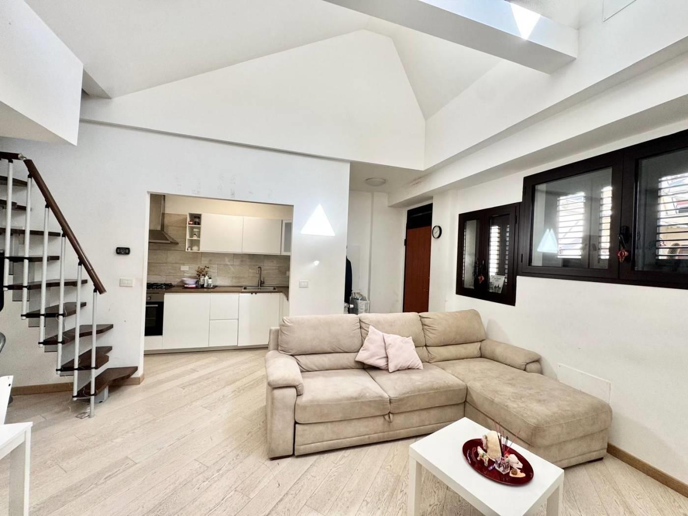 Entrando si ha un impatto informale e molto riservato, per poi essere accolti al terzo piano dal cielo azzurro di Roma che sovrasta la struttura di ferro che copre tutto il perimetro residenziale. L'appartamento ha una corte esterna di pertinenza, dalla quale si accede al soggiorno/pranzo molto luminoso ed arioso grazie alla sua altezza di oltre 5 m con lucernario con velux elettrica, angolo cottura, camera da letto con comoda cabina armadio e bagno con vasca idromassaggio. Al piano sovrastante troviamo la mansarda dove è possibile creare la seconda camera/studio.