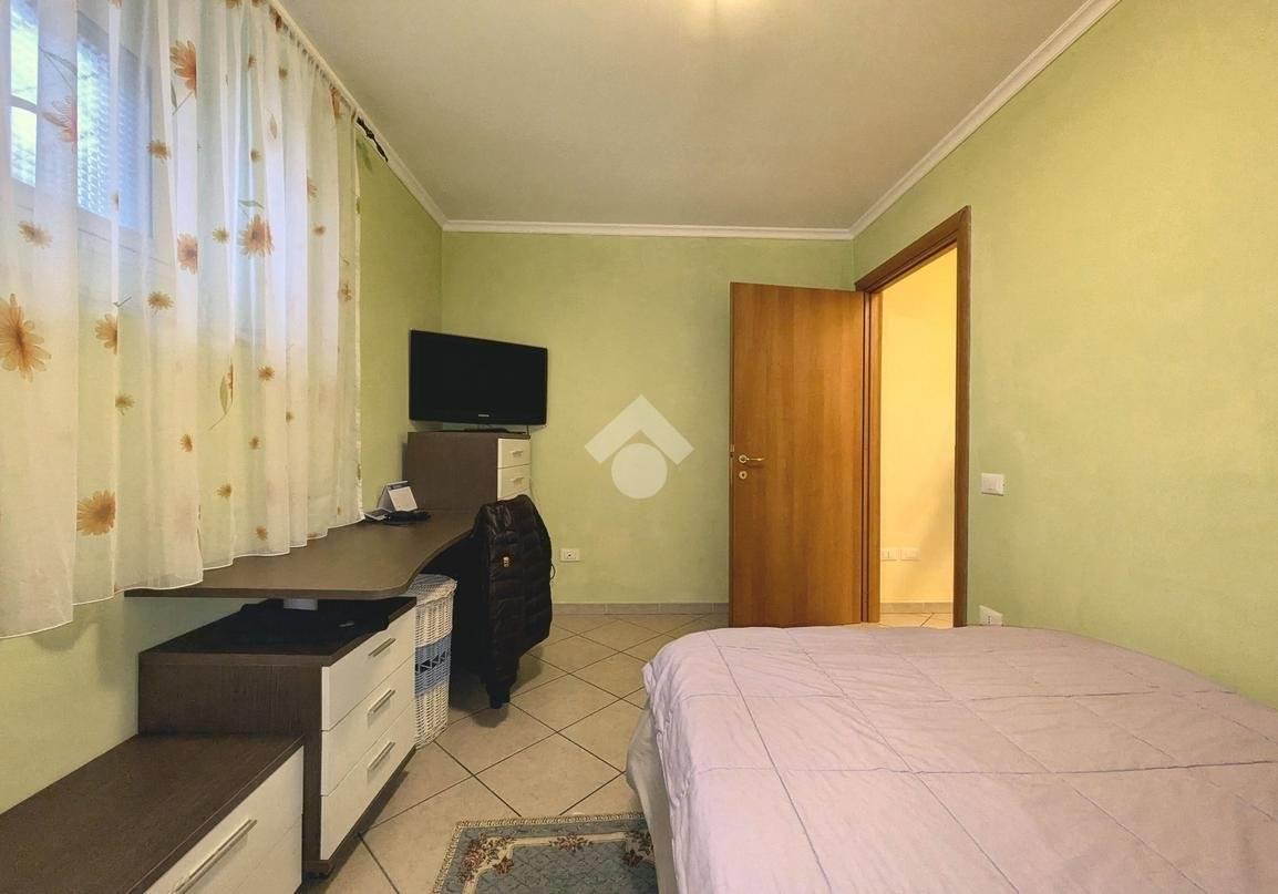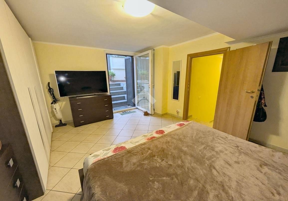 Dalla camera matrimoniale, grazie a una porta finestra, si accede a una corte mattonata, uno spazio esterno riservato, perfetto come area di sfogo.
