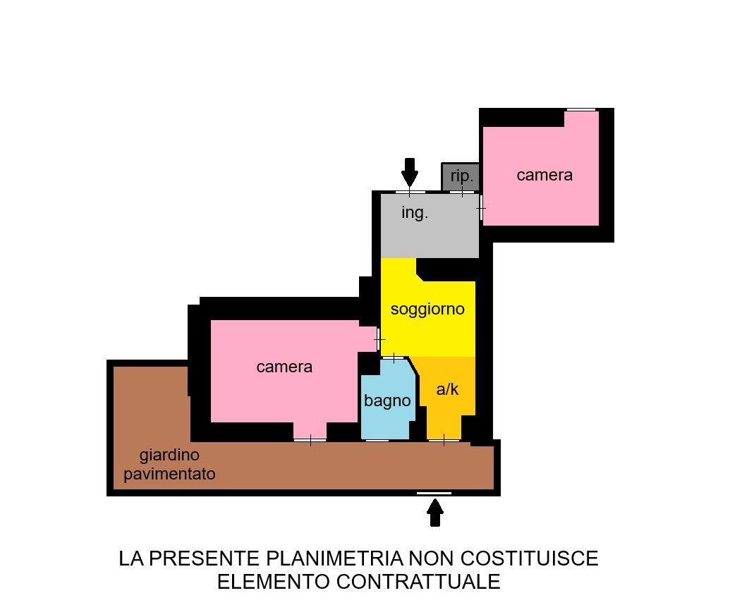 L'appartamento, si compone di ingresso principale e ingresso indipendente dal giardino esclusivo, soggiorno con angolo cottura, due camere, bagno, ripostiglio e giardino pavimentato di mq. 23.