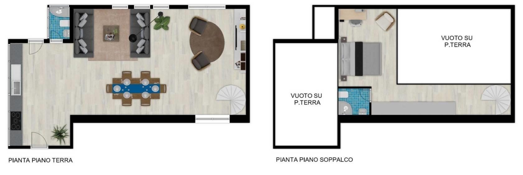 Comprende un'ampia zona living con cucina, un bagno di servizio con doccia ed una confortevole zona notte soppalcata con bagno privato.