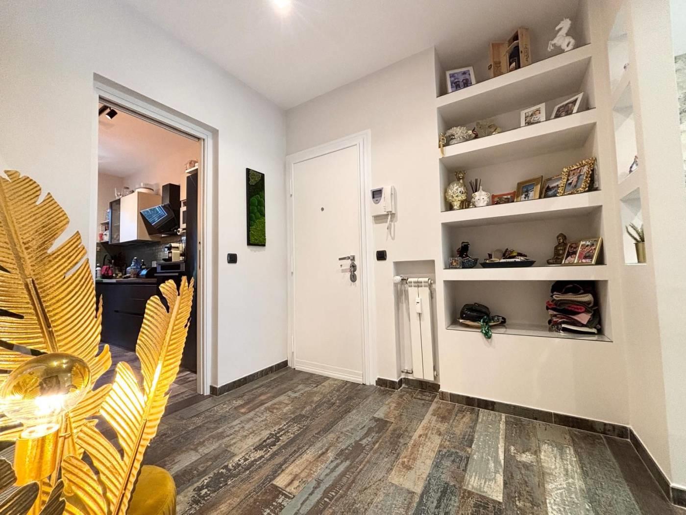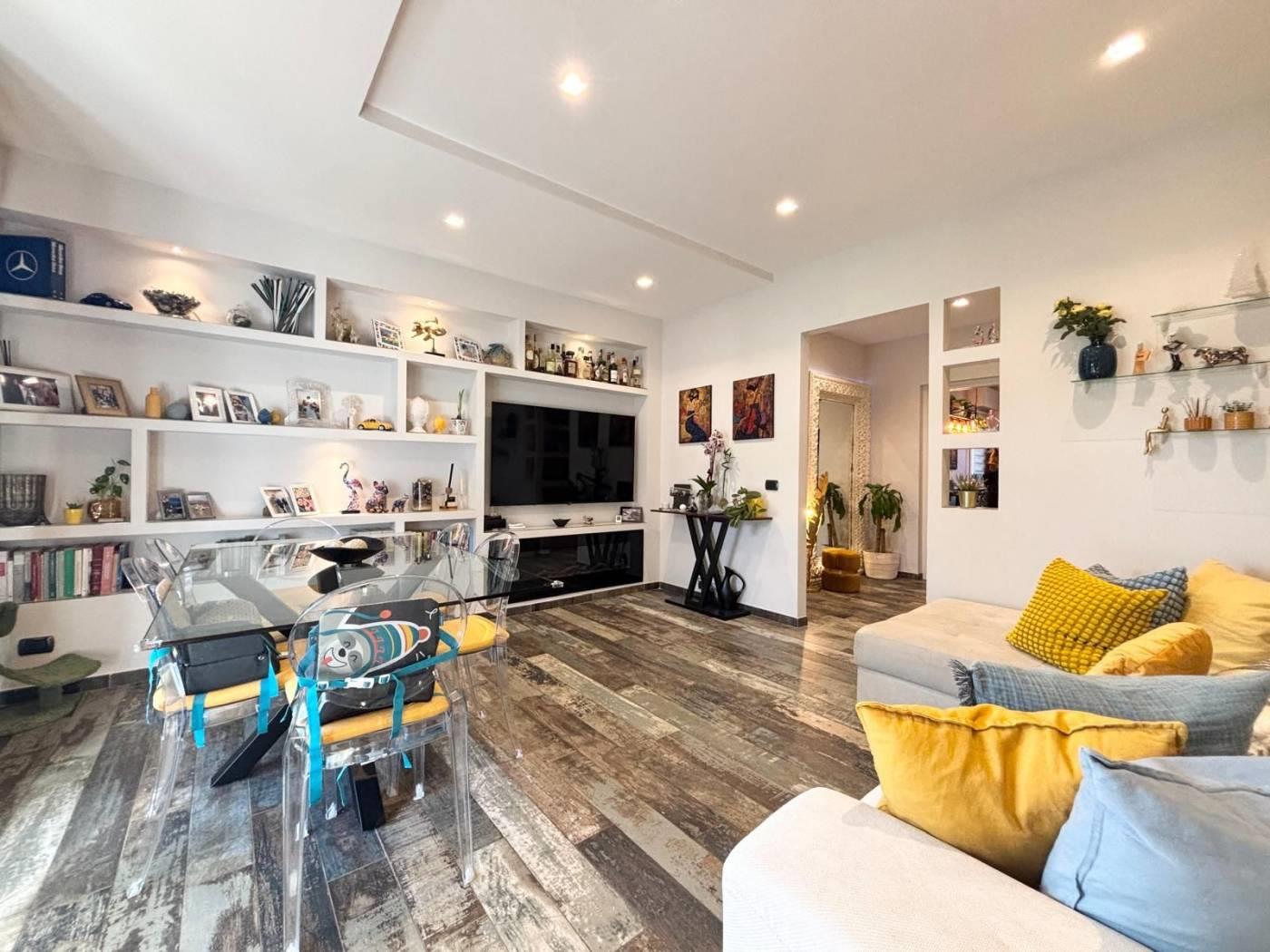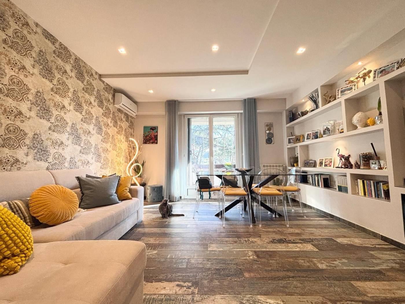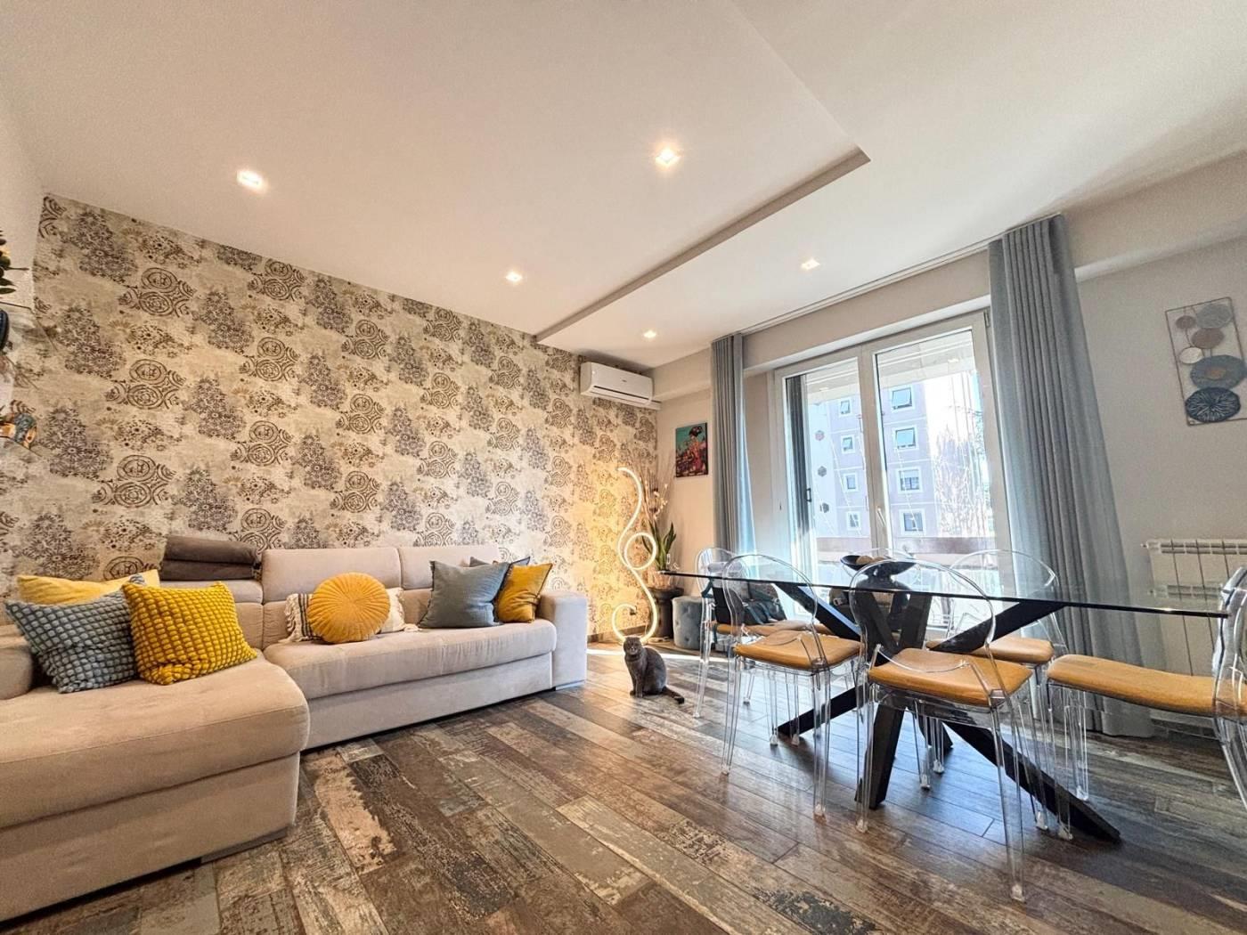 L'appartamento si trova in una posizione comoda, ben collegata a scuole, parchi e servizi essenziali, con facile accesso alle principali vie di comunicazione. La soluzione abitativa comprende un ampio salone, una cucina, due camere da letto, un bagno, un ripostiglio ed un balcone. Completano la proprietà una cantina ed un posto auto. L'immobile è stato completamente RISTRUTTURATO, con materiali di pregio e finiture di alta qualità, pavimentazione in gress porcellanato Sant'Agostino, infissi PVC doppio vetro con tapparelle elettriche e zanzariere, illuminazione con faretti al Led, caminetto elettrico che serve tutta la zona giorno, impianto di climatizzazione, impianto elettrico ed idrico rifatti, armadiature su misura e una cucina progettata con cura. La sua collocazione lo rende ideale per chi cerca una residenza in un contesto funzionale e vicino ai principali servizi, stabile recintato con giardino interno condominiale sempre ben curato e servizio di portineria.