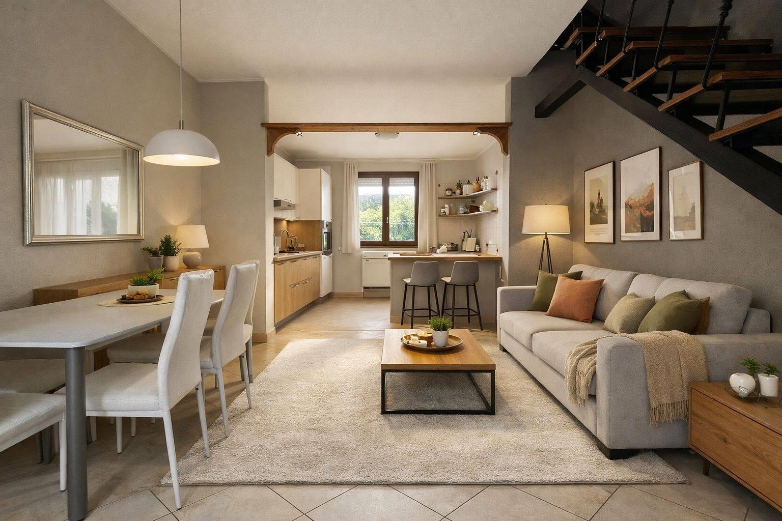 L’immobile si apre su un accogliente soggiorno con angolo cottura, un ambiente funzionale e ben distribuito che rappresenta il cuore della casa. Attraverso una comoda scala in legno si accede alla zona notte, dove troviamo una camera matrimoniale con predisposizione per il condizionatore, una cameretta e un servizio finestrato completo di box doccia.