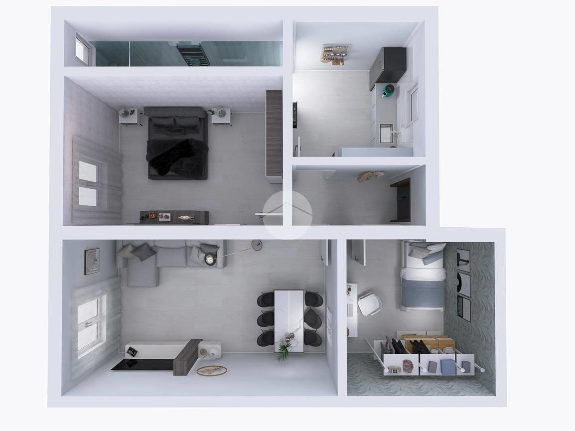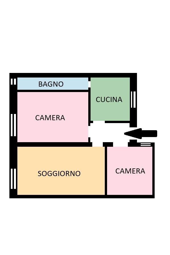 L'immobile è così composto: ingresso, ampio soggiorno, cucina abitabile, camera da letto matrimoniale, cameretta e servizio finestrato.