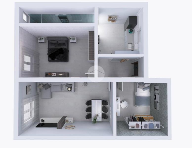 Grazie alla presenza di alcuni tramezzi, vi è la possibilità di creare un'ampia zona living con angolo cottura.