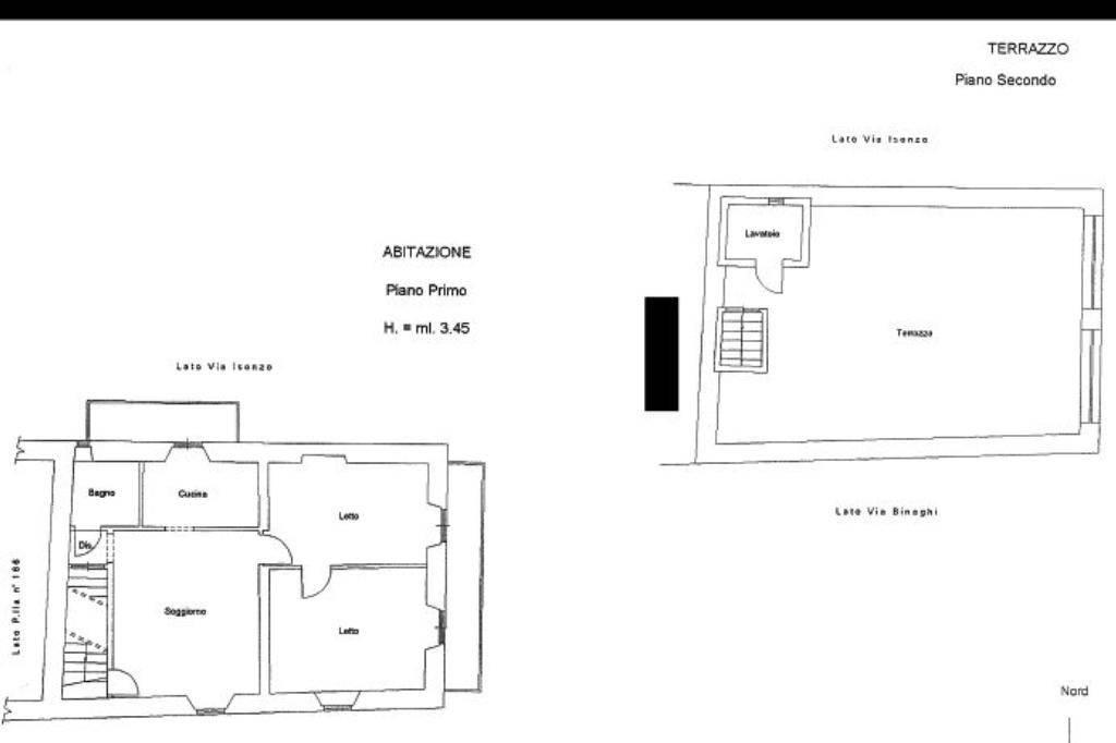 P1: composto da disimpegno, bagno con doccia, sala da pranzo, angolo cottura, disimpegno, 2 camere da letto, di cui una matrimoniale e l’altra singola. P2: tramite la scala si raggiunge la dominante terrazza.