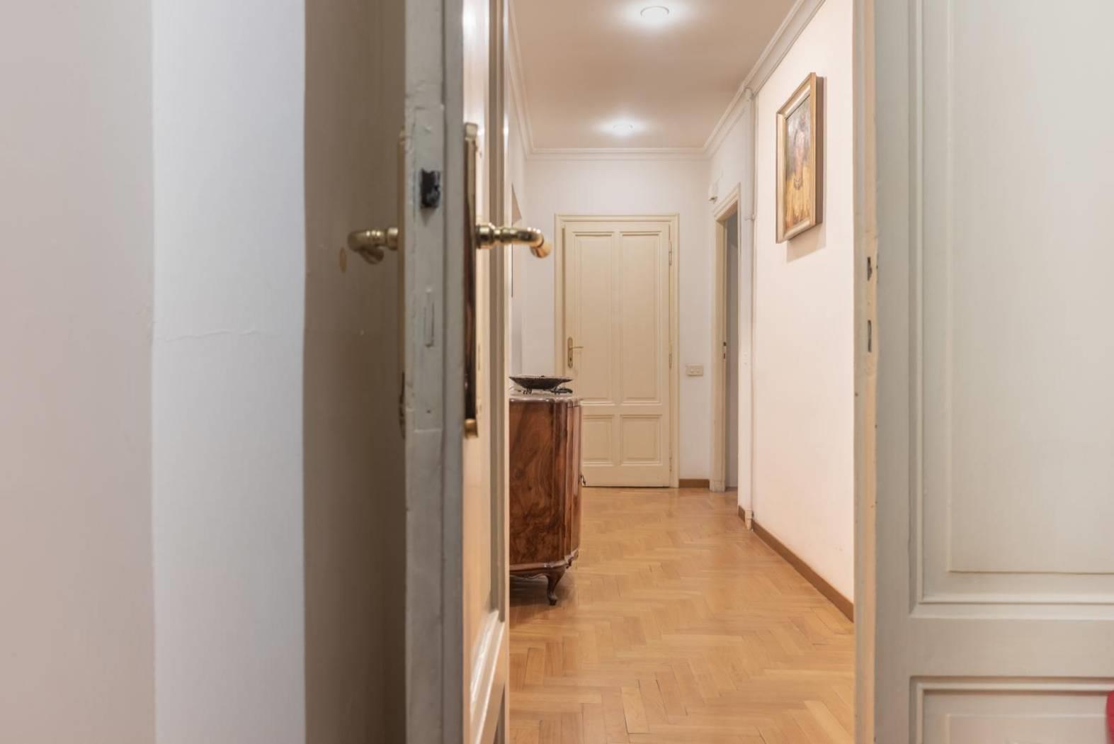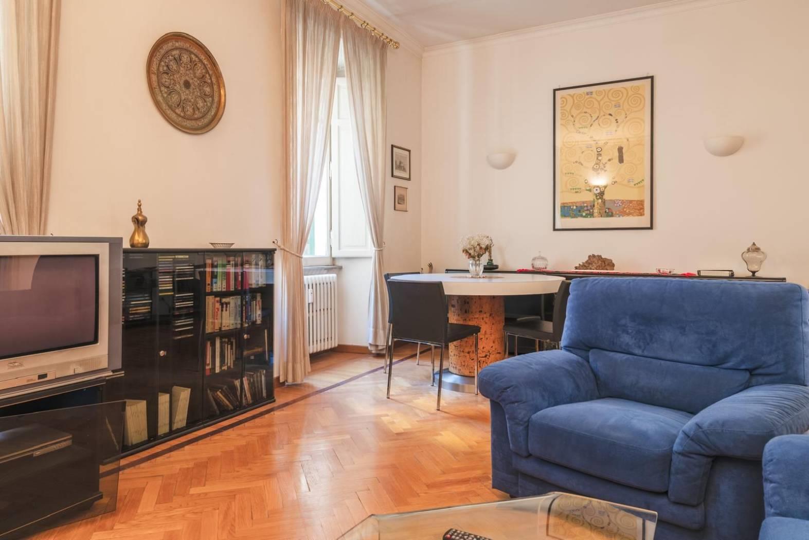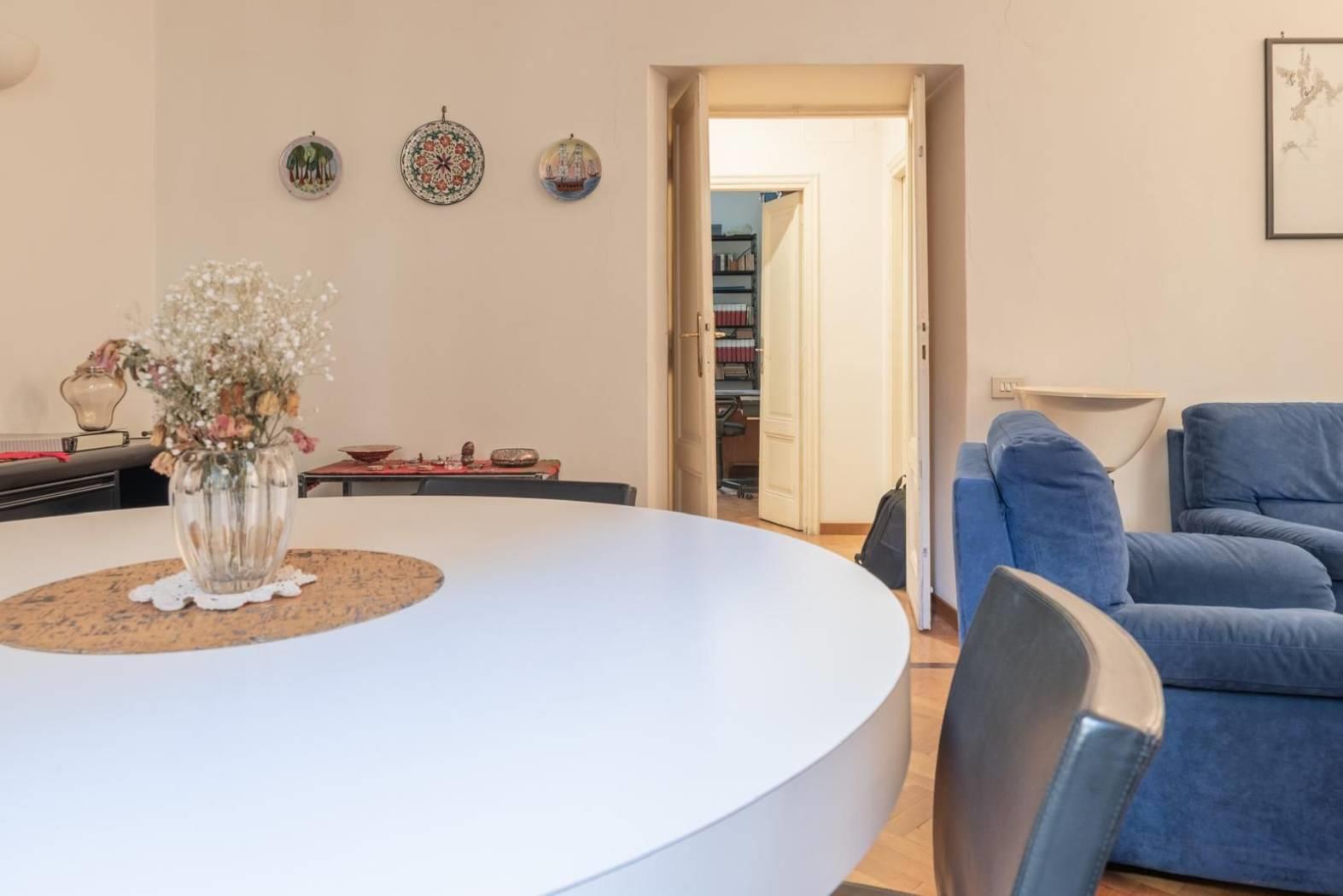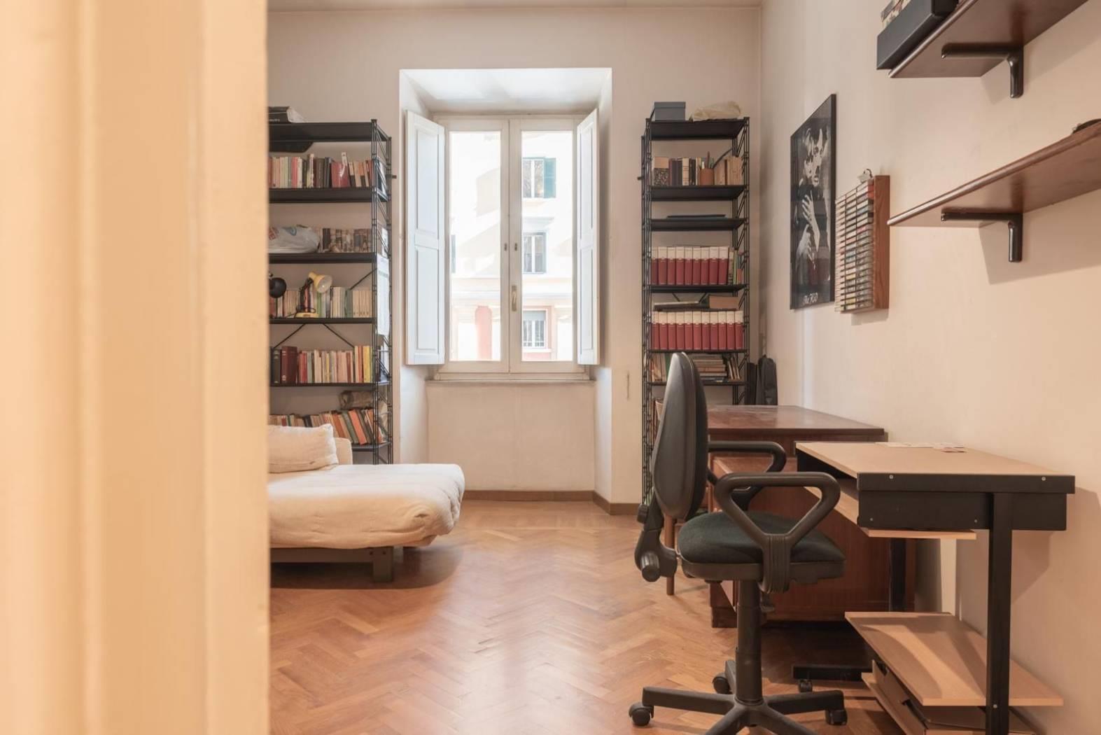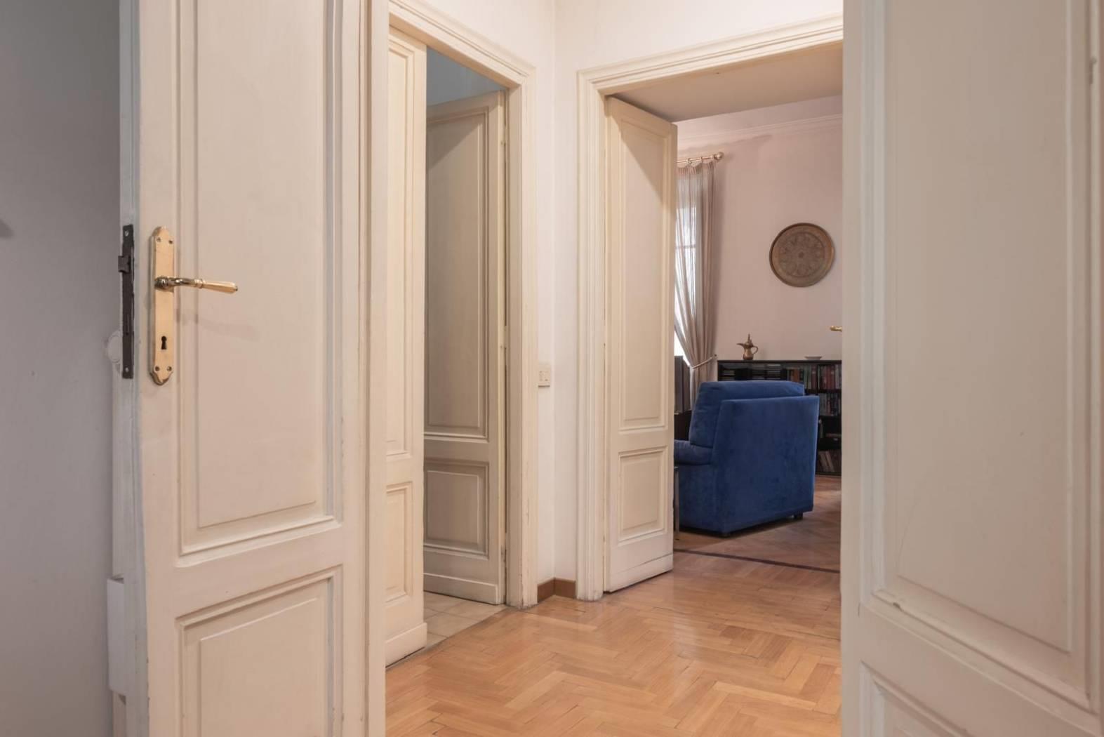 Ogni dettaglio racconta una storia: i pavimenti originali, le ampie finestre. È una casa che parla di eleganza senza tempo, perfetta per chi desidera vivere Roma in tutta la sua autenticità, tra palazzi storici, botteghe, ristoranti e le vie più suggestive del centro.