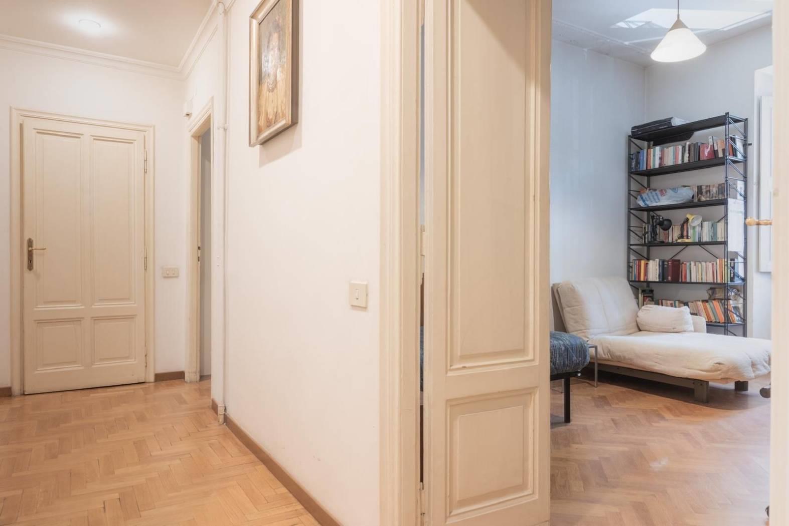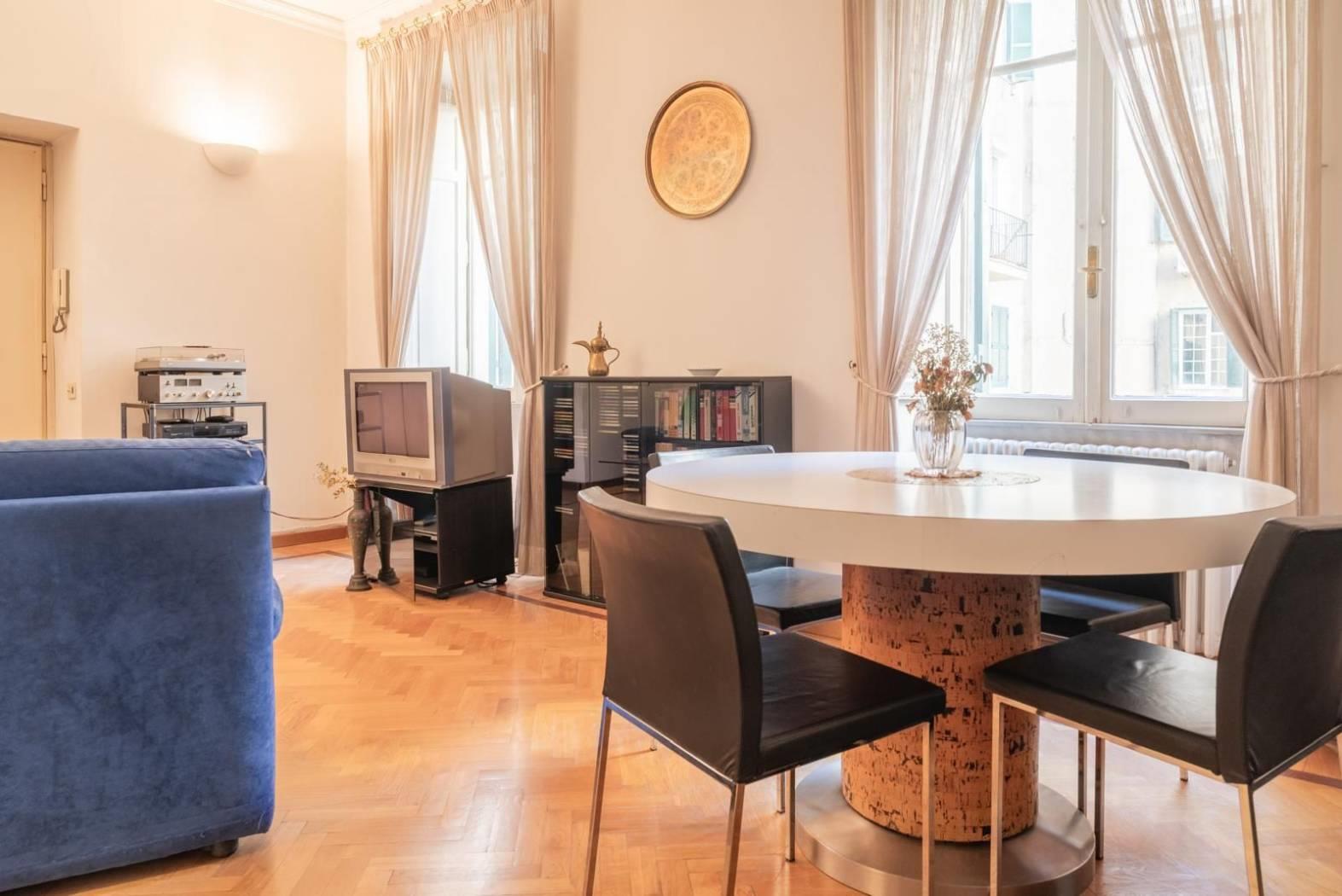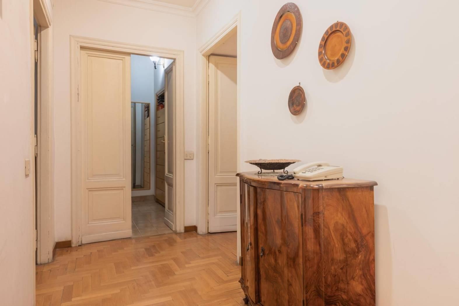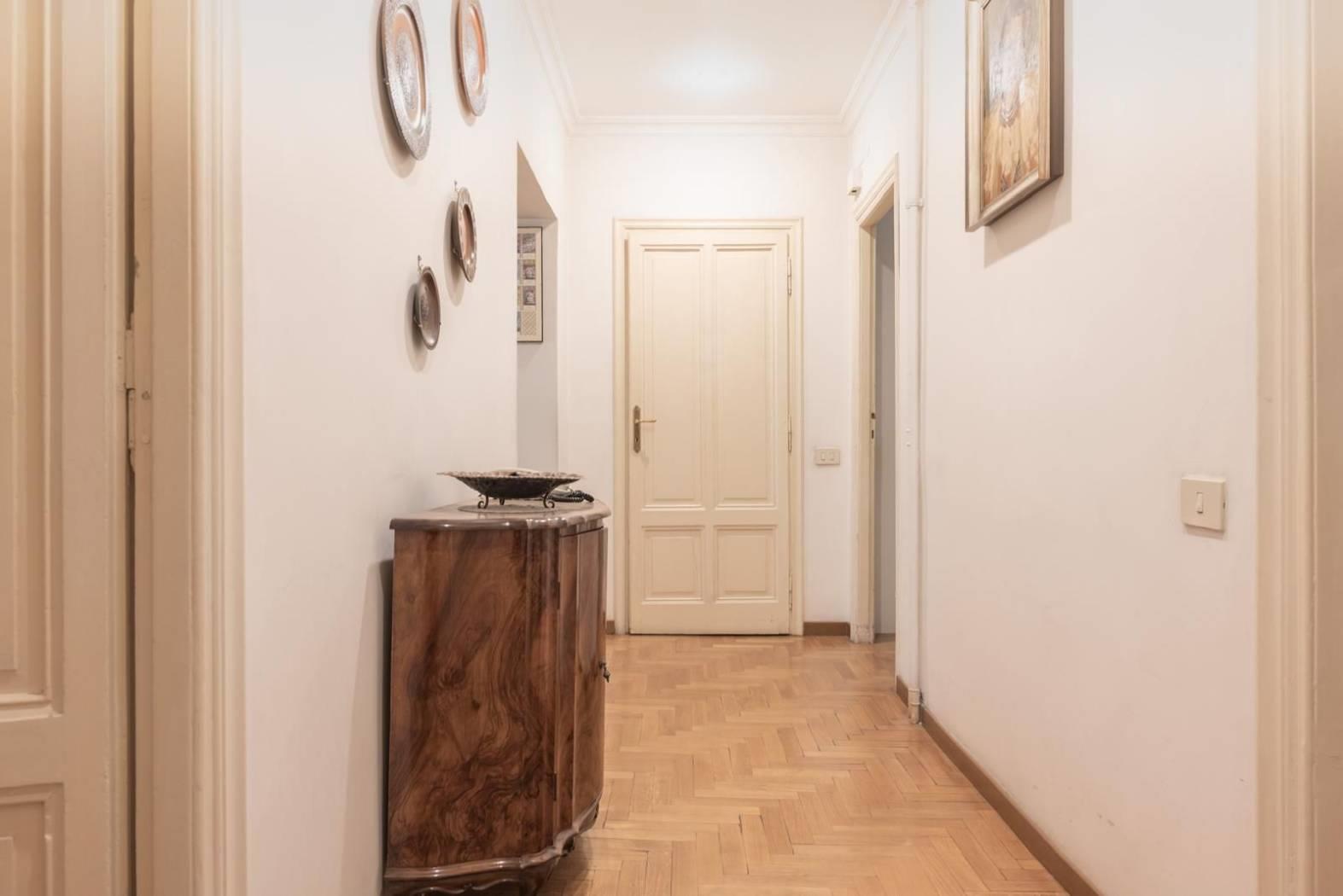 Ogni dettaglio racconta una storia: i pavimenti originali, le ampie finestre. È una casa che parla di eleganza senza tempo, perfetta per chi desidera vivere Roma in tutta la sua autenticità, tra palazzi storici, botteghe, ristoranti e le vie più suggestive del centro.