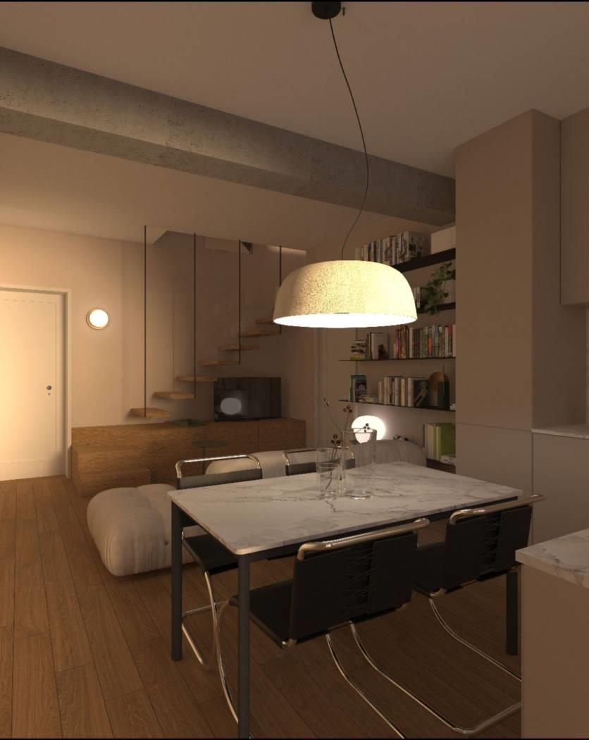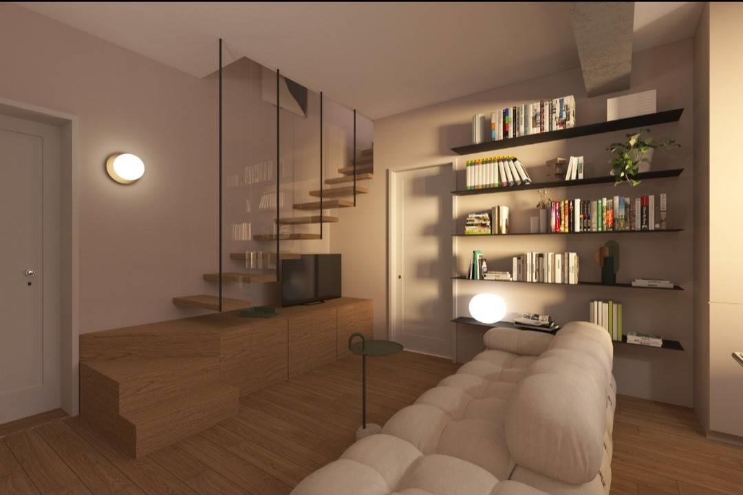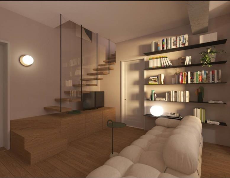 piano primo: soggiorno con cucina a vista con un gradevole balcone coperto, disimpegno, bagno, cabina armadio e camera da letto- scala interna di collegamento dal soggiorno al piano superiore dove troviamo un unico ambiente camera, un bagno, una grande terrazza di circa 27 mq e un altro piccolo bacone e locale tecnico
