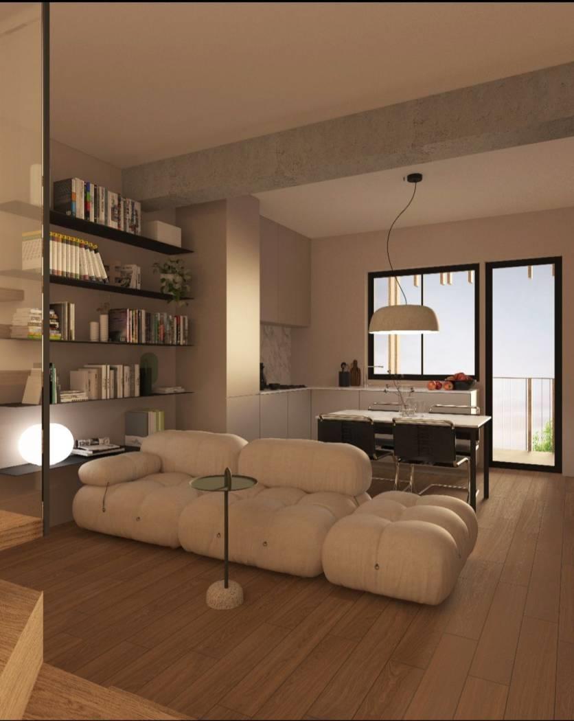 piano terra: ingresso con cancelletto e piccola corte di proprieta' esclusiva di circa 18 mq- soggiorno con cucina a vista, disimpegno, bagno, cabina armadio e camera da letto