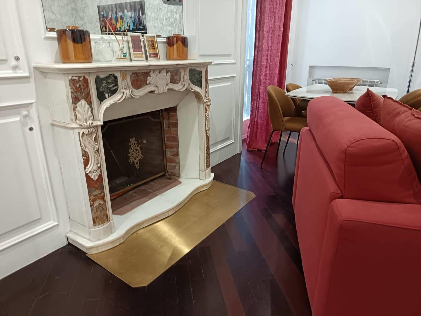 The apartment welcomes you with a bright living area enhanced by a fireplace, perfect for warm and convivial atmospheres, complemented by a refined dining space. The sleeping area features an elegant and quiet bedroom, while the marble bathroom with shower reflects a timeless and discerning taste. The separate, windowed kitchen is fully equipped and seamlessly integrated into the layout.