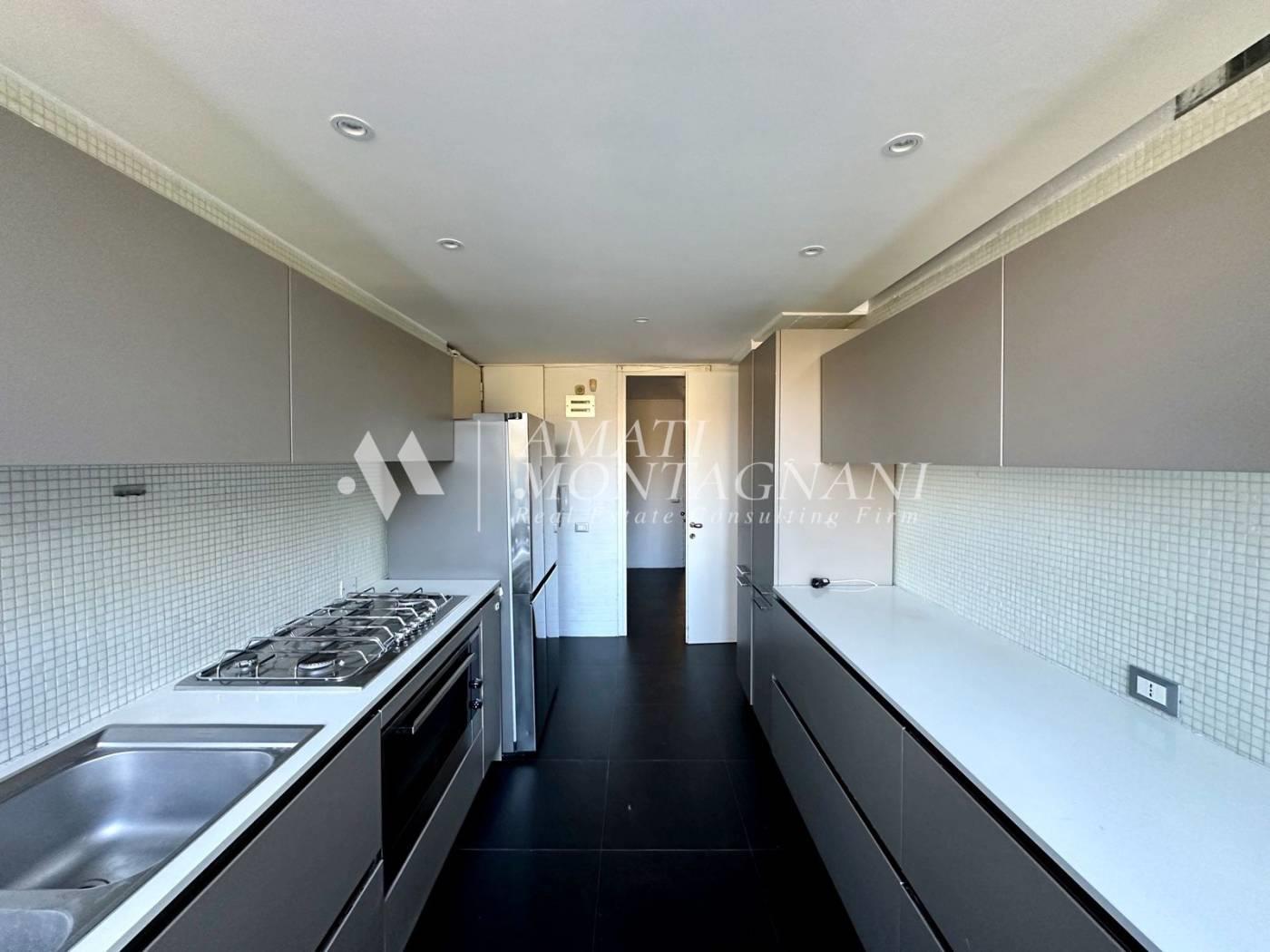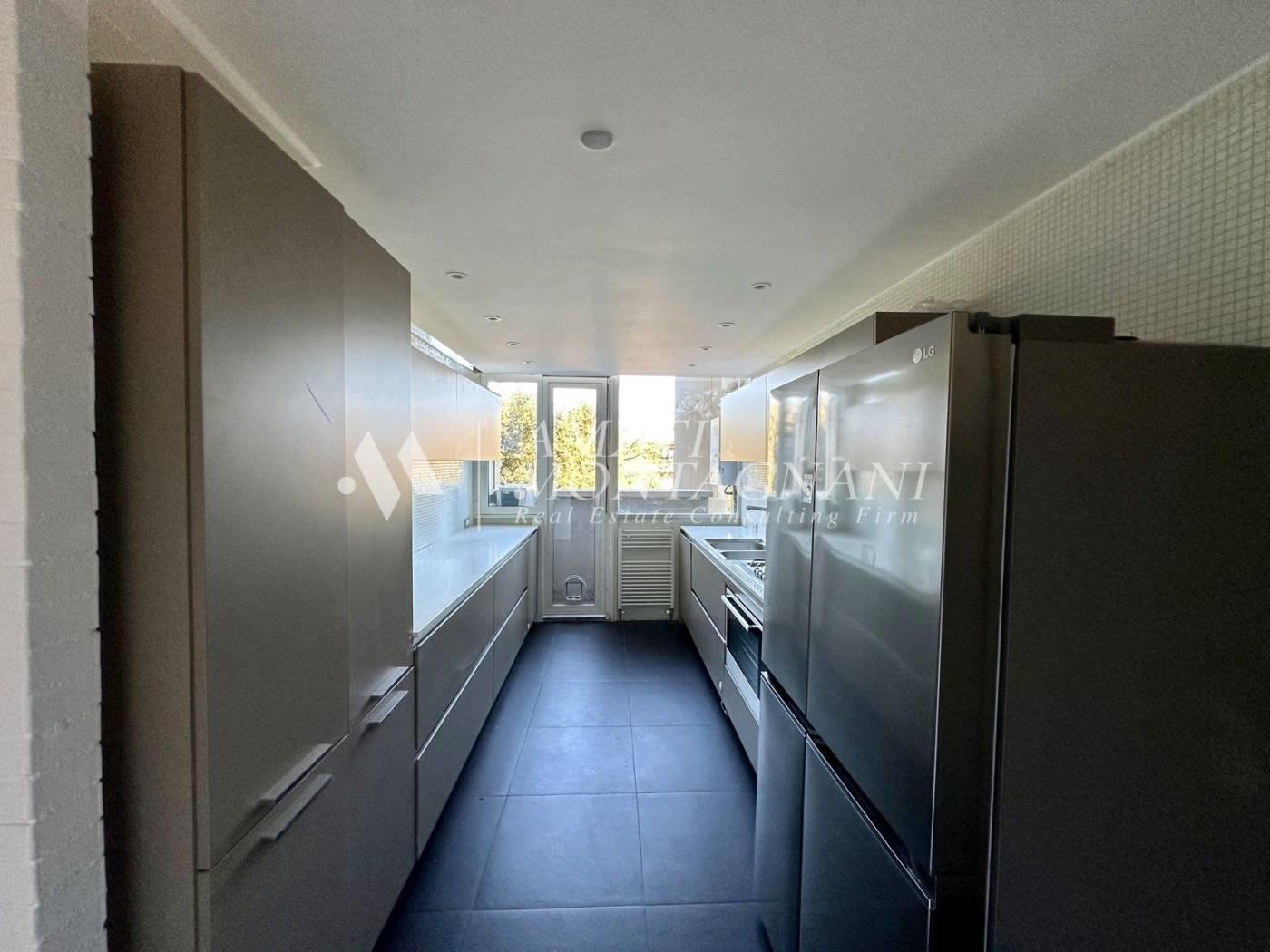 La zona servizio è altamente funzionale e comprende una spaziosa cucina completamente attrezzata con balcone e un ingresso indipendente al piano, oltre una piccola camera di servizio e un terzo bagno, perfetto anche per gli ospiti.