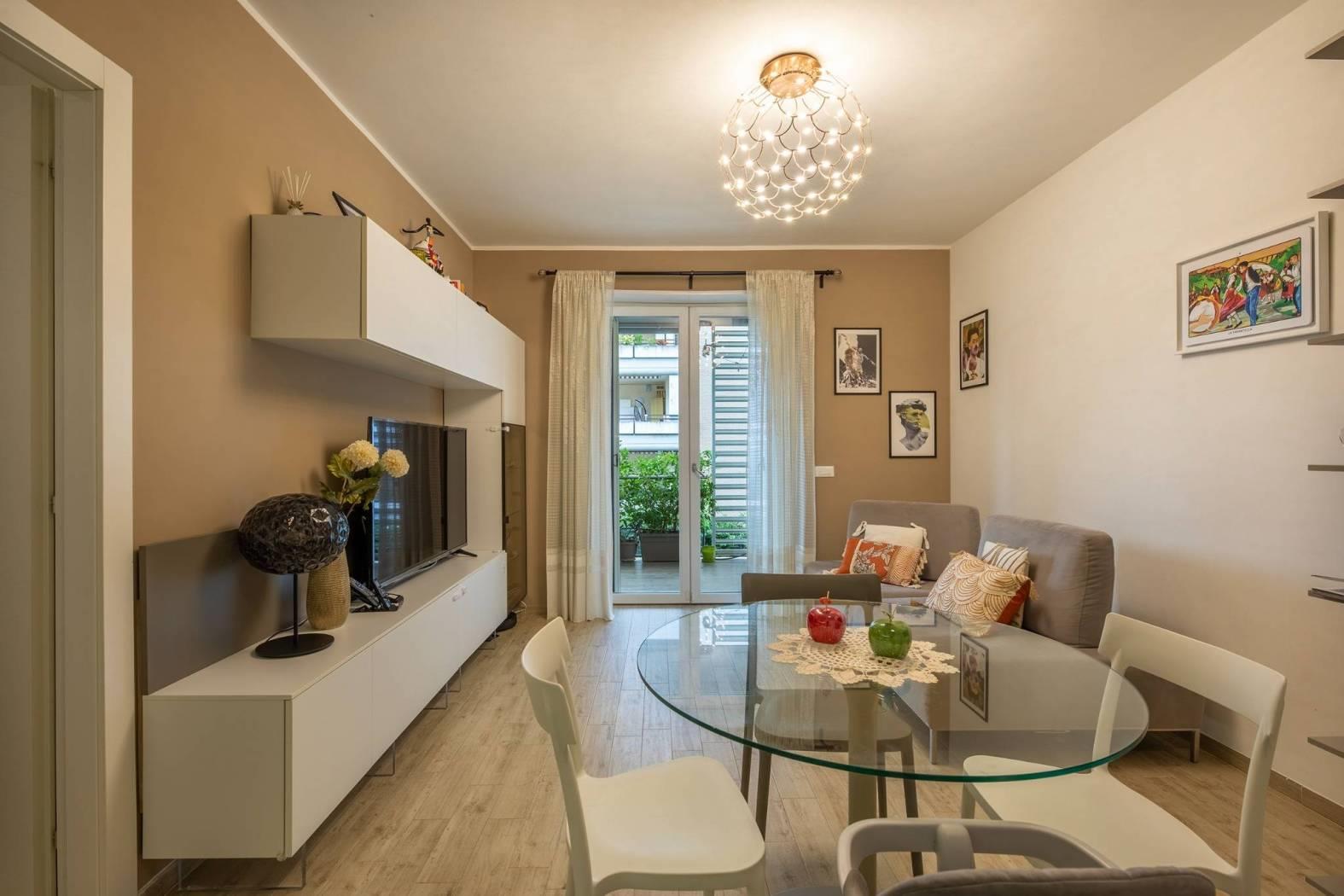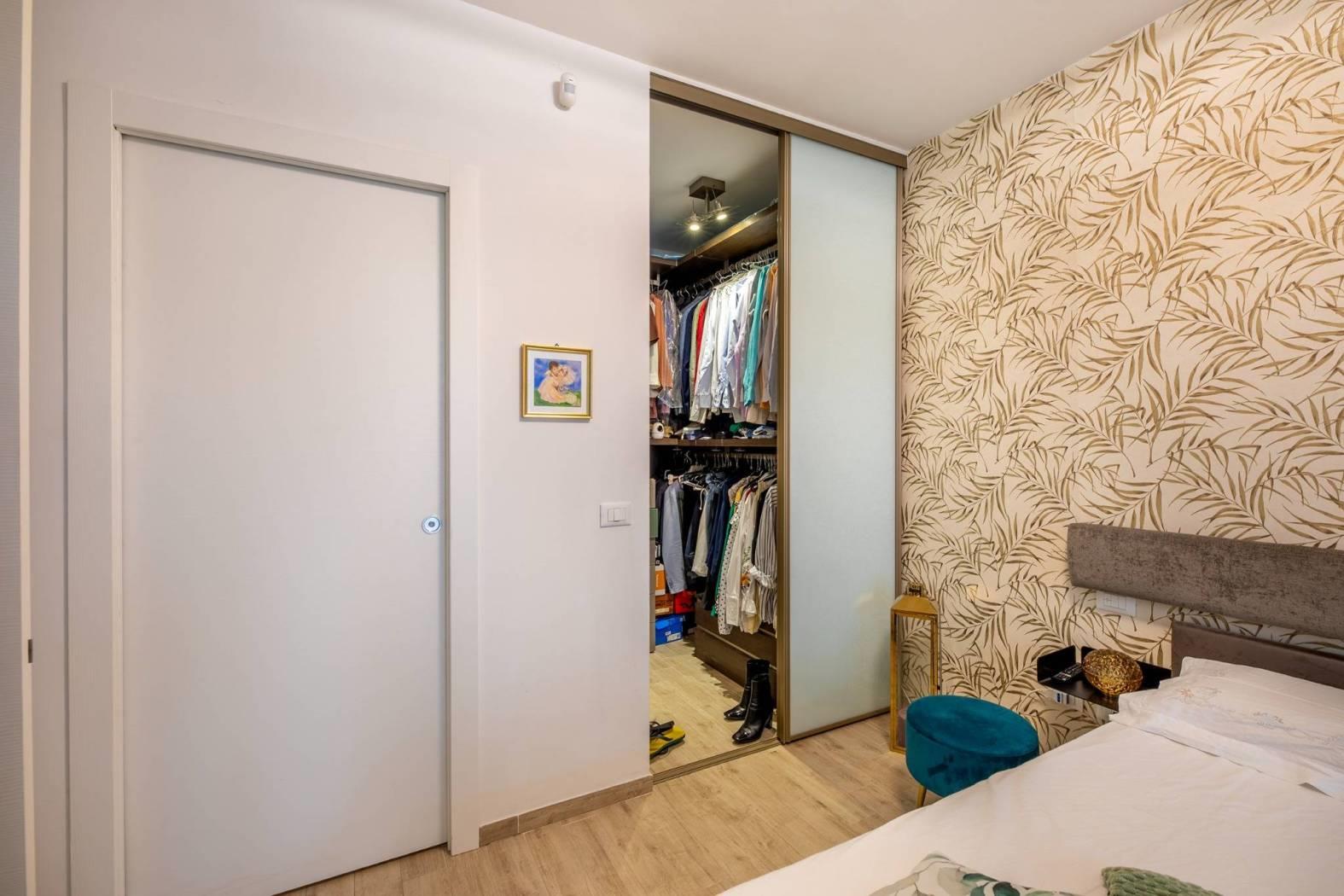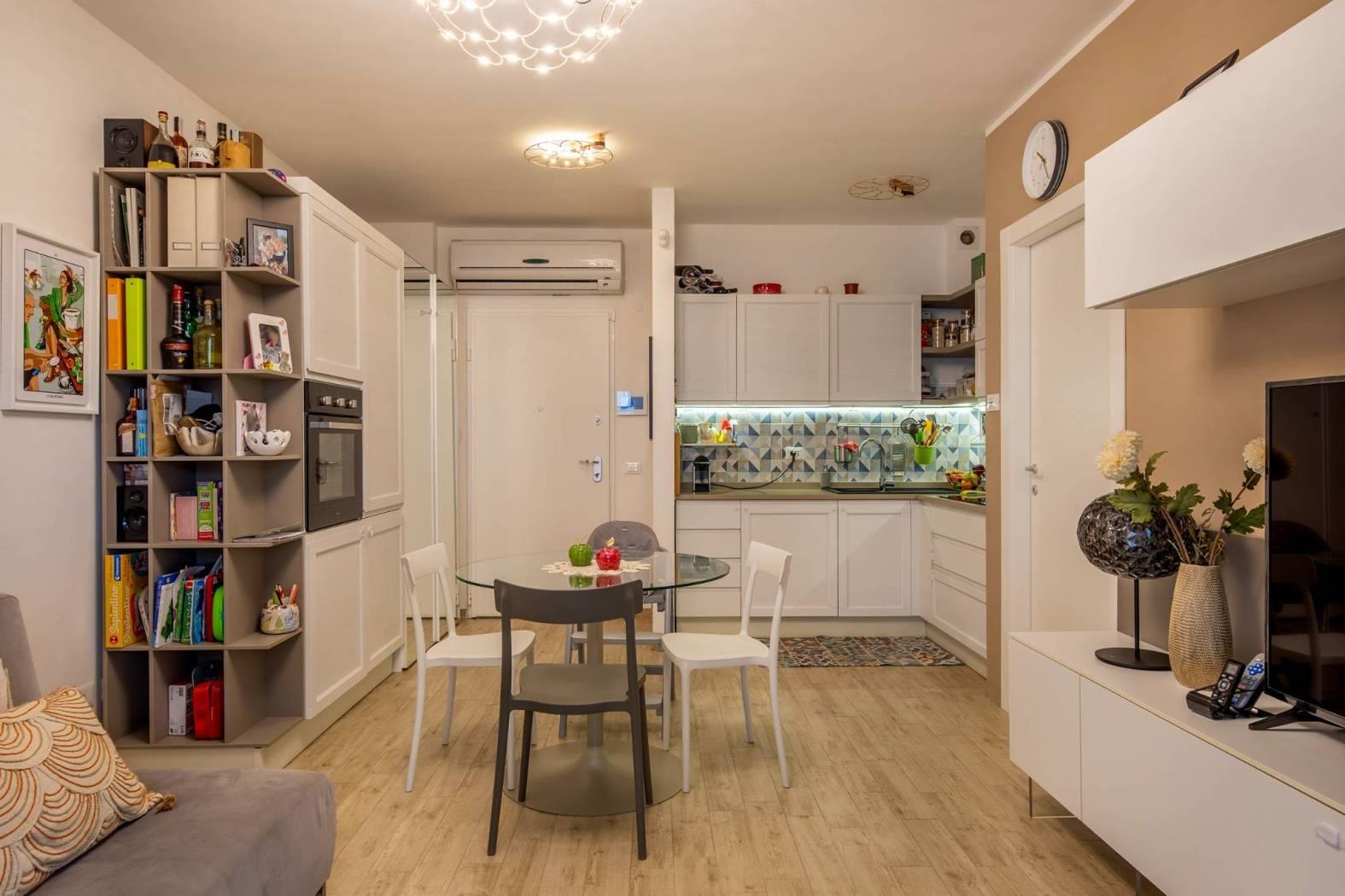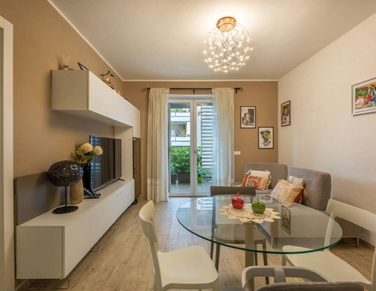 ingresso, soggiorno con cucina a vista, 2 camere da letto di cui una con cabina armadio, 2 bagni con finestra, , Ampia terrazza coperta di 25 mq perfetta per i momenti di relax e convivialità, con accesso dal soggiorno, tende parasole e con due armadiature esterne adibite a lavanderia e ripostiglio.