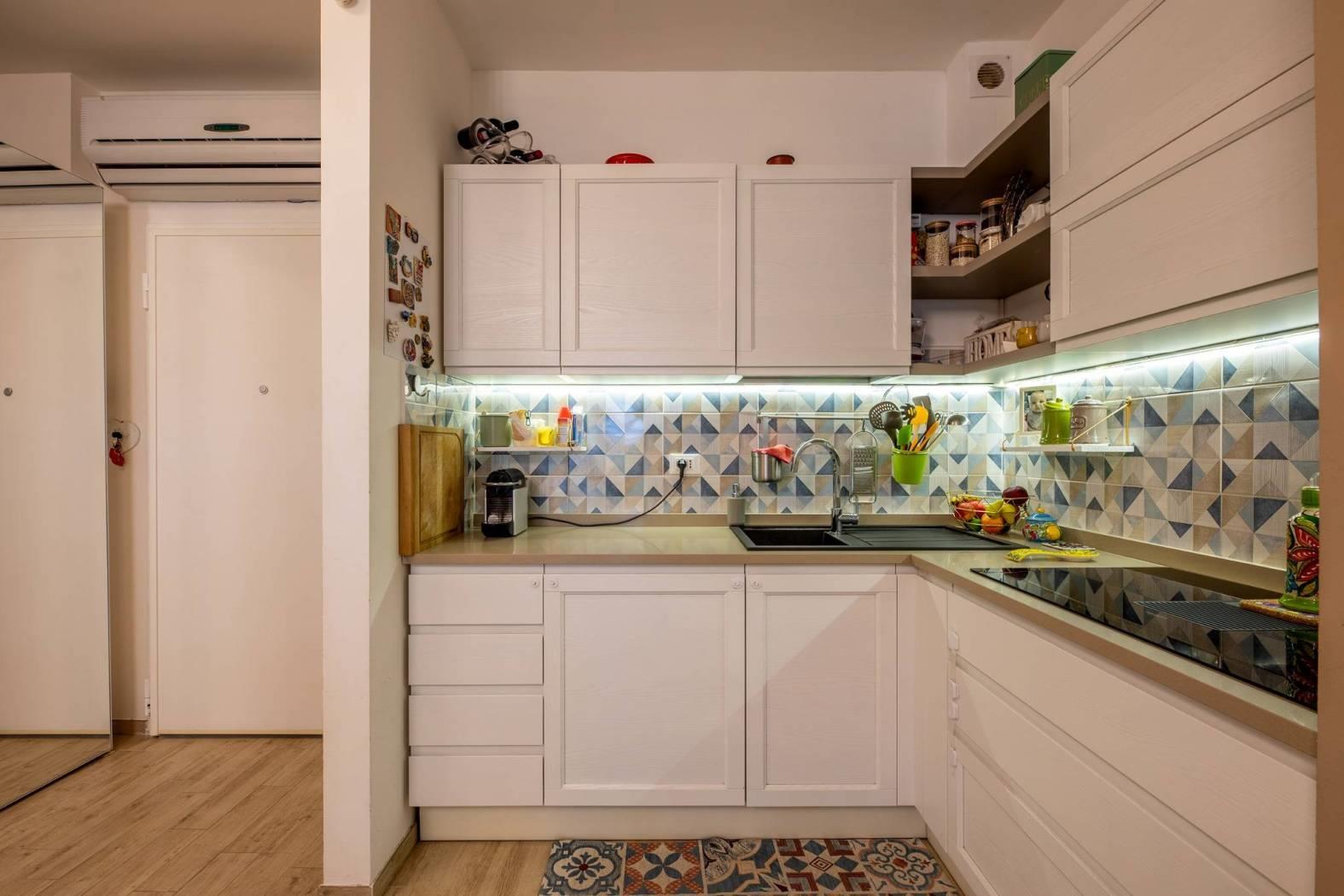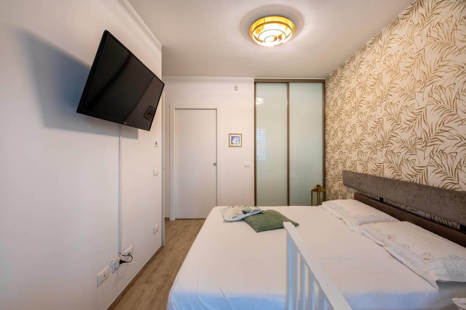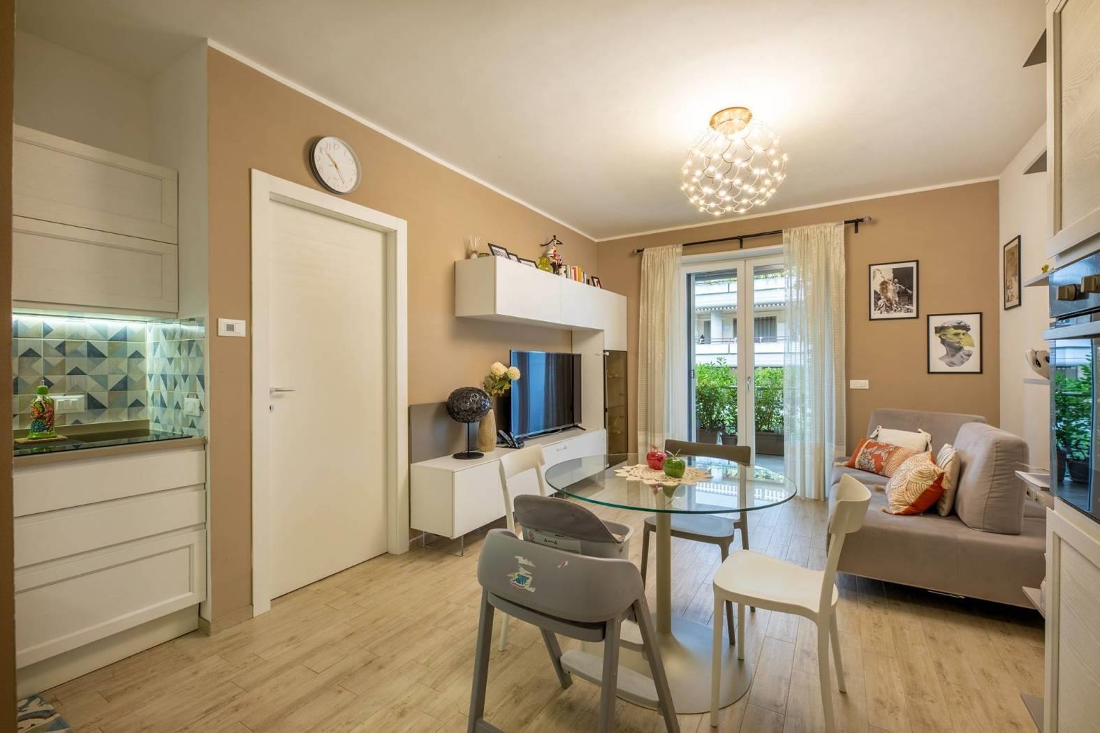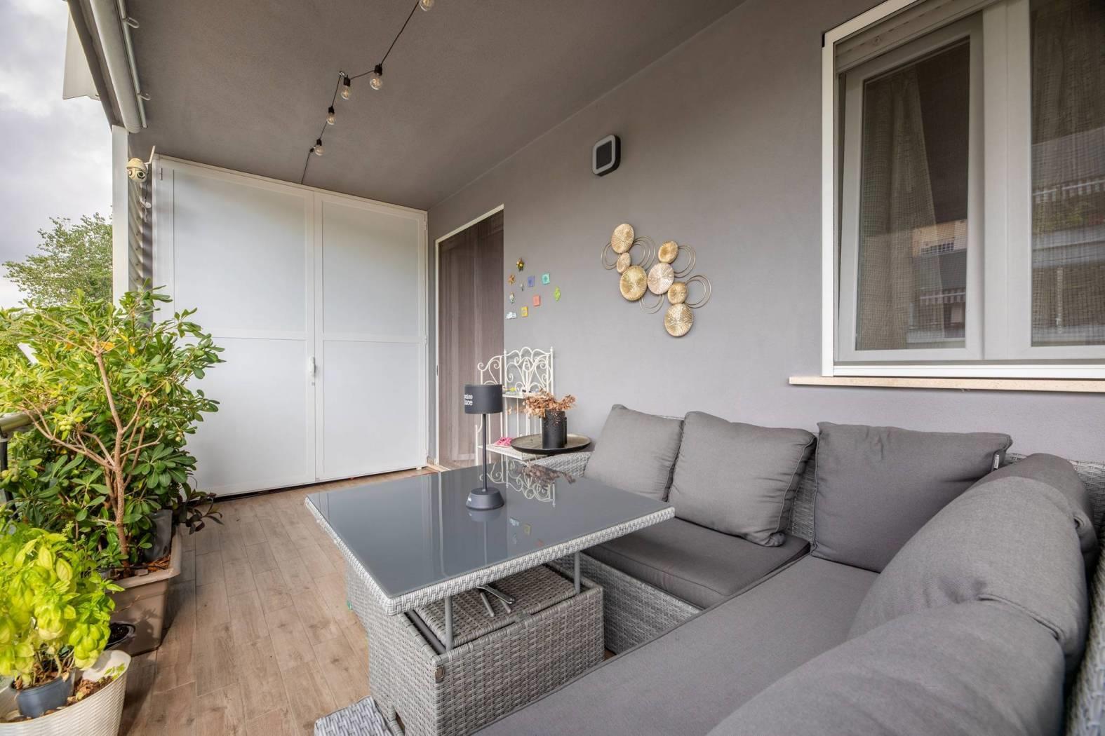 ingresso, soggiorno con cucina a vista, 2 camere da letto di cui una con cabina armadio, 2 bagni con finestra, , Ampia terrazza coperta di 25 mq perfetta per i momenti di relax e convivialità, con accesso dal soggiorno, tende parasole e con due armadiature esterne adibite a lavanderia e ripostiglio.