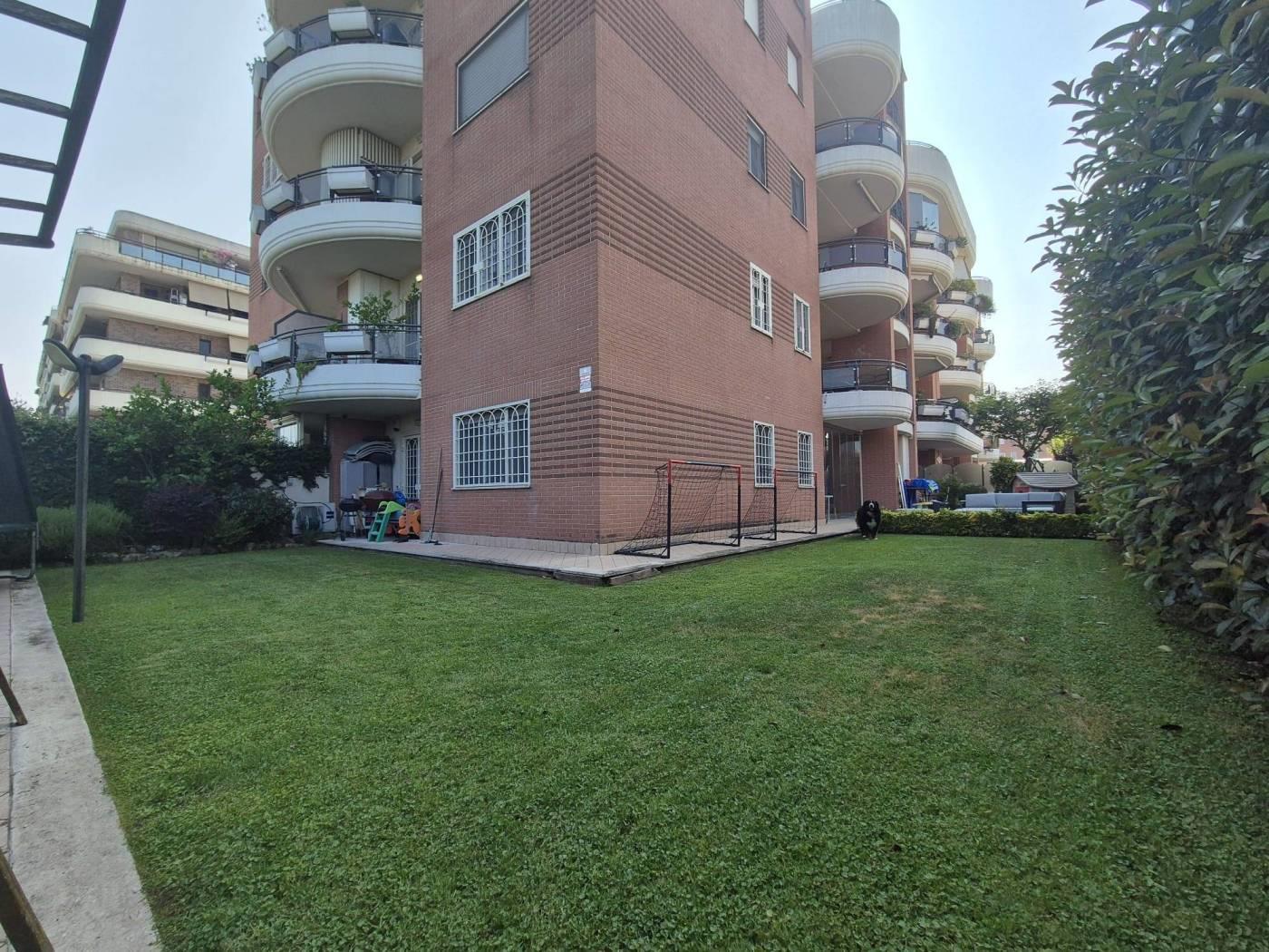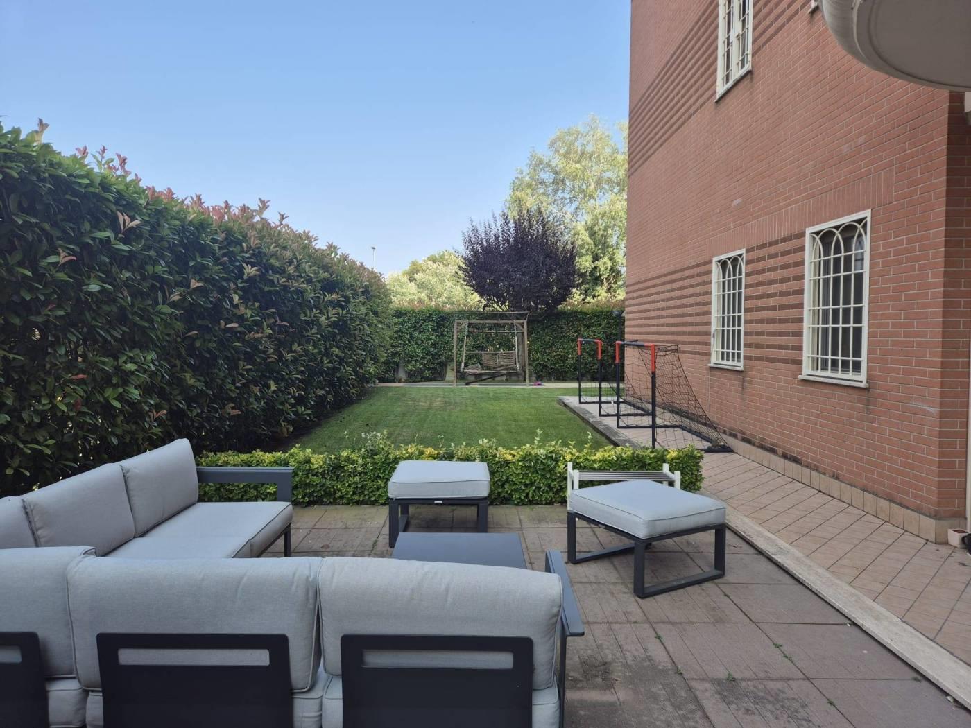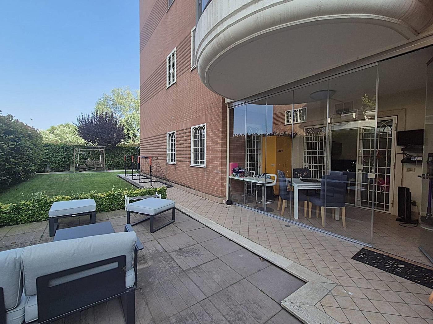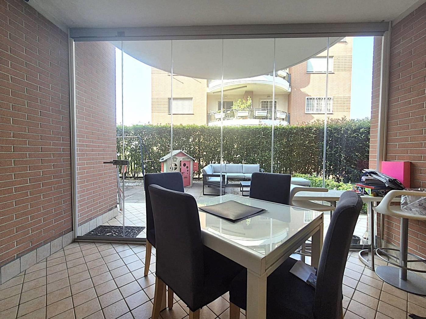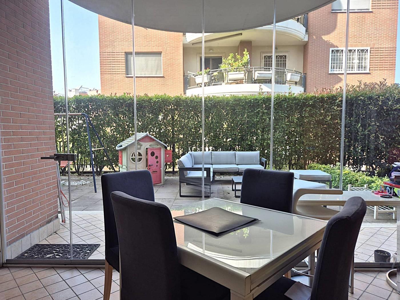 All'interno di un Contesto Residenziale Riservato e Tranquillo, Circondato da Giardini ben Curati ed Area Verde per bambini, Proponiamo la Vendita di un interessantissimo Appartamento in ottime Condizioni di Manutenzione posto al Piano Terra di una Palazzina in cortina di soli 4 piani con Esclusivo Giardino perimetrale(mq 250circa)così suddiviso: Soggiorno a vista, Cucina Semi-Abitabile, Due(2) Camere Matrimoniali, Doppi Servizi con finestra, comoda Lavanderia esterna Cantina, Box Auto mq 18(con ascensore che porta direttamente alla zona garage) Videocitofono, Termoautonomo. No Barriere architettoniche. Note: La Proprietà ha ottimizzato gli spazi esterni creando un ulteriore ambiente applicando una Vetrata Scorrevole che divide un ampio Patio dal Giardino Perimetrale. Ubicato a poca distanza dai maggiori servizi Urbani e Commerciali di prima necessità(VEDERE GOOGLE MAPS).