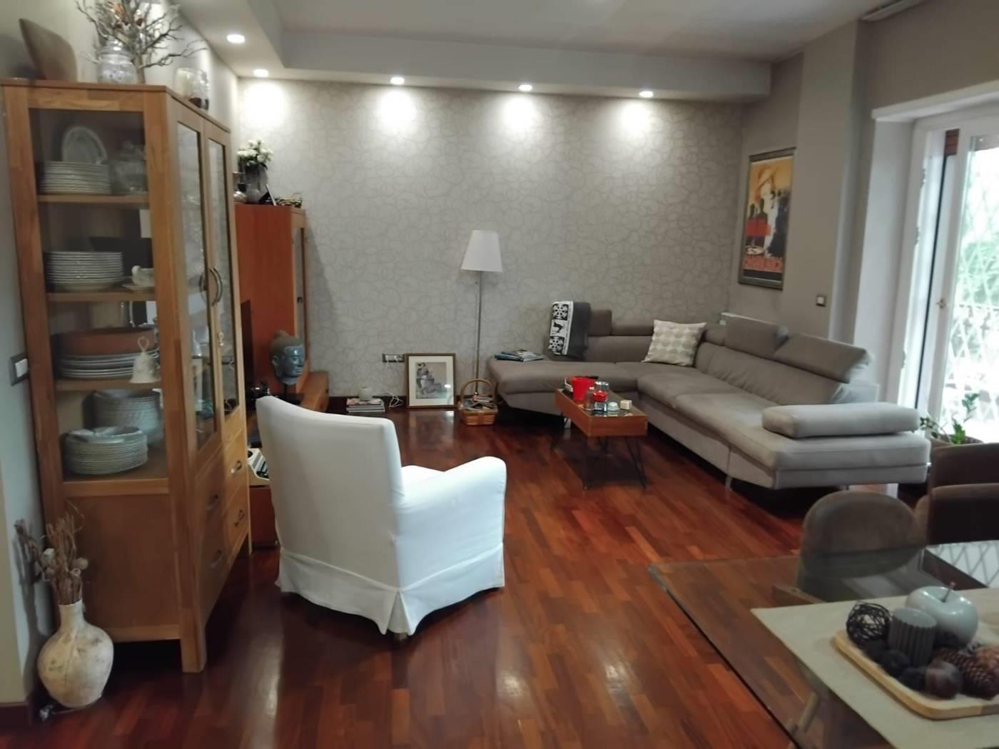 In contesto residenziale proponiamo in vendita appartamento di mq. 160 commerciali e 130 mq. calpestabili, servito da box auto (20 mq. c.ca). La proprietà situata al 1° piano di un elegante condominio, con aree verdi e giardini molto curati (su un lato affaccio come 2°/sull’altro piano terra), gode di una doppia esposizione ed è composta da ampio ingresso, salone, cucina abitabile, 3 camere, 2 bagni finestrati, zona lavanderia e due terrazze di cui una coperta dalla quale si accede comodamente sia dal salone che dalla cucina e l'altra con giardino pavimentato.