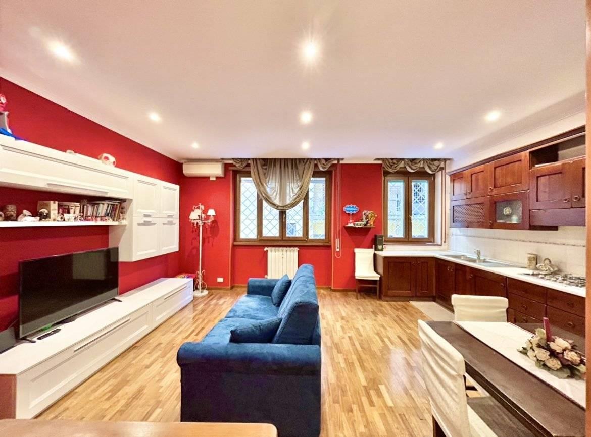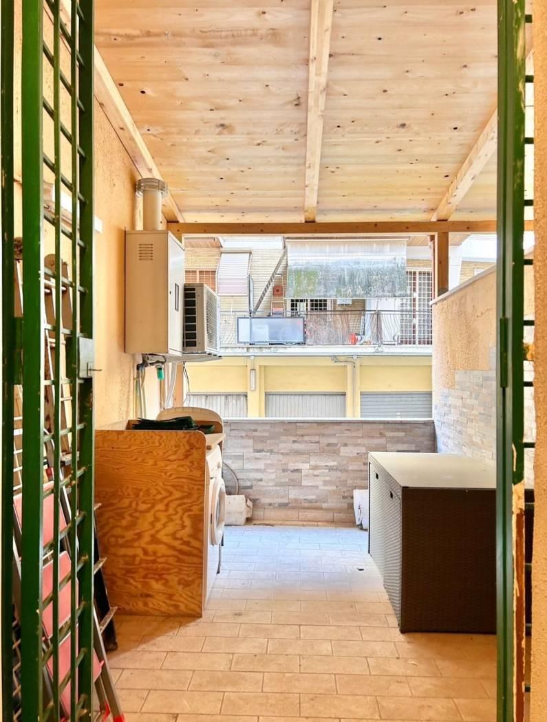 ingresso: salone ampio (con affaccio esterno) con angolo cottura in linea completo (forno, lavastoviglie, pensili ecc. ) disimpegno con soppalco uso ripostiglio, 2 ampie camere (con affaccio 1 esterno e 1 all'interno) 1 servizio 1 studiolo (circa 6 mq con soffitti alt; peraltro facilmente trasformabile in secondo bagno) dal cui accesso si esce al terrazzino abitabile (ove e' collocata anche la lavatrice). Pavimenti in parquet (salone) e mattonellato/gress(nelle camere). La casa e' ristrutturata, le finestre hanno doppio vetro, zanzariere e grate esterne.