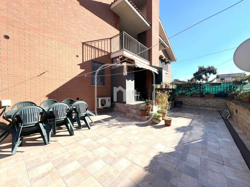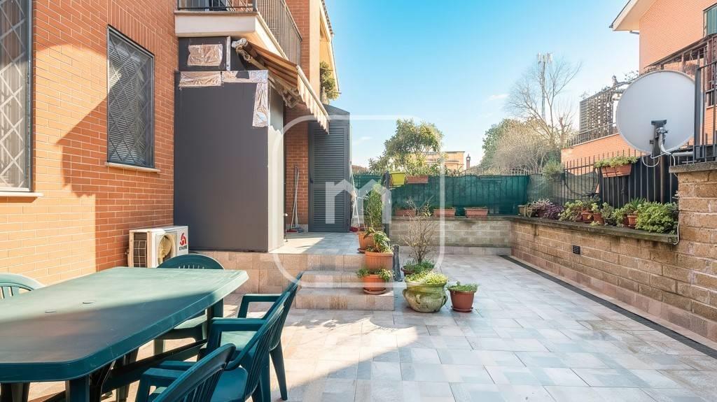 Terrazzo e giardino, in parte verde e in parte mattonato, perfetti per pranzi all’aperto, relax o per famiglie con bambini.