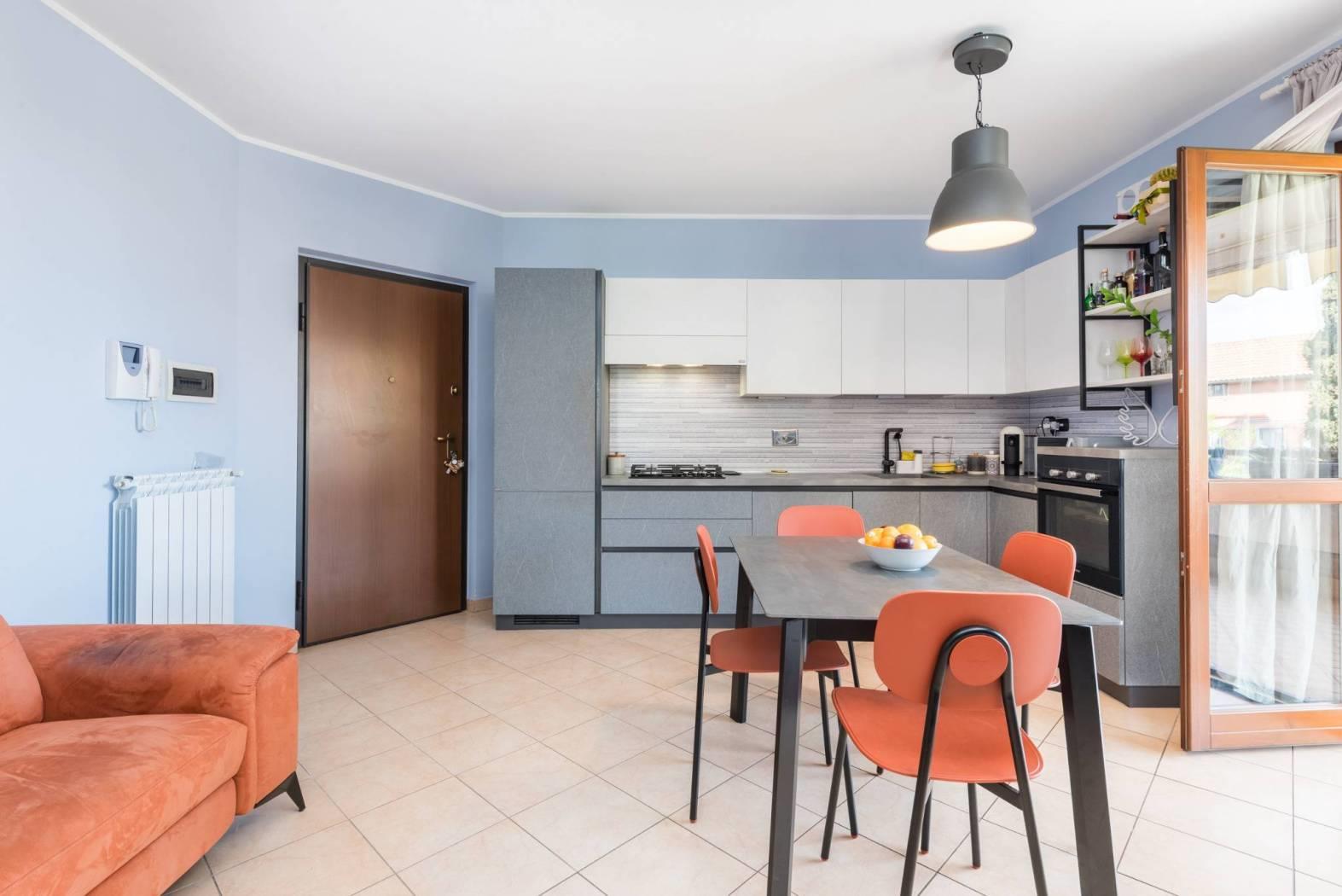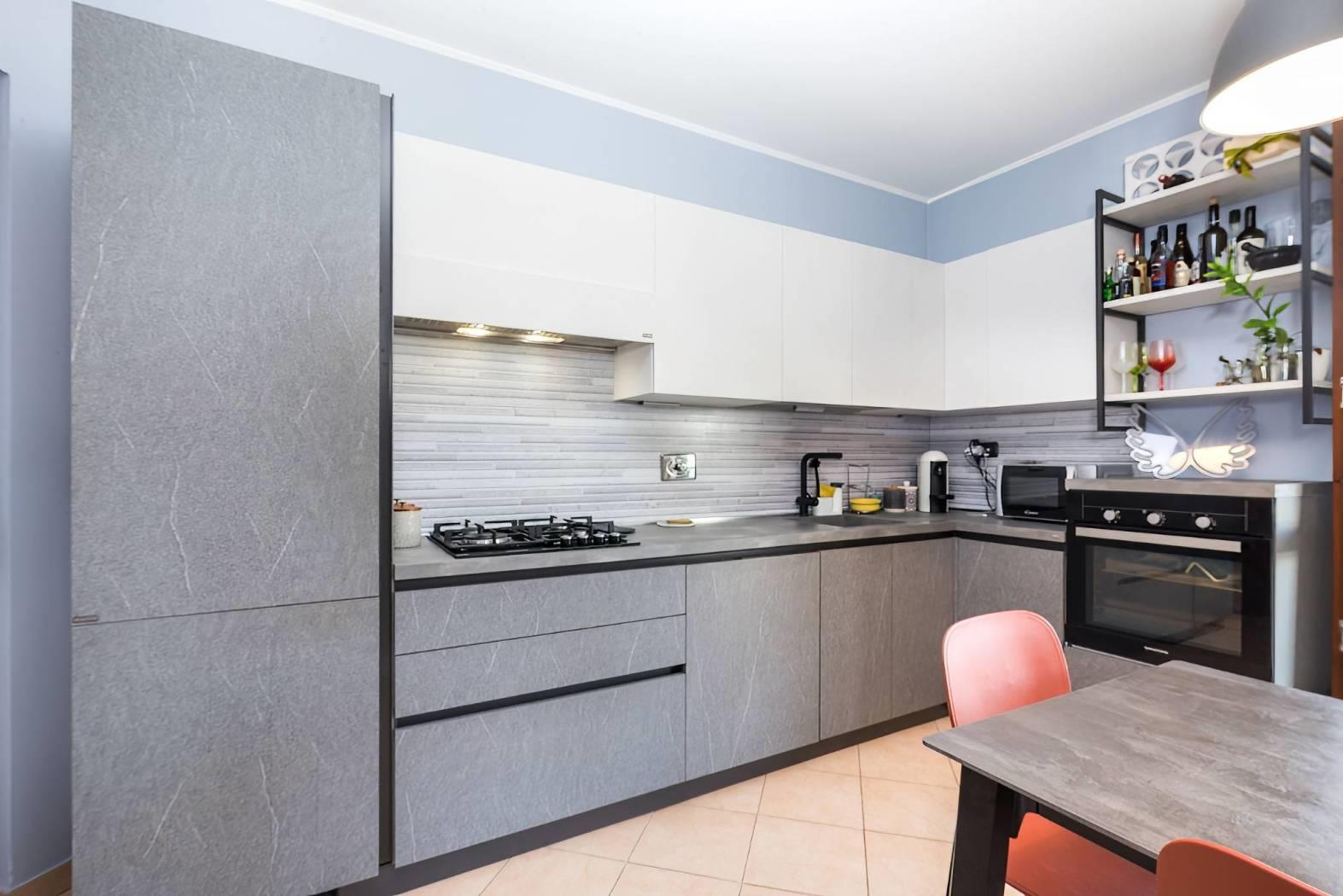 La cucina a vista si integra perfettamente con la zona living, creando un ambiente contemporaneo e raffinato.