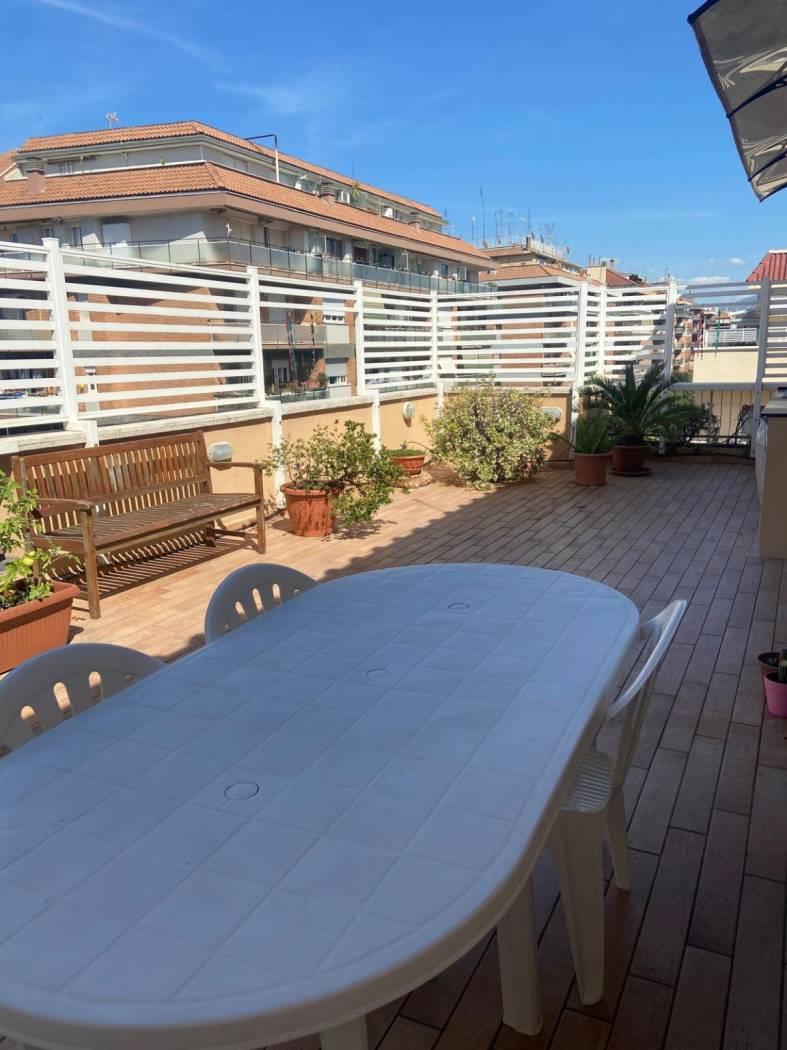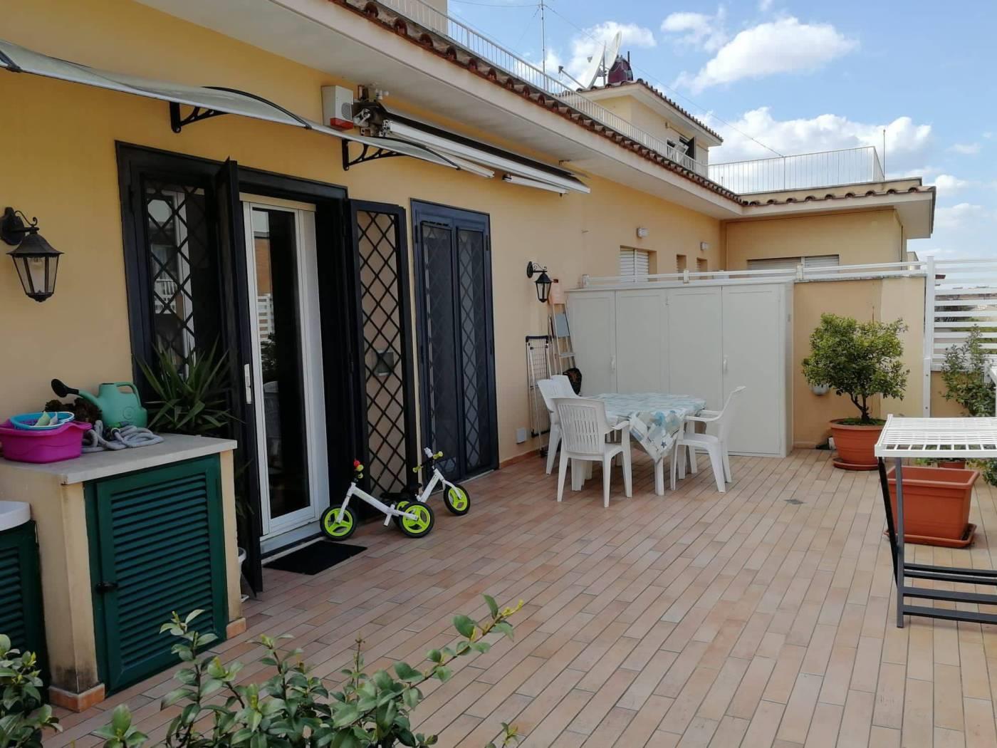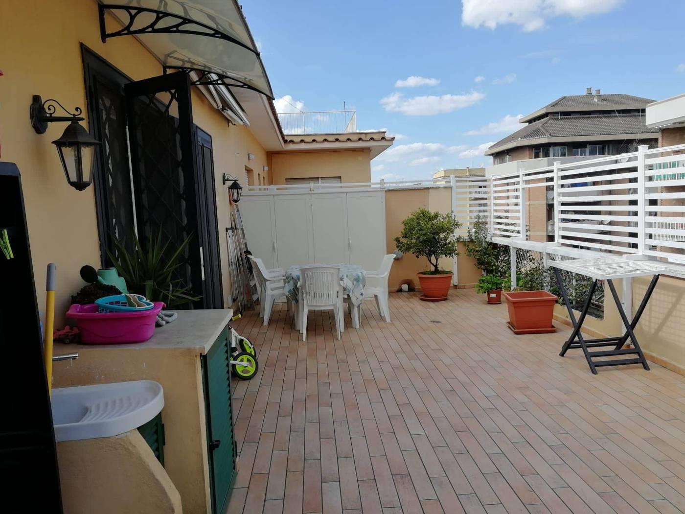 Attualmente l'attico si presenta con un salone a vista ed angolo cottura nella zona giorno, dal quale si accede ad uno splendido terrazzo di circa 60 mq, nella zona notte sono situate invece la camera da letto matrimoniale, cameretta ed il bagno. Completa la proprietà una comoda soffitta.