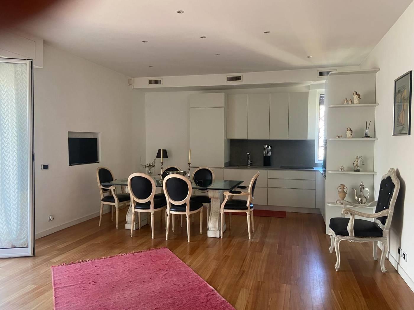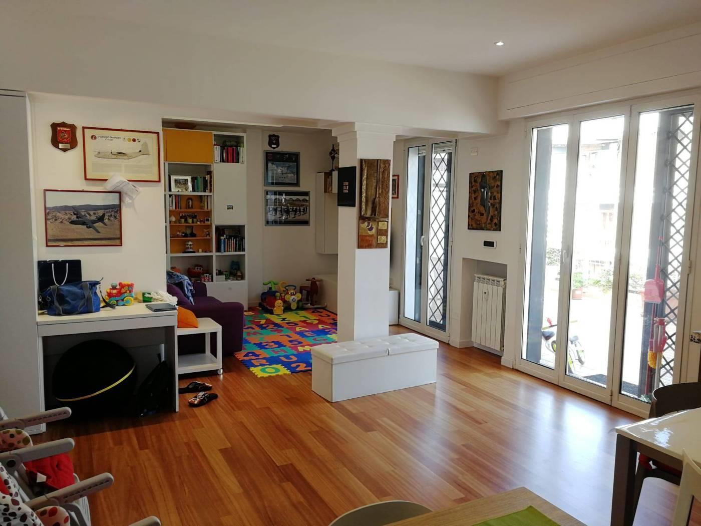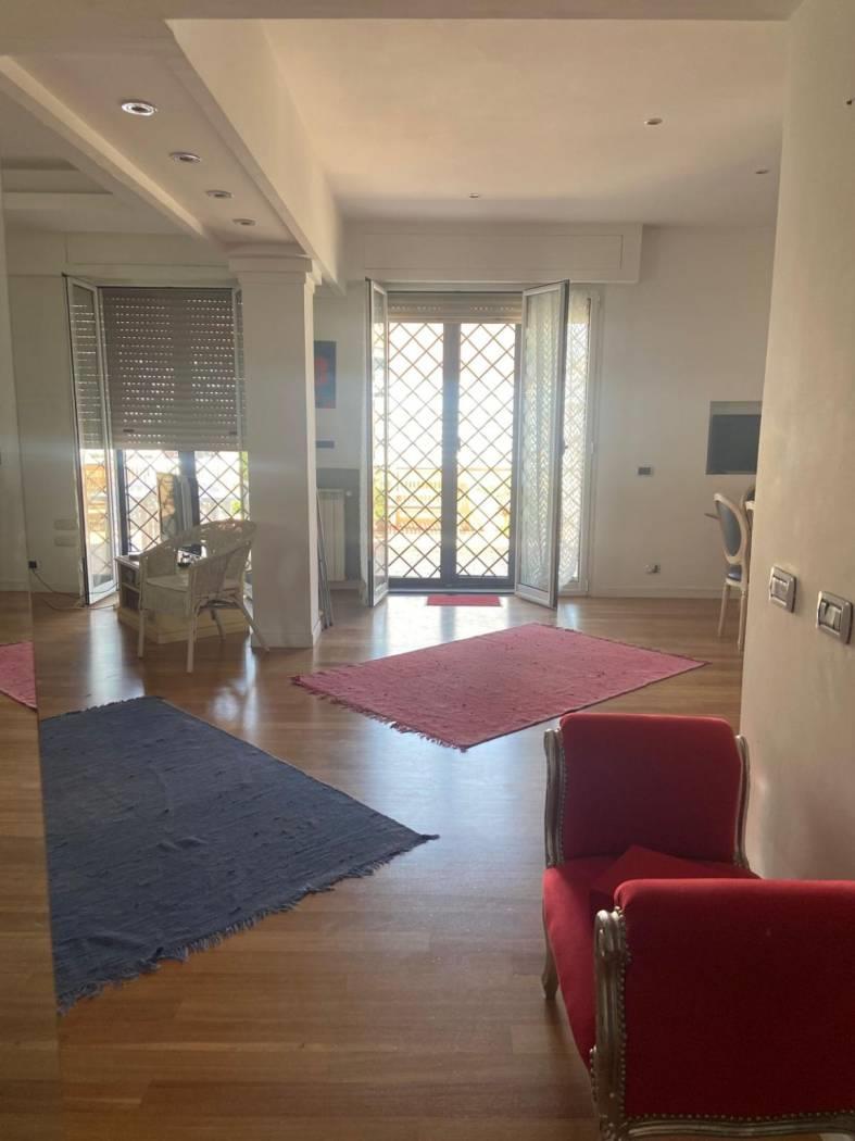 Attualmente l'attico si presenta con un salone a vista ed angolo cottura nella zona giorno, dal quale si accede ad uno splendido terrazzo di circa 60 mq, nella zona notte sono situate invece la camera da letto matrimoniale, cameretta ed il bagno. Completa la proprietà una comoda soffitta.