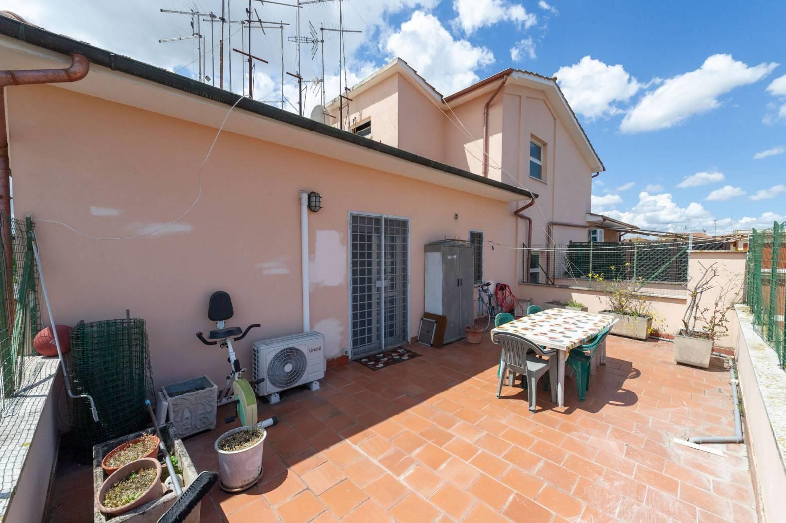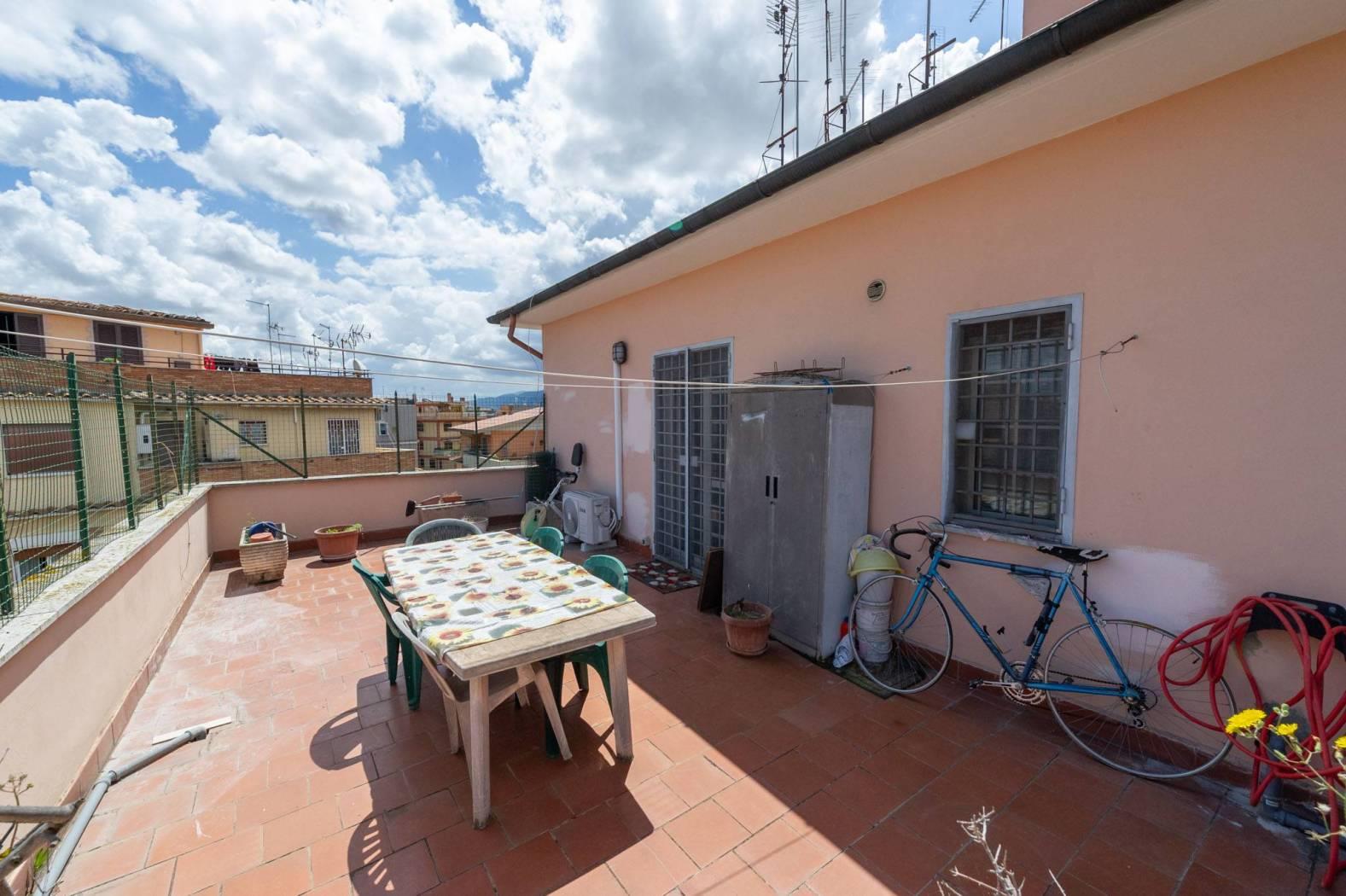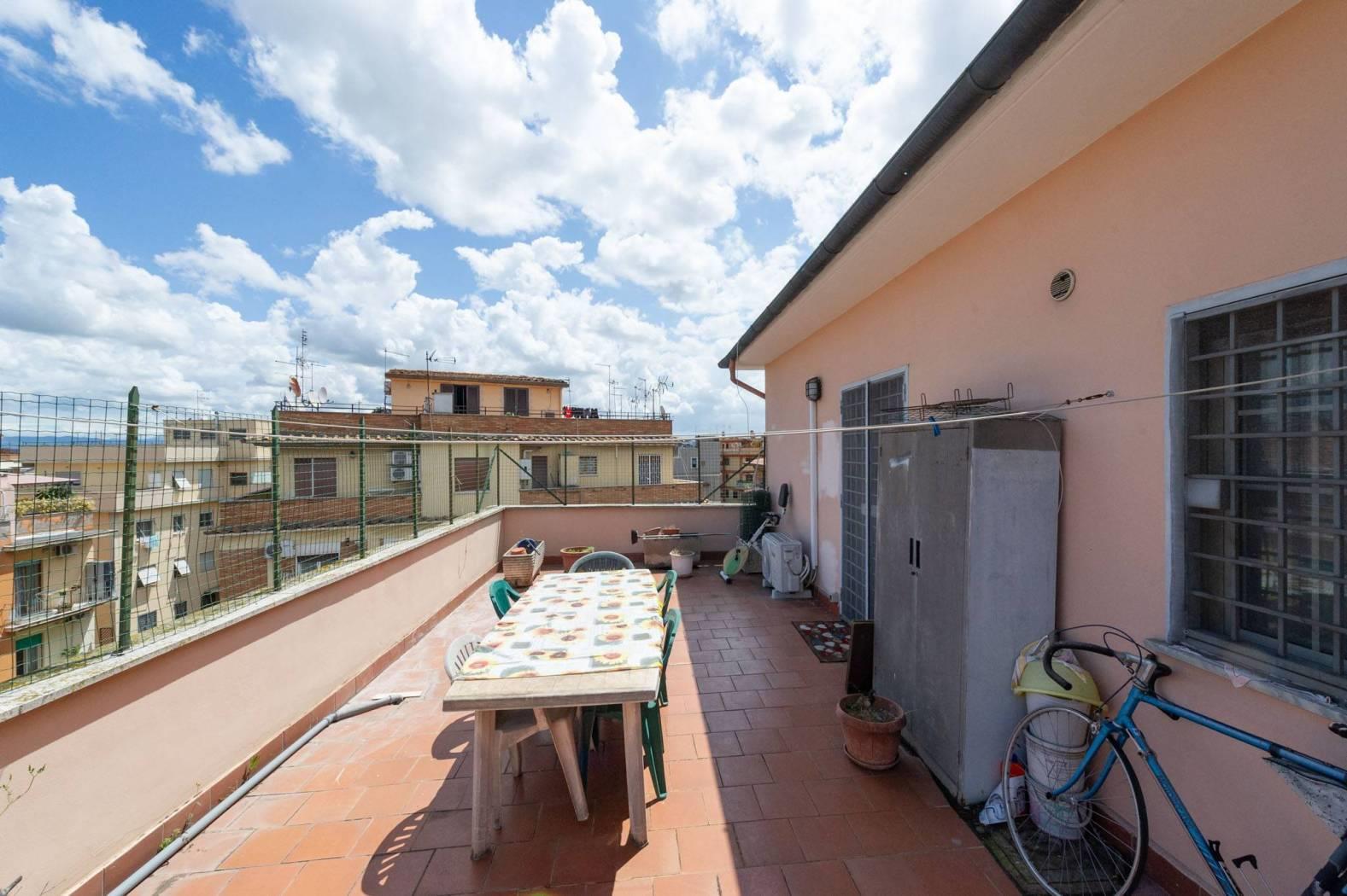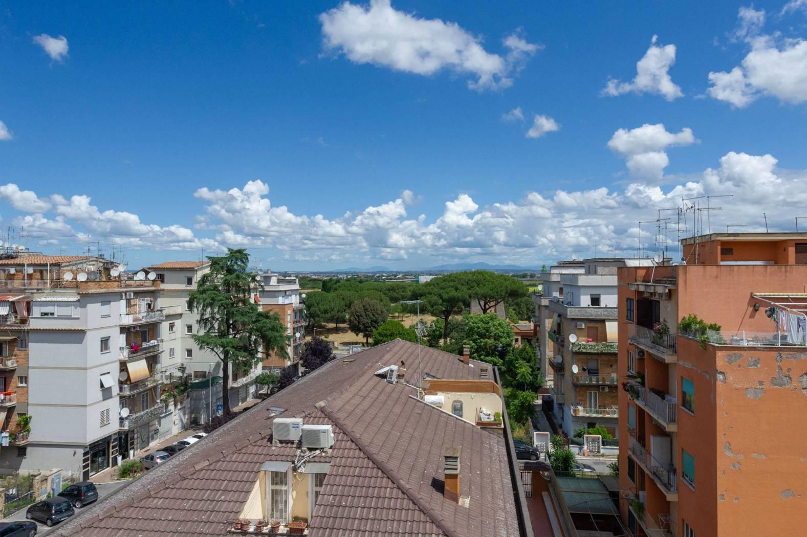 Disponiamo della vendita di un luminoso Attico sito in Largo Dei Colombi, posto al IV piano, di 103 mq catastali con affaccio e vista libera. L'immobile di recente ristrutturazione è composto da: ingresso/disimpegno con armadio a muro, salone con accesso al terrazzo vivibile di circa 30mq, cucina, studio, due camere con affaccio sul balcone, grande bagno finestrato.