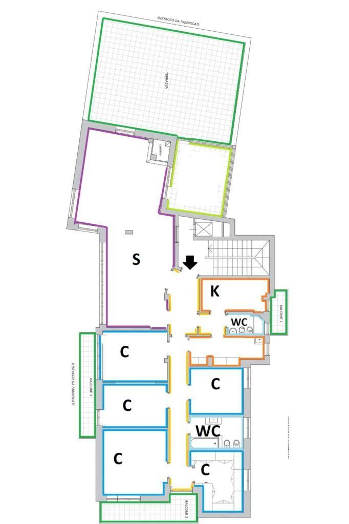L'ampia superficie (circa 220 mq commerciali) è così distribuita: ingresso, salone doppio con camino, quattro camere da letto, stanza guardaroba, cucina abitabile, doppi servizi, dispensa, tre balconi, ampio terrazzo a livello di oltre 60 mq.