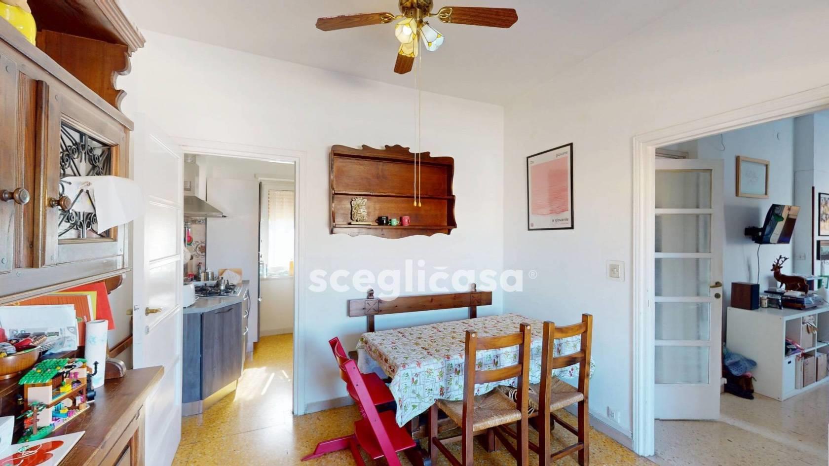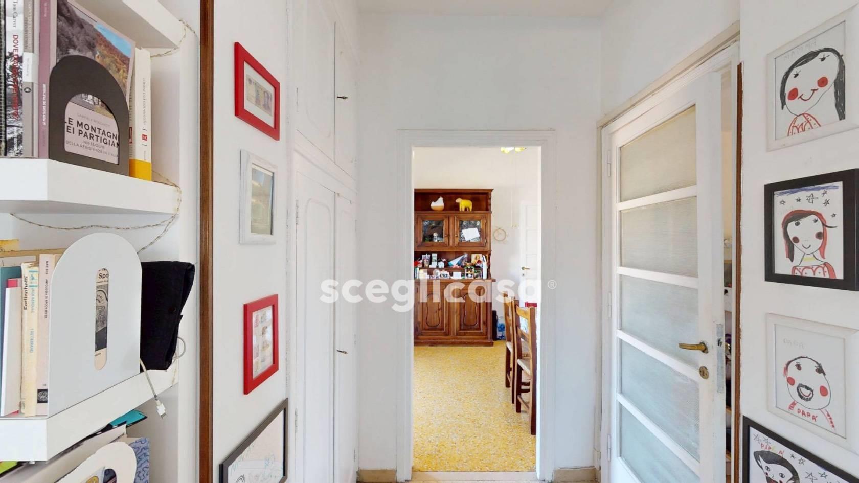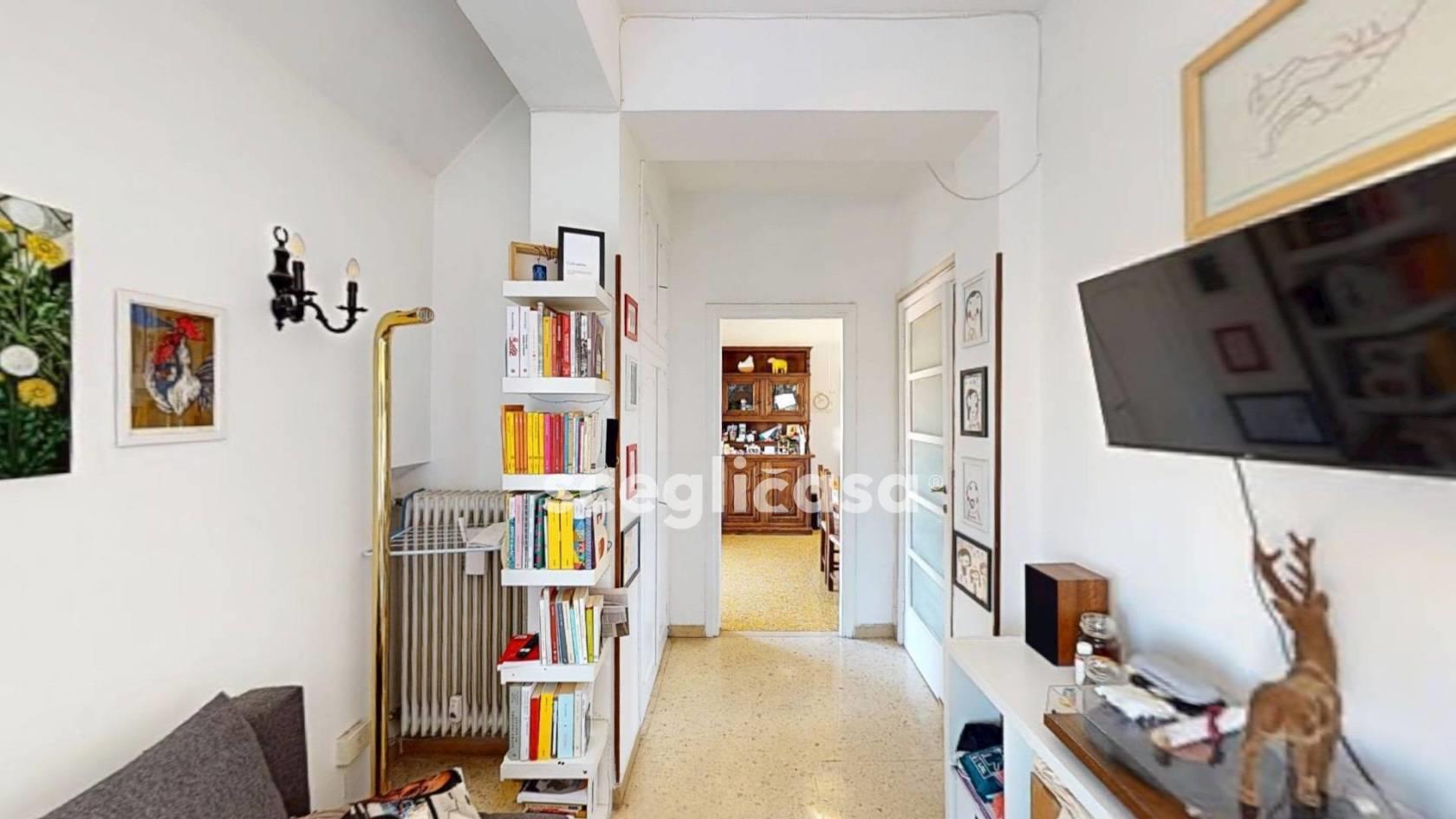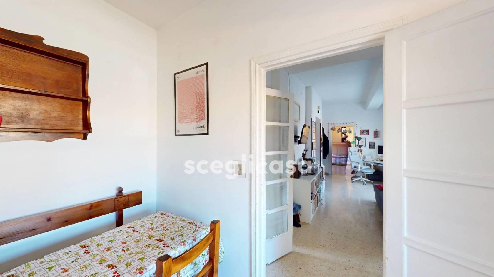 L’ingresso è sul soggiorno centrale, sviluppato in lunghezza, fulcro della casa da interpretare con soluzioni d’arredo su misura. Da un lato si accede alla camera da letto, luminosa e con uscita sulla terrazza; dall’altro un disimpegno con armadio a muro e ampio bagno finestrato con vasca. Proseguendo la zona giorno ampia e articolata, con sala da pranzo collegata alla cucina separata, dotata di balcone sul cortile condominiale. La conformazione e le dimensioni della zona living consentono, se desiderato, di ricavare uno studio o di riorganizzare gli spazi in chiave più contemporanea, valorizzando la continuità tra interni ed esterni.