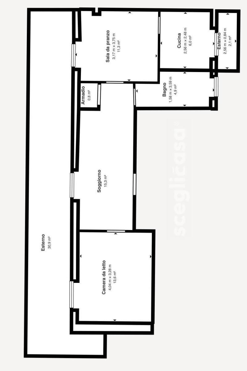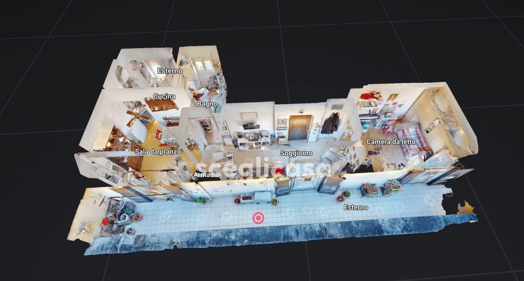 E' composto da 3 ambienti, servizi, armadi a muro, balcone e terrazza perimetrale di circa 30 mq,