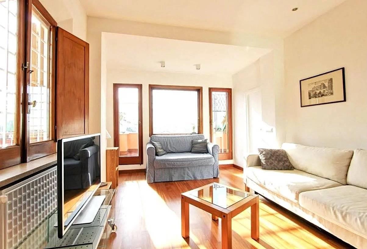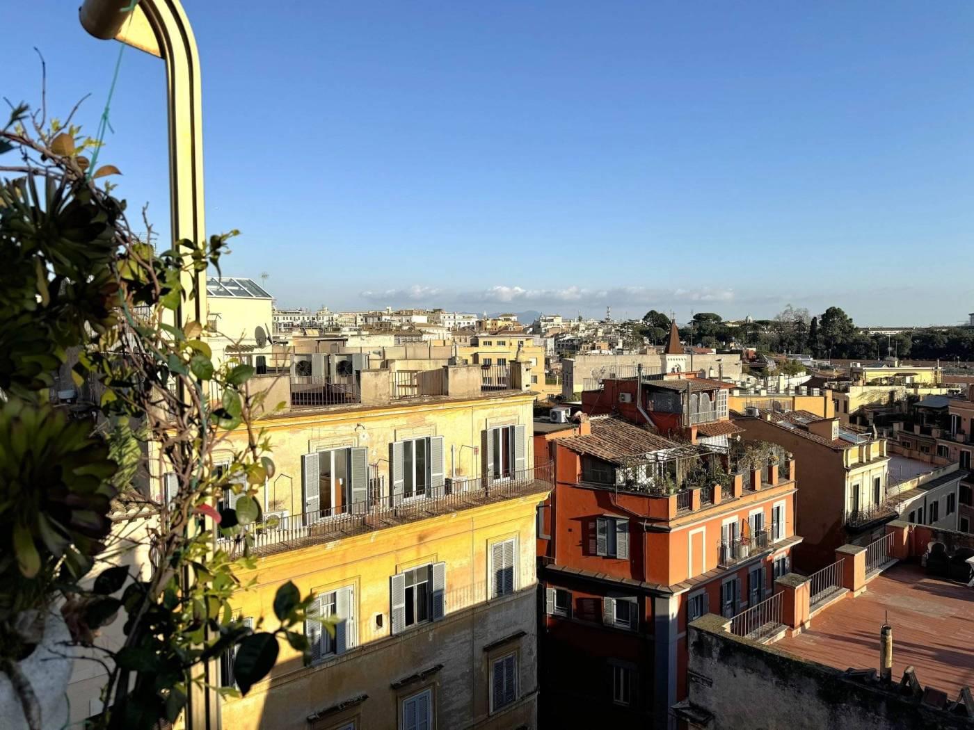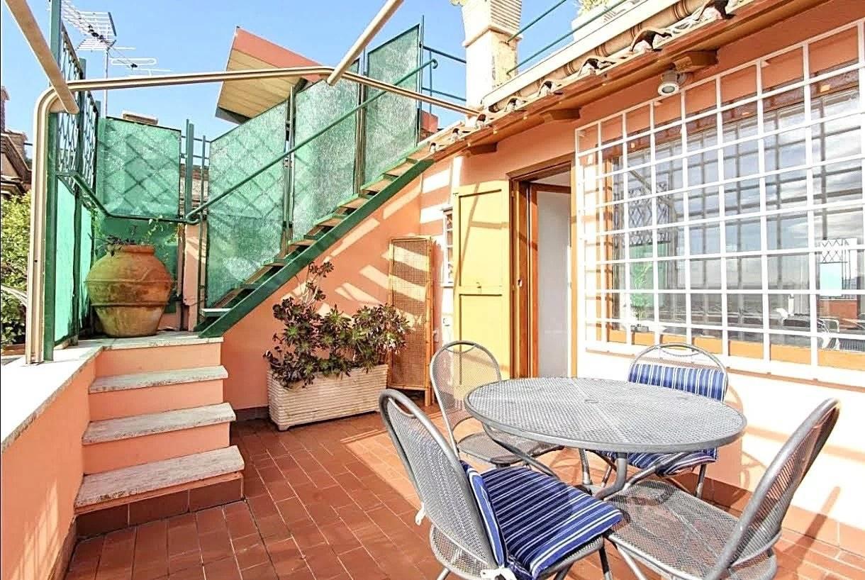 L'attico è un monolocale ben arredato, dotato di un letto matrimoniale, un angolo studio funzionale e due divani letto, ideali per accogliere ospiti. La cucina è completamente attrezzata e il bagno ha doppia finestra. Dal soggiorno, tramite una porta finestra si accede ad una prima terrazza a livello. Per raggiungere la grande terrazza panoramica, è presente una scala esterna, da cui poter ammirare una vista a 360 gradi su Roma..